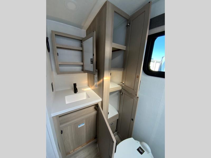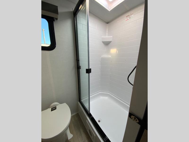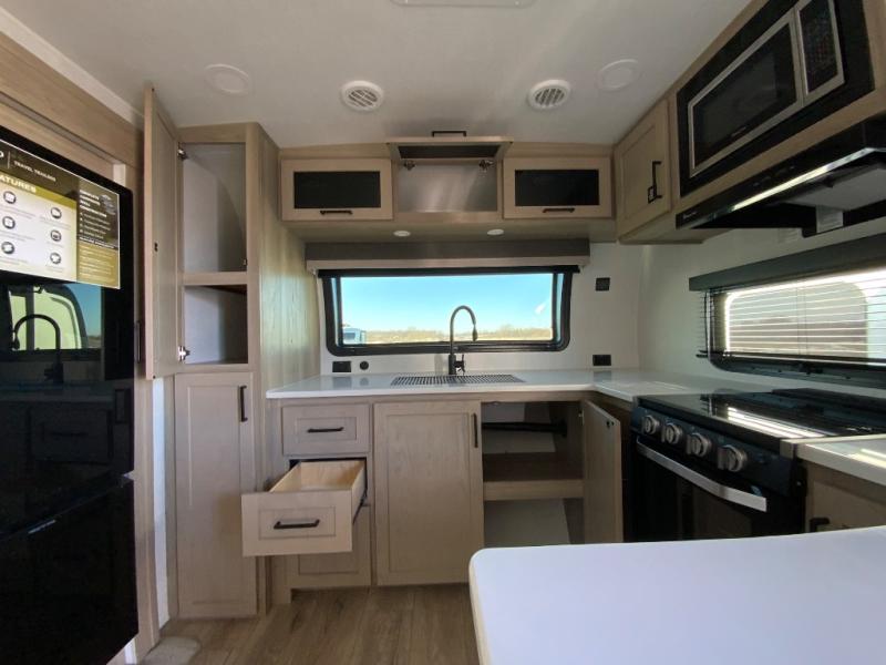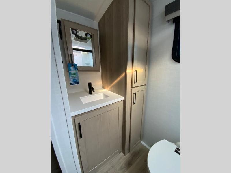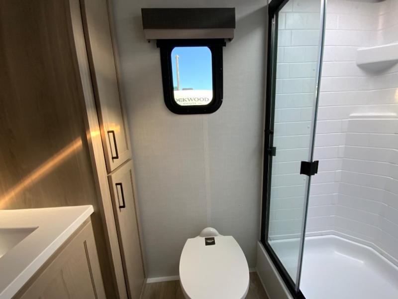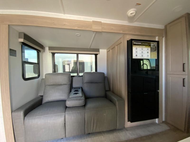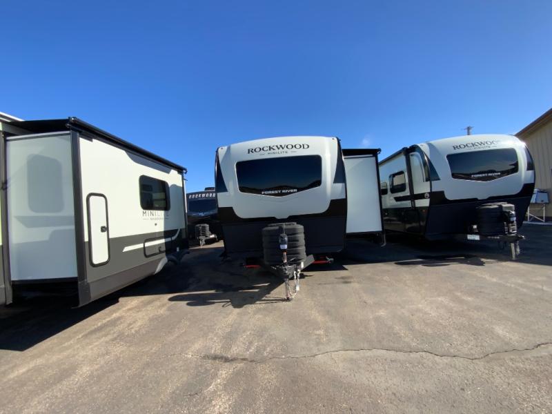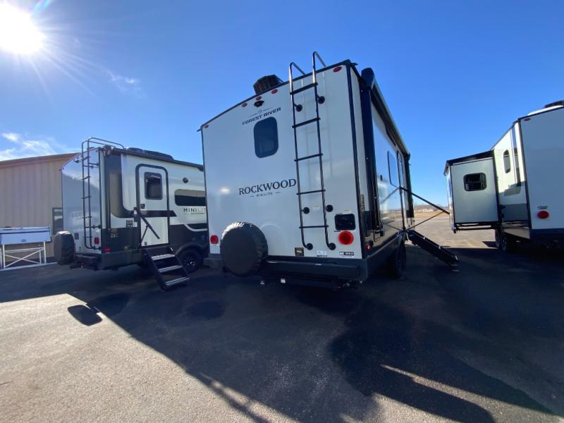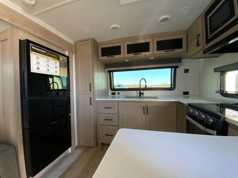 Each Rockwood Mini Lite travel trailer by Forest River is constructed with a fully laminated one-piece walkable roof, sleek frameless windows, and a six-sided full aluminum frame for strength and durability. The 12V thermostatically controlled heated tanks, plus radiant foil in the underbelly will allow you to camp well into the colder months, and the 200W roof solar panel will be perfect for a little off-gridding. Each model includes solid surface kitchen countertops, hidden hinge cabinet doors, roller shades, plus many more interior features. Having an AIR 360+ omnidirectional antenna with WiFi prep on board gives you the option to get some work done if it's needed, and the power tongue jack provides hassle-free set up, so you can enjoy more time relaxing!