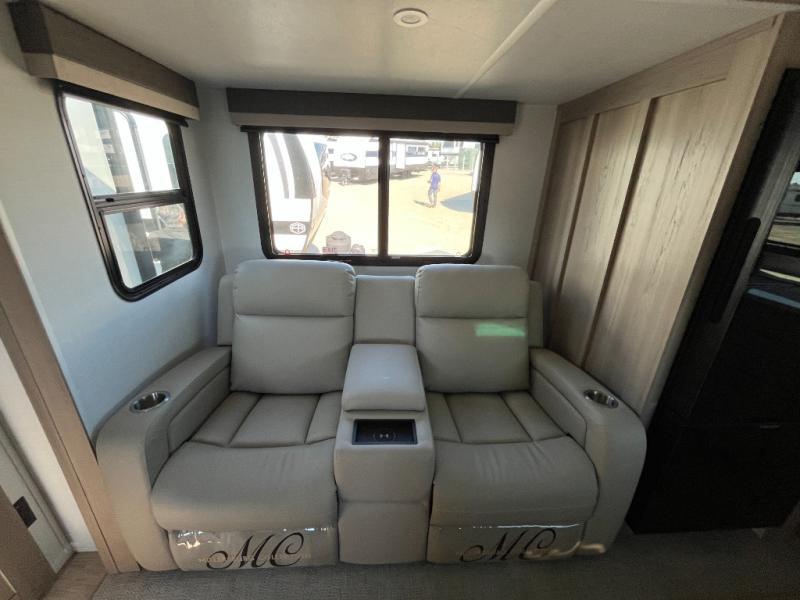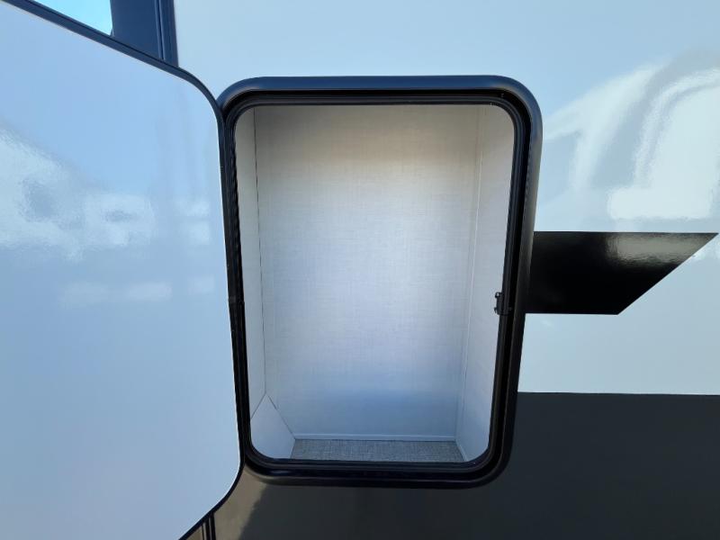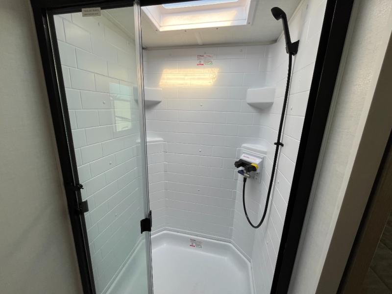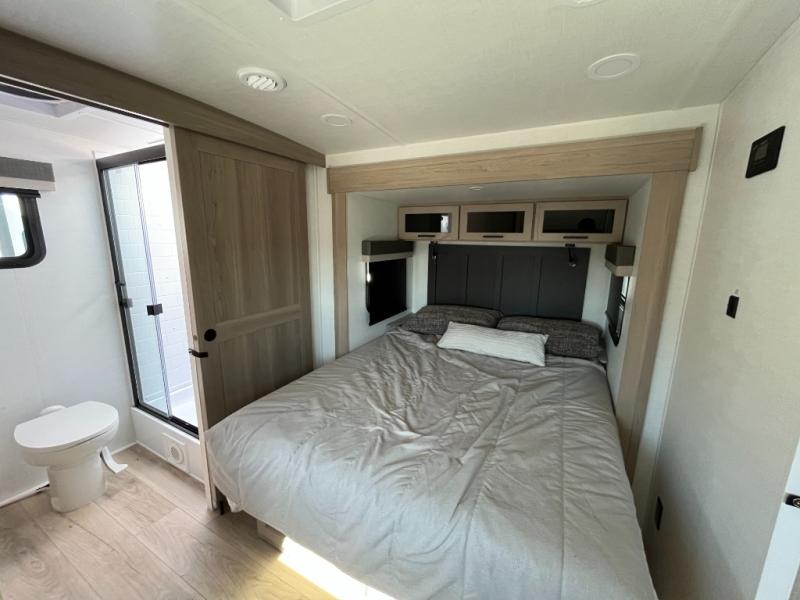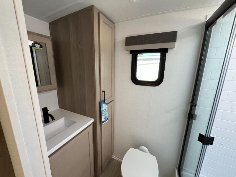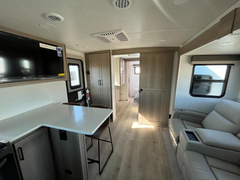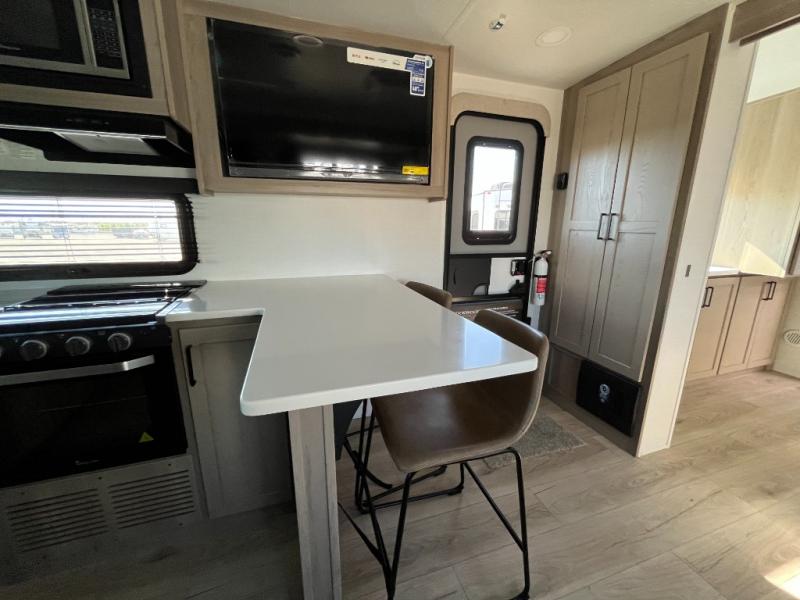This travel trailer is the best option for you and your partner! The lavish full rear bathroom features a spacious layout and a convenient linen closet, perfect for relaxation and refreshment. The elegant bedroom boasts a plush queen bed, ample wardrobe space, and stylish dresser, creating a serene retreat. The spacious living room and kitchen combined area is the heart of the trailer, featuring plush theater seating for cozy movie nights, a generous closet for storing essentials, and a 12V Smart TV for entertainment on the go. Plus, the expansive countertop with chairs provides a perfect spot for gourmet meals or socializing, while the premium three-burner cooktop, kitchen pantry, and microwave make meal prep and cooking a true delight.