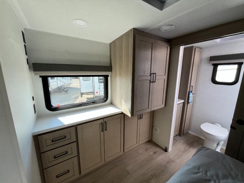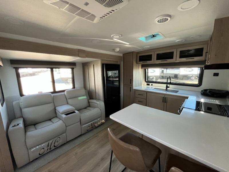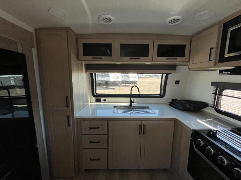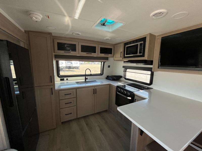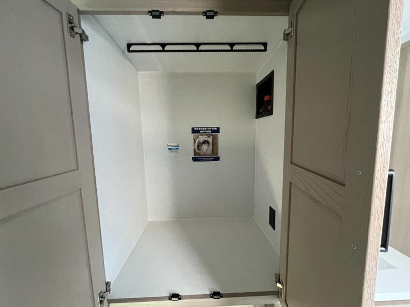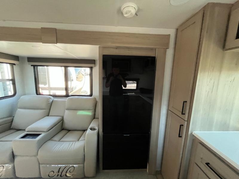 This travel trailer is the best option for you and your partner! The lavish full rear bathroom features a spacious layout and a convenient linen closet, perfect for relaxation and refreshment. The elegant bedroom boasts a plush queen bed, ample wardrobe space, and stylish dresser, creating a serene retreat. The spacious living room and kitchen combined area is the heart of the trailer, featuring plush theater seating for cozy movie nights, a generous closet for storing essentials, and a 12V Smart TV for entertainment on the go. Plus, the expansive countertop with chairs provides a perfect spot for gourmet meals or socializing, while the premium three-burner cooktop, kitchen pantry, and microwave make meal prep and cooking a true delight.