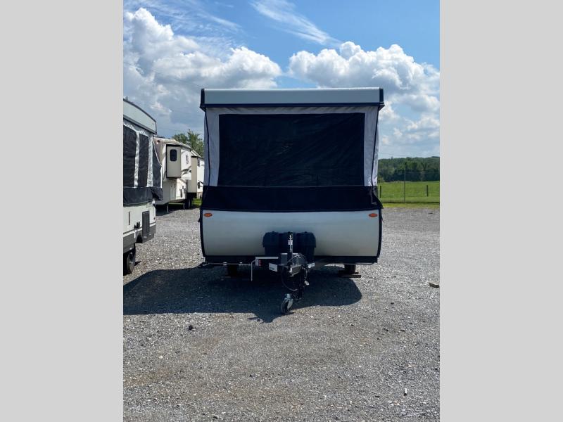 With any Rockwood OTG (Off The Ground) folding pop-up camper by Forest River, you will enjoy a more simple approach to outdoor fun. If you're a regular tent camper, but are looking for a little more comfort, then take a look at these easy-to-tow models! There are electric brakes, balancing bead filled tires, and leaf spring axles that provide that easy towing, and the alloy fiberglass exterior is durable. A one-piece screen door also comes standard so you can let fresh air in, while keeping bugs out, and the LED interior lights will be an added benefit you didn't have while tent camping. Each model also includes residential style cabinet doors, wood look flooring, and an Andover Sable wood interior for a more outdoorsy feel!