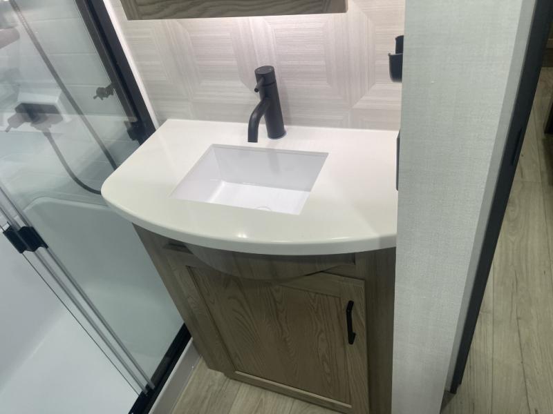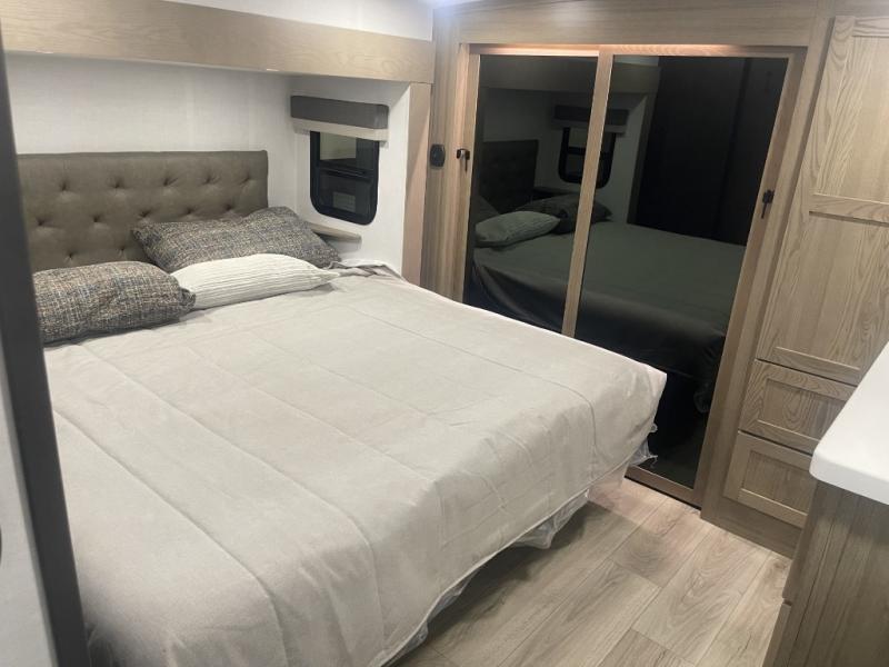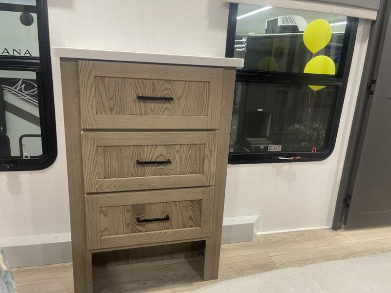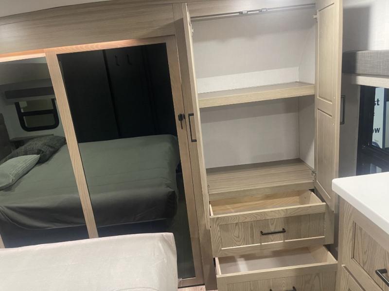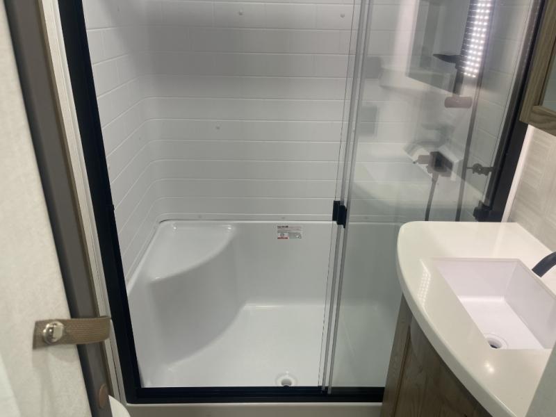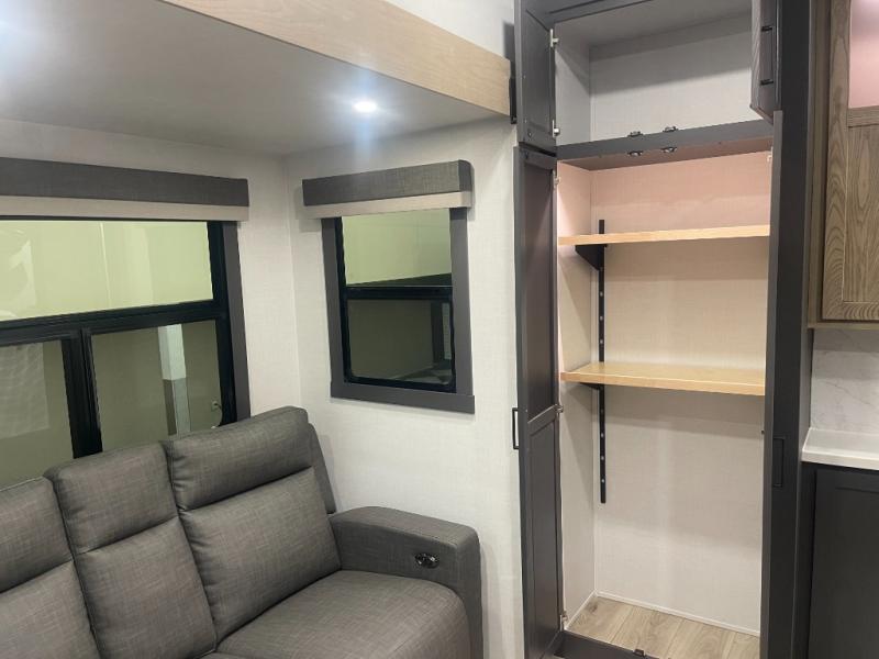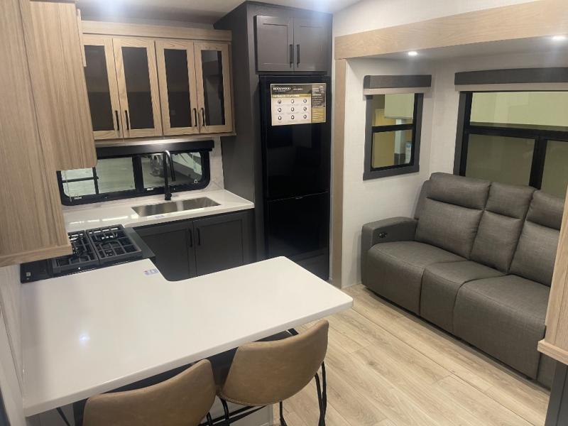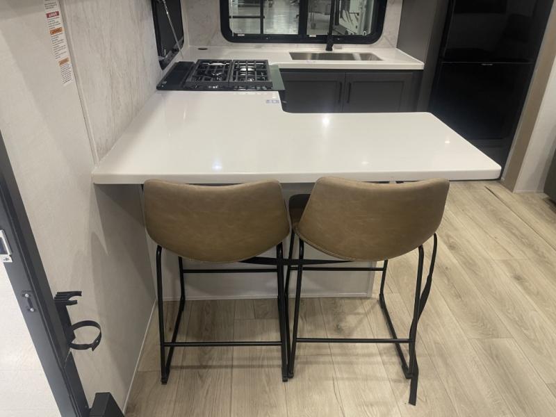 Looking for a spacious bedroom and bathroom for the perfect couple's RV with extra sleeping space for guests? This model provides a queen bed slide out for more interior floor space to get to the front wardrobe with shelves, and the dresser with a window beside it for great views of your campsite. The bathroom offers a shower with a seat, linen storage, and counter space for your toiletries. The main living and kitchen combined area has a hide-a-bed sofa slide that allows two guests to stay the night or you can choose the optional theater seat. There is also a breakfast bar with stools to dine at, and a U-shaped counter including appliances to make meals and store leftovers. And you will find exterior storage to bring along camping chairs and extra gear.
