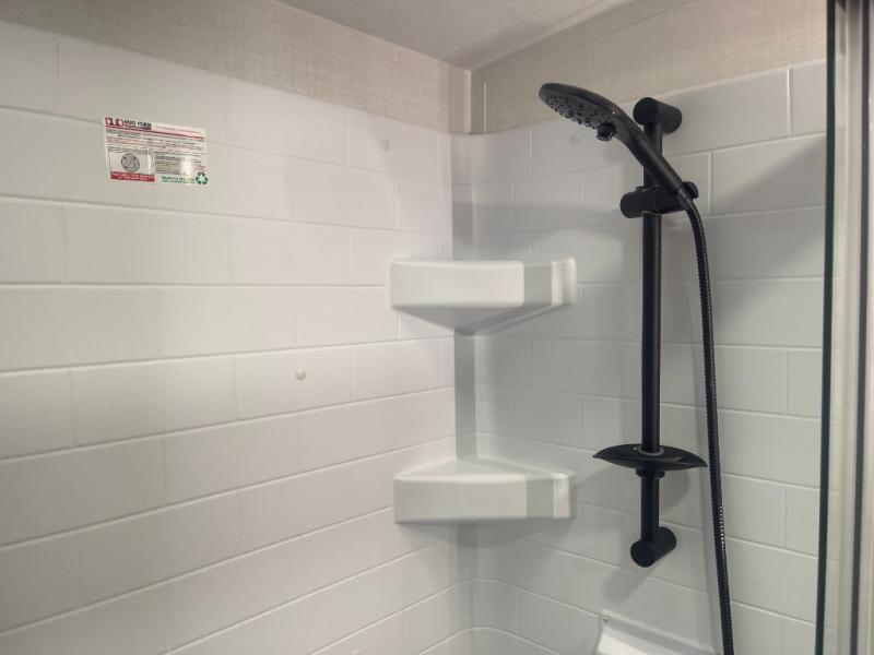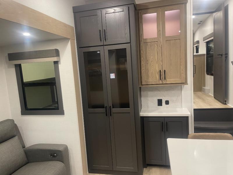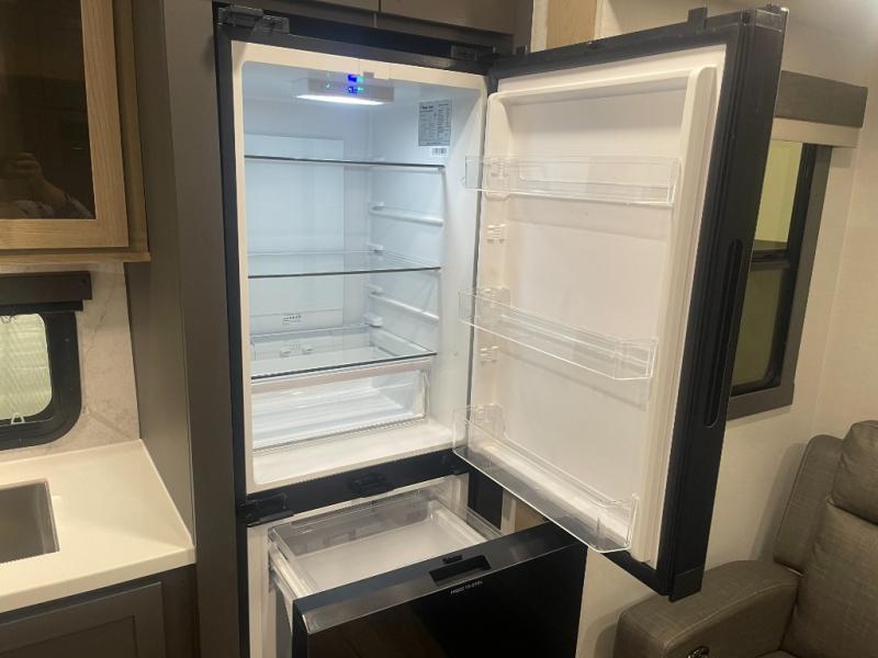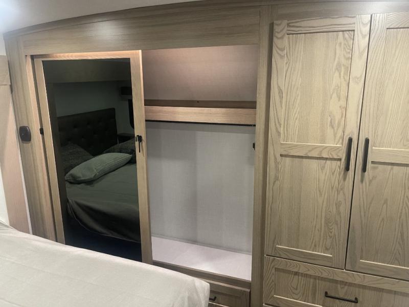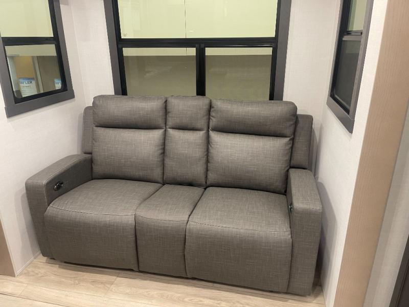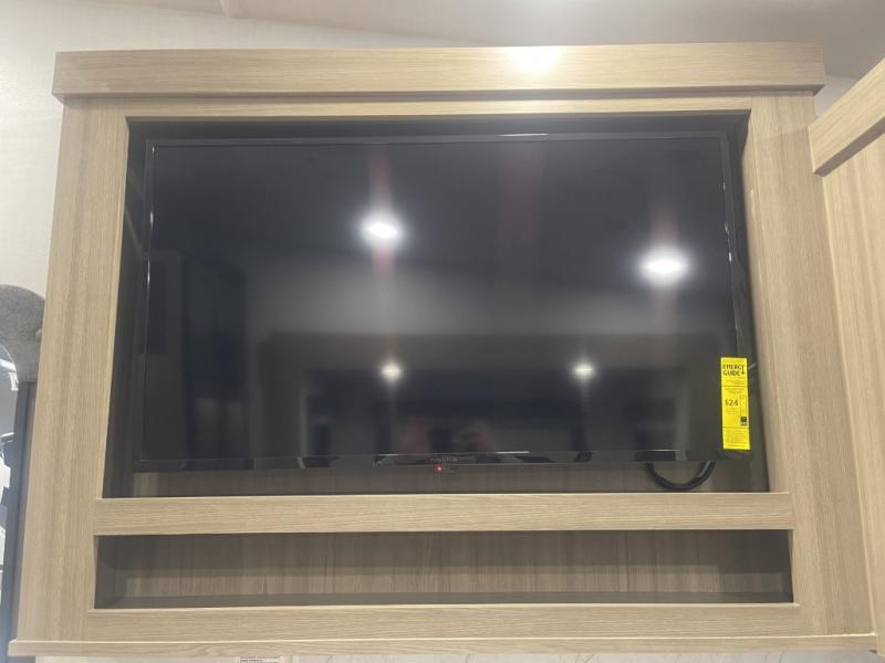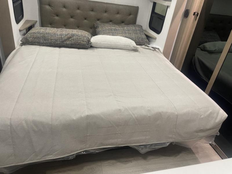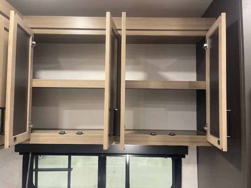 Looking for a spacious bedroom and bathroom for the perfect couple's RV with extra sleeping space for guests? This model provides a queen bed slide out for more interior floor space to get to the front wardrobe with shelves, and the dresser with a window beside it for great views of your campsite. The bathroom offers a shower with a seat, linen storage, and counter space for your toiletries. The main living and kitchen combined area has a hide-a-bed sofa slide that allows two guests to stay the night or you can choose the optional theater seat. There is also a breakfast bar with stools to dine at, and a U-shaped counter including appliances to make meals and store leftovers. And you will find exterior storage to bring along camping chairs and extra gear.