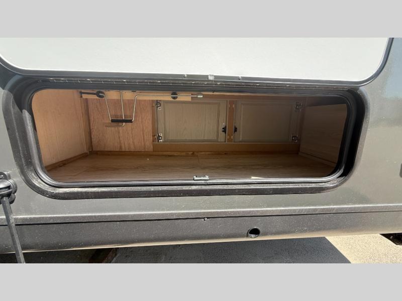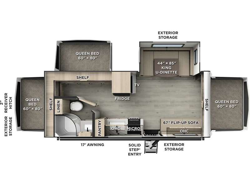 Your family will love this spacious travel trailer that can sleep up to nine people each night. There are triple queen tent end beds, a U-shaped dinette, plus a flip-up sofa for comfortable sleeping space. The chef of the group will have a 12V refrigerator and a pantry to store all the food. This model also includes convenient exterior storage for fishing poles, tackle boxes, and your luggage!