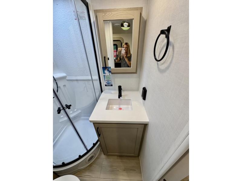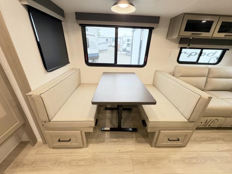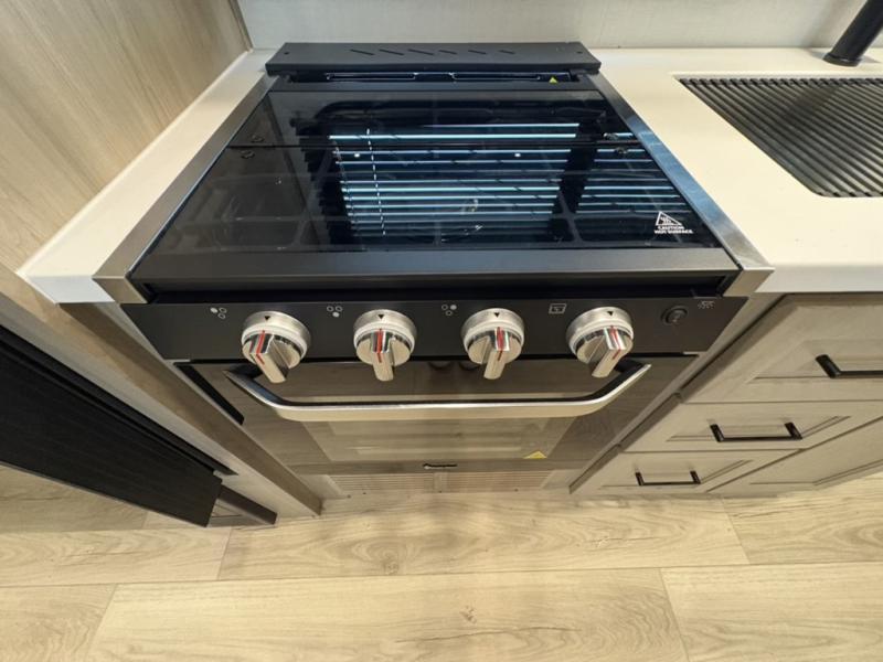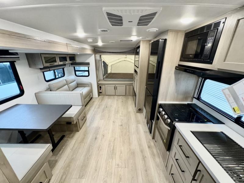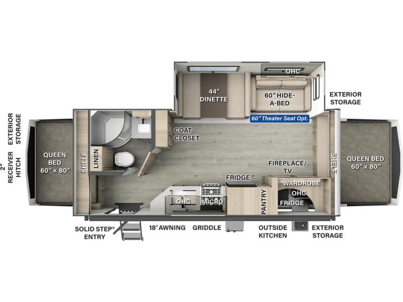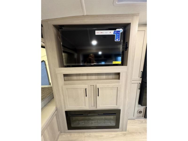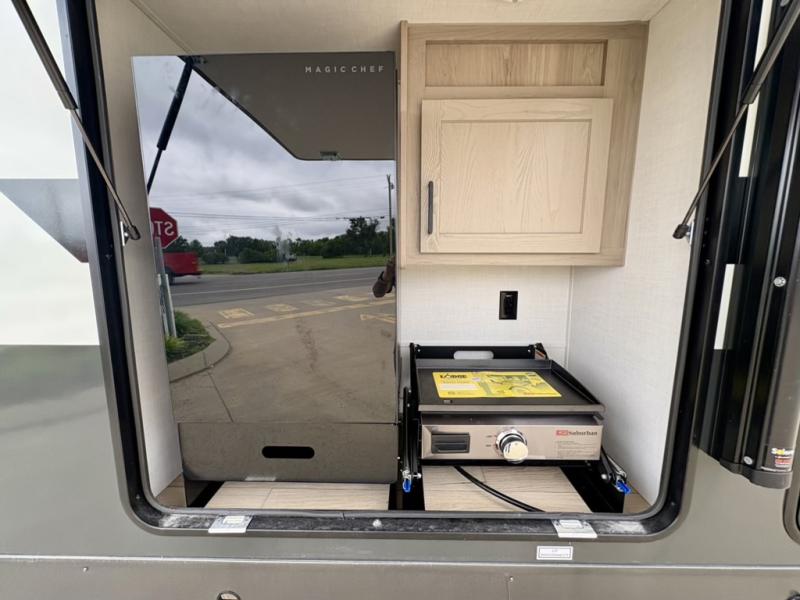 This expandable includes a large slide out that will make you feel right at home, so come take a look! The LED TV and fireplace is right across from the hide-a-bed sofa for easy viewing, and there is a booth dinette to dine together. The chef of the family can cook indoors on the three burner cooktop, or outdoors on the exterior griddle. Tuck your belongings in the overhead shelves, and snacks can go in the pantry. Don't forget about the exterior storage for your larger camp gear!