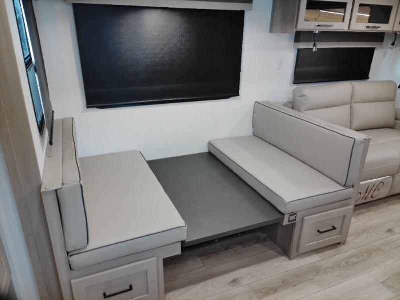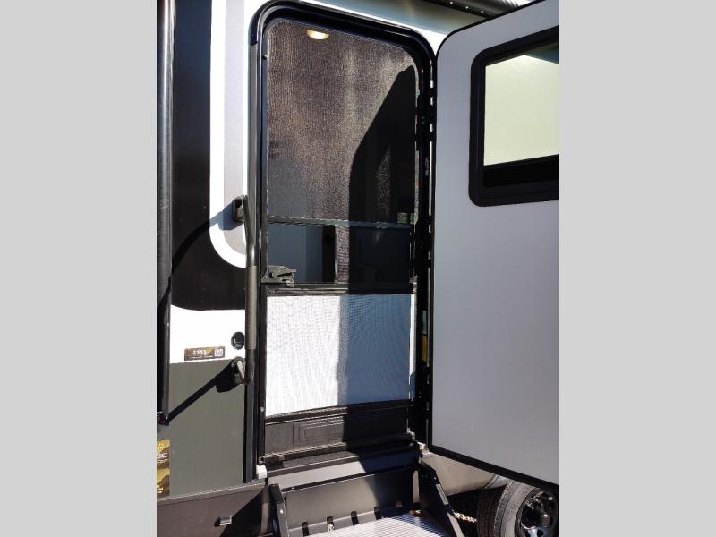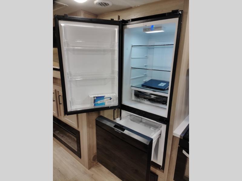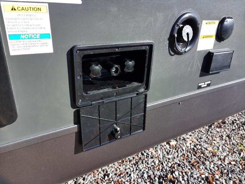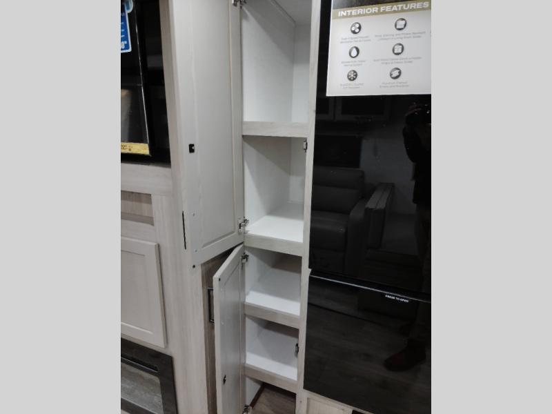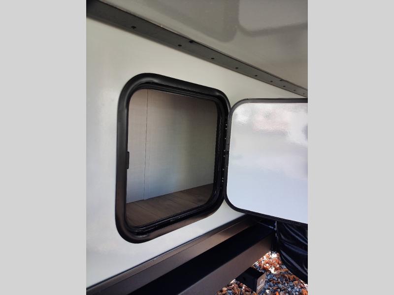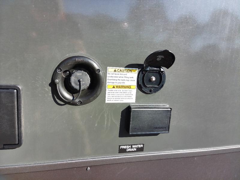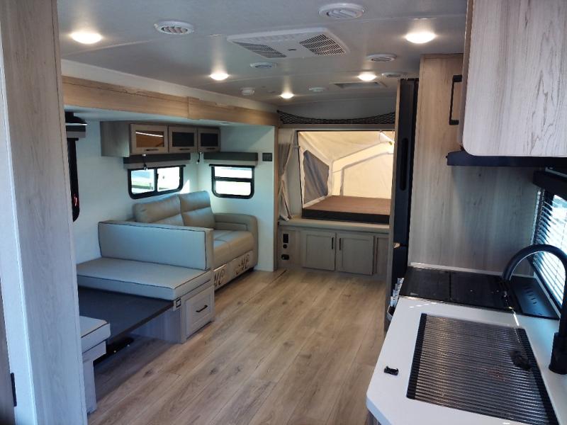 This expandable includes a large slide out that will make you feel right at home, so come take a look! The 12V smart TV and fireplace is right across from the hide-a-bed sofa for easy viewing, and there is a booth dinette to dine together. The chef of the family can cook indoors on the three burner cooktop, or outdoors at the outside kitchen with a pull-out griddle. Tuck your belongings in the overhead shelves, and snacks can go in the pantry. Don't forget about the exterior storage for your larger camp gear!