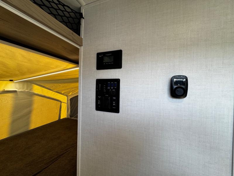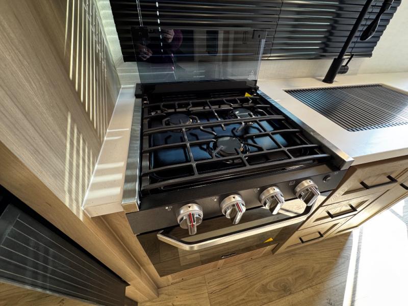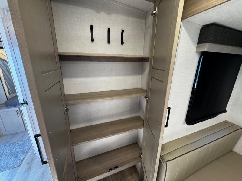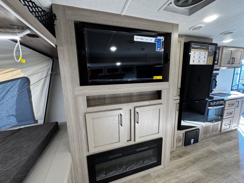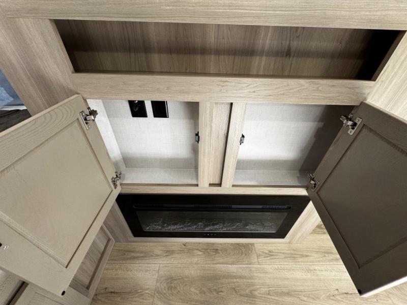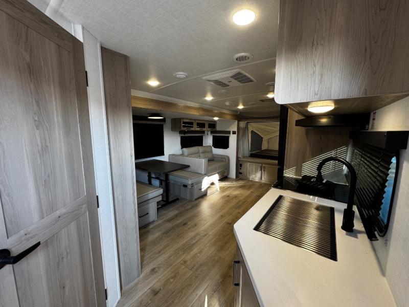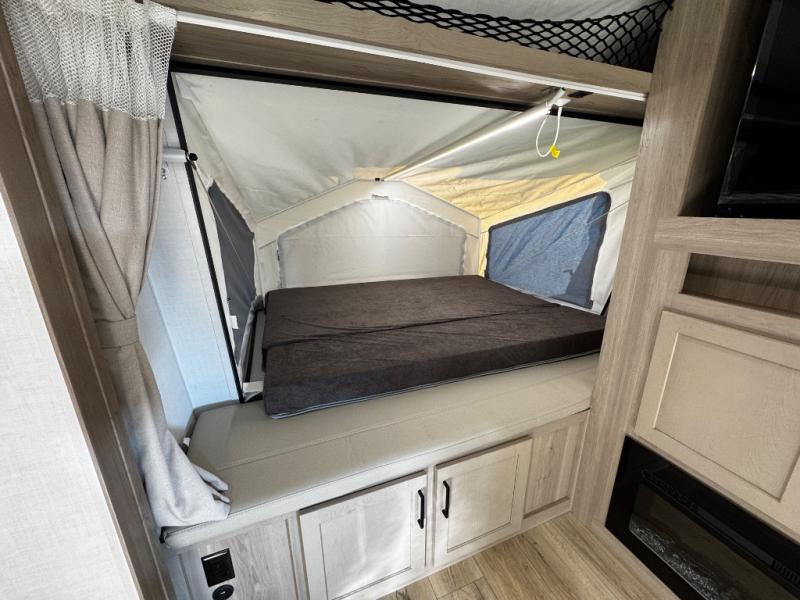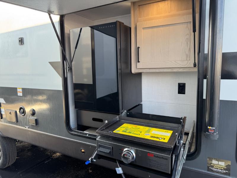 This expandable includes a large slide out that will make you feel right at home, so come take a look! The 12V smart TV and fireplace is right across from the hide-a-bed sofa for easy viewing, and there is a booth dinette to dine together. The chef of the family can cook indoors on the three burner cooktop, or outdoors at the outside kitchen with a pull-out griddle. Tuck your belongings in the overhead shelves, and snacks can go in the pantry. Don't forget about the exterior storage for your larger camp gear!
