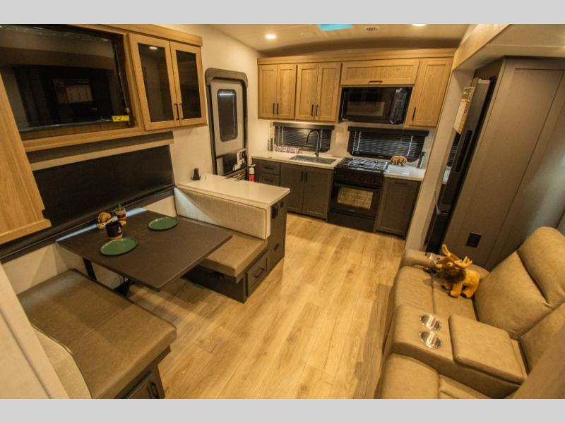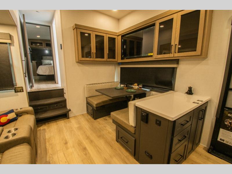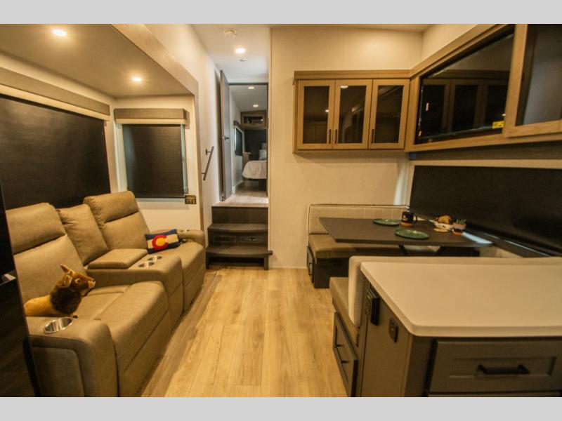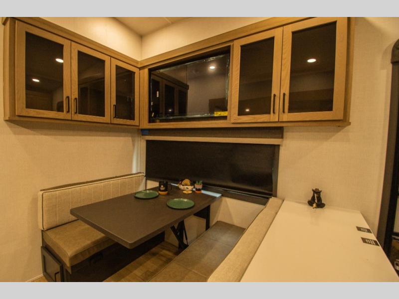 The main living area features a theater seat slide, opening up the interior and creating a comfortable place to relax. Across from it, the 44" booth dinette provides a dedicated space for meals, games, or working on the road, with overhead storage close by for everyday items.