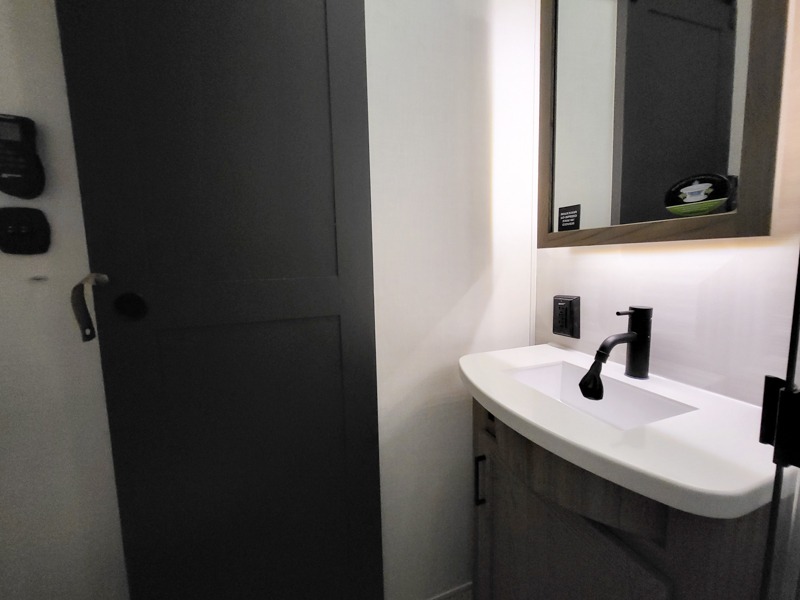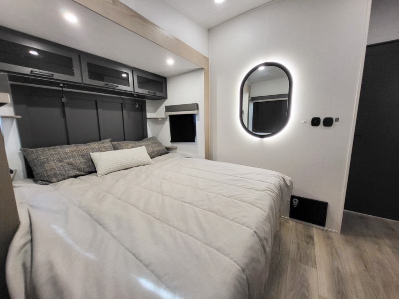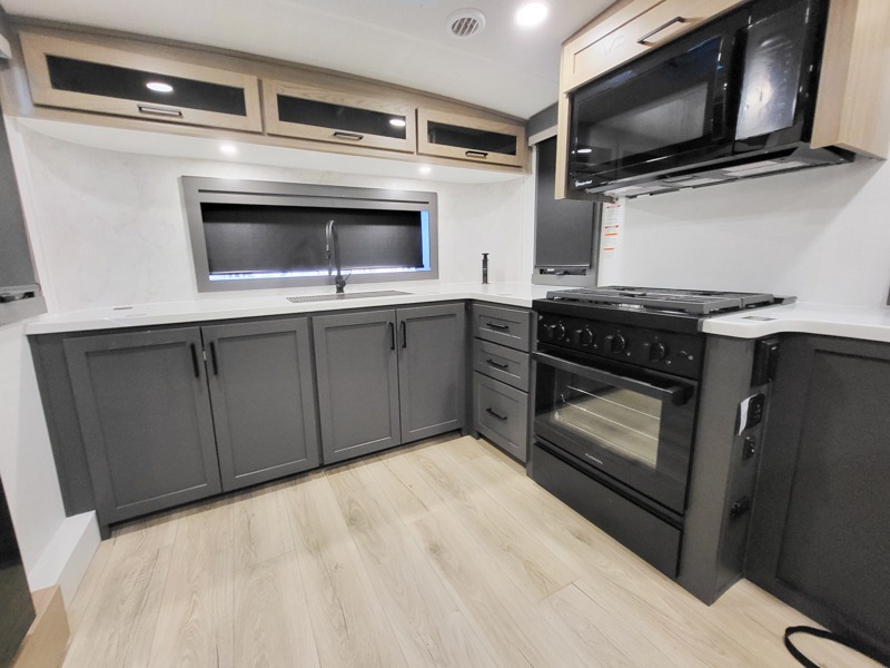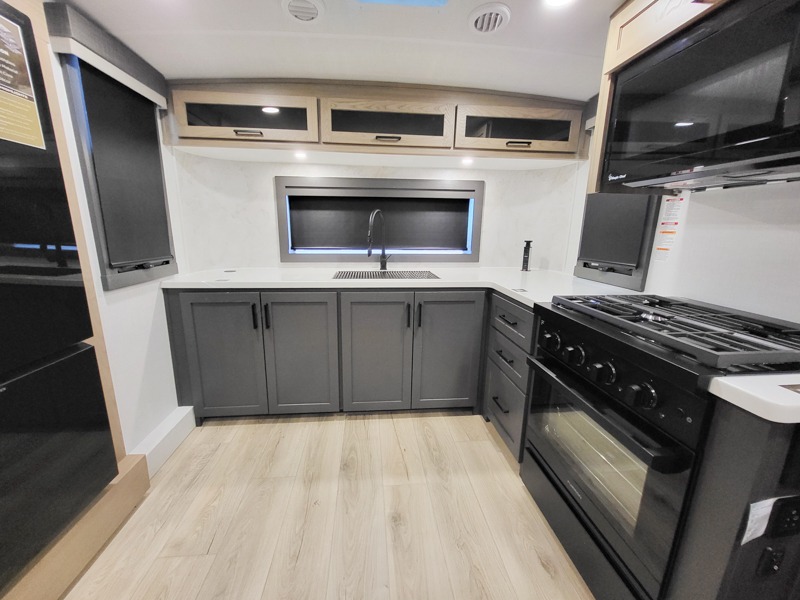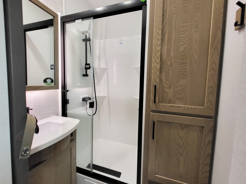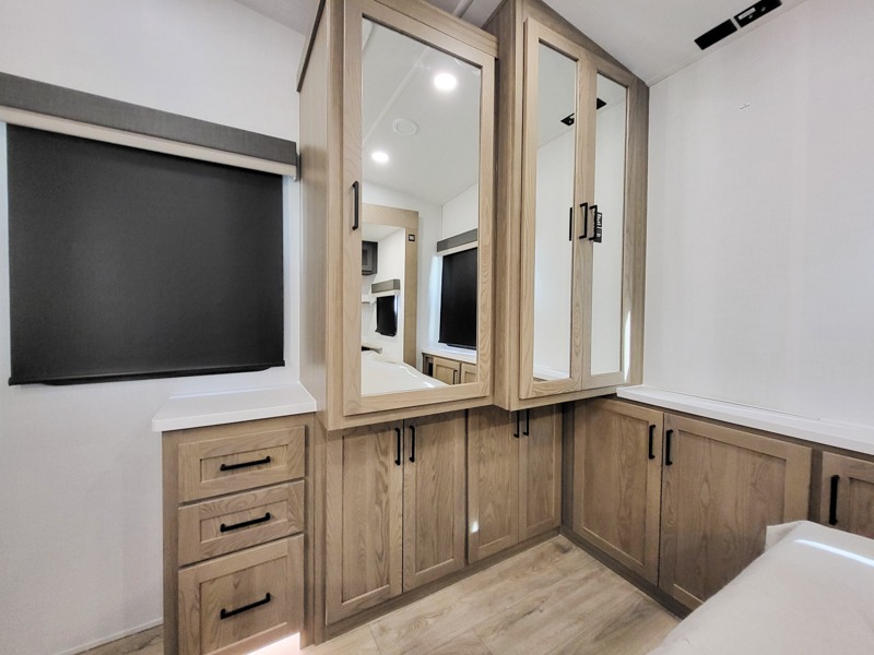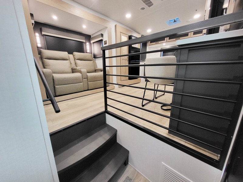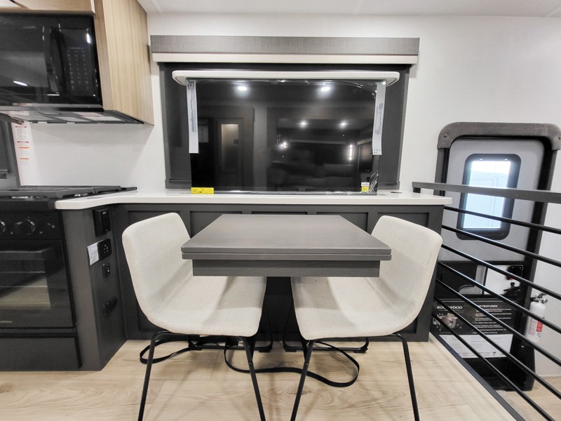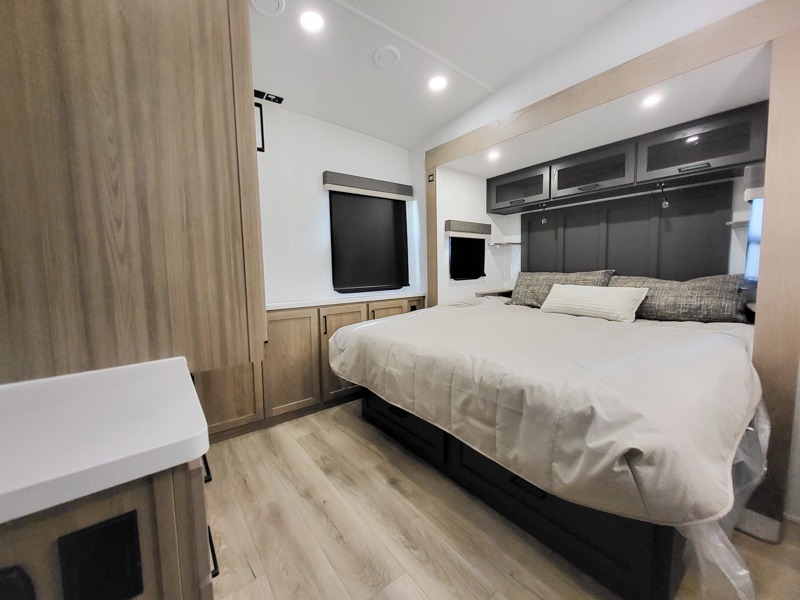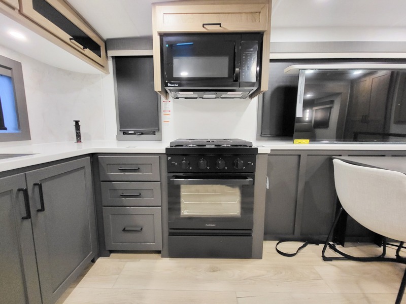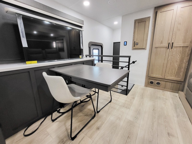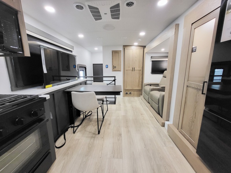 Premium amenities and a serene atmosphere make this fifth wheel your home away from home. The rear bedroom is a peaceful retreat, featuring a queen bed, spacious wardrobe, and a washer and dryer prep for added convenience. The full bathroom is a spa-like oasis, complete with a linen closet to keep your towels and toiletries organized. The theater seat is the perfect spot to relax and unwind, while the table & chairs with a leaf provide a comfortable space for meals and conversation. The televator TV is a sleek and modern touch, perfect for enjoying your favorite shows or movies. The pantry serves as a convenient storage space for your food and cooking essentials, while the fridge, microwave, and overhead cabinets provide ample space for meal preparation. The front countertop is the perfect spot to whip up a quick snack or breakfast.