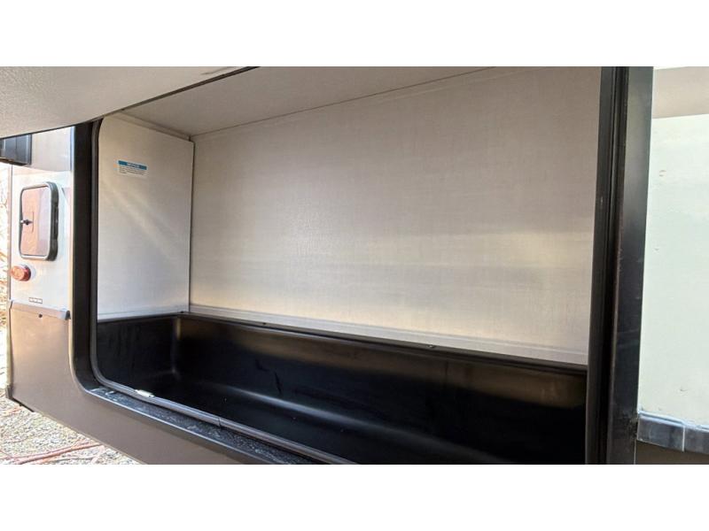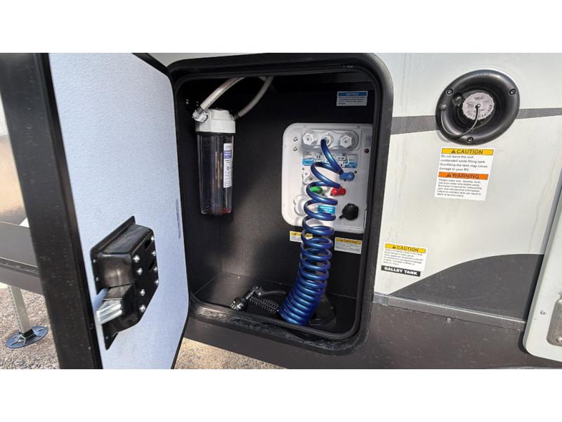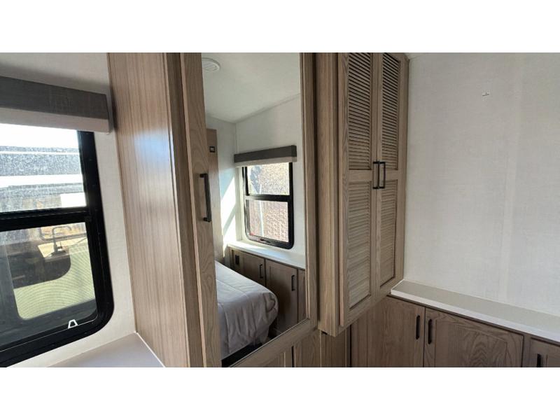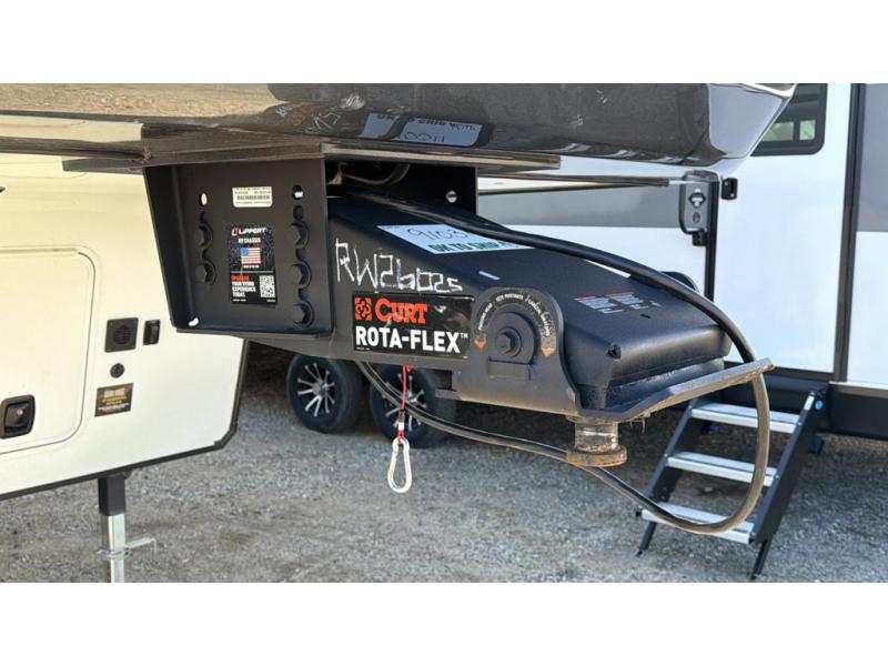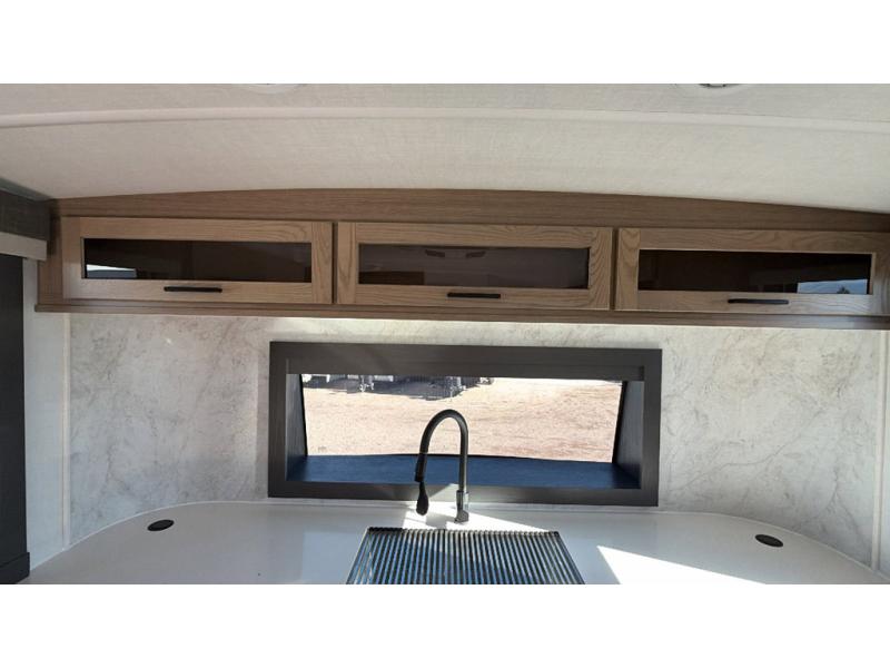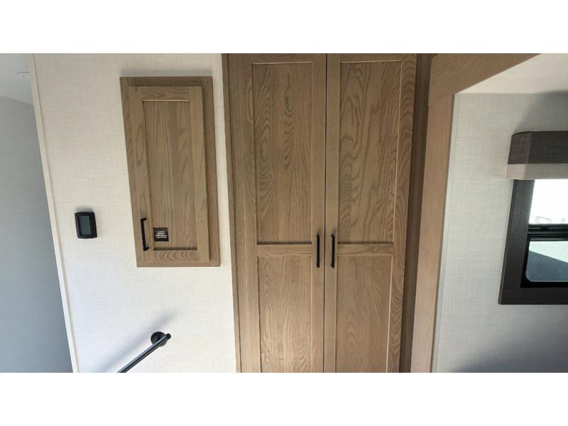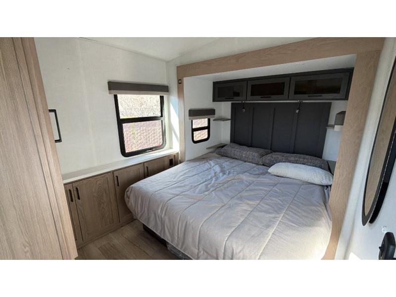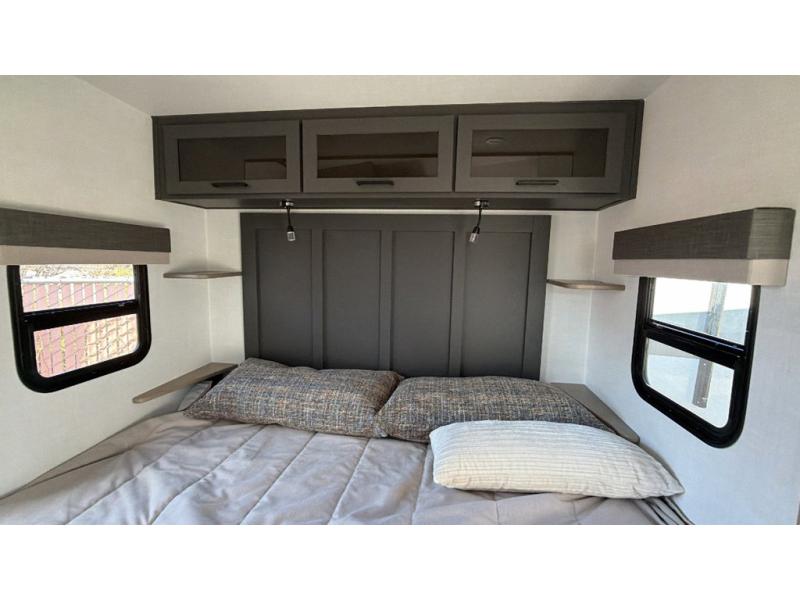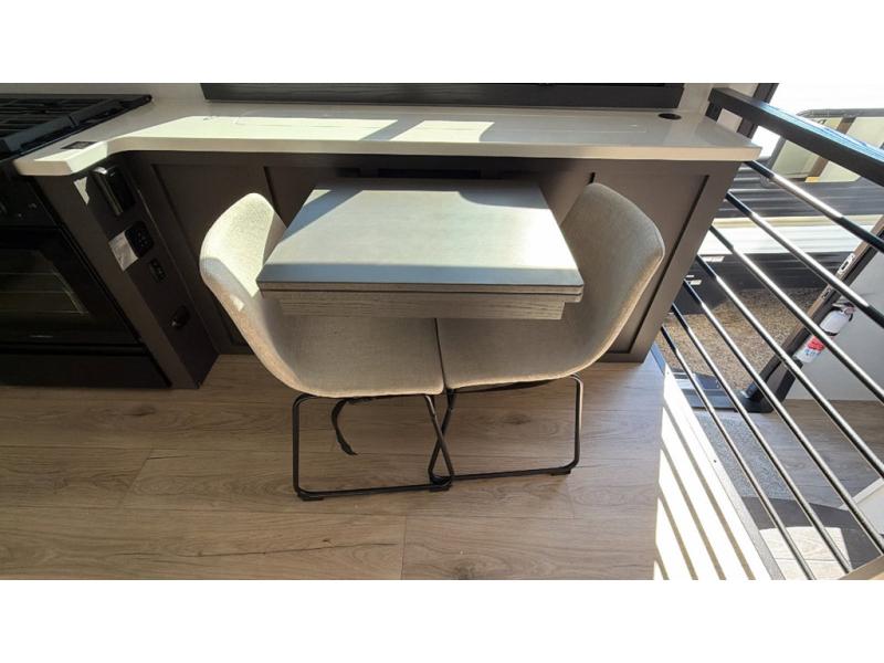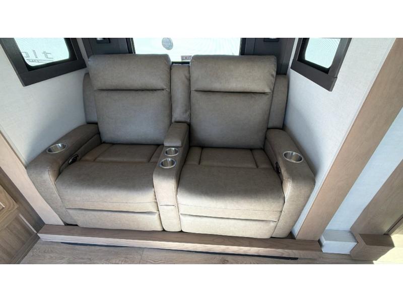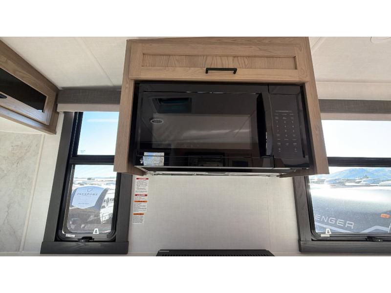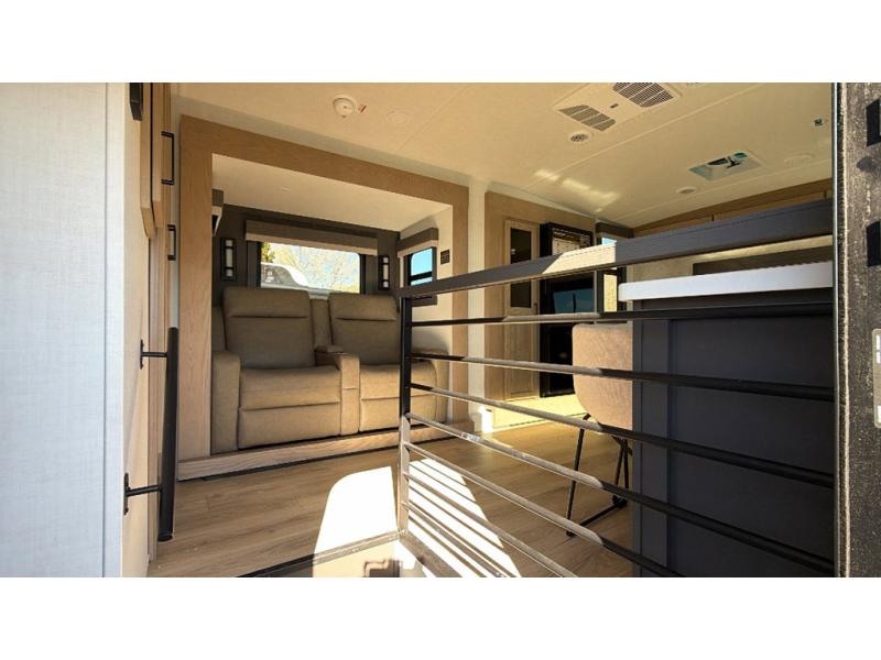 Premium amenities and a serene atmosphere make this fifth wheel your home away from home. The rear bedroom is a peaceful retreat, featuring a queen bed, spacious wardrobe, and a washer and dryer prep for added convenience. The full bathroom is a spa-like oasis, complete with a linen closet to keep your towels and toiletries organized. The theater seat is the perfect spot to relax and unwind, while the table & chairs with a leaf provide a comfortable space for meals and conversation. The televator TV is a sleek and modern touch, perfect for enjoying your favorite shows or movies. The pantry serves as a convenient storage space for your food and cooking essentials, while the fridge, microwave, and overhead cabinets provide ample space for meal preparation. The front countertop is the perfect spot to whip up a quick snack or breakfast.