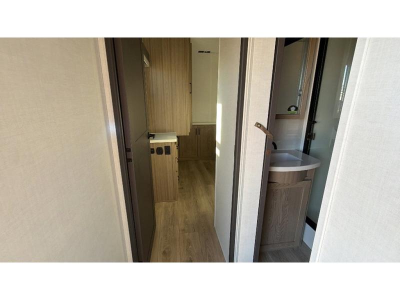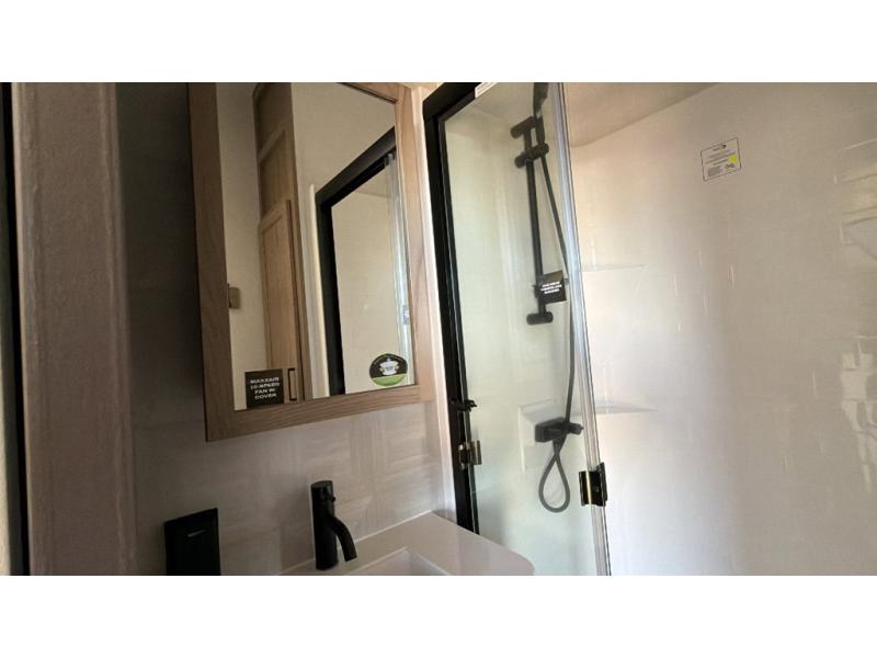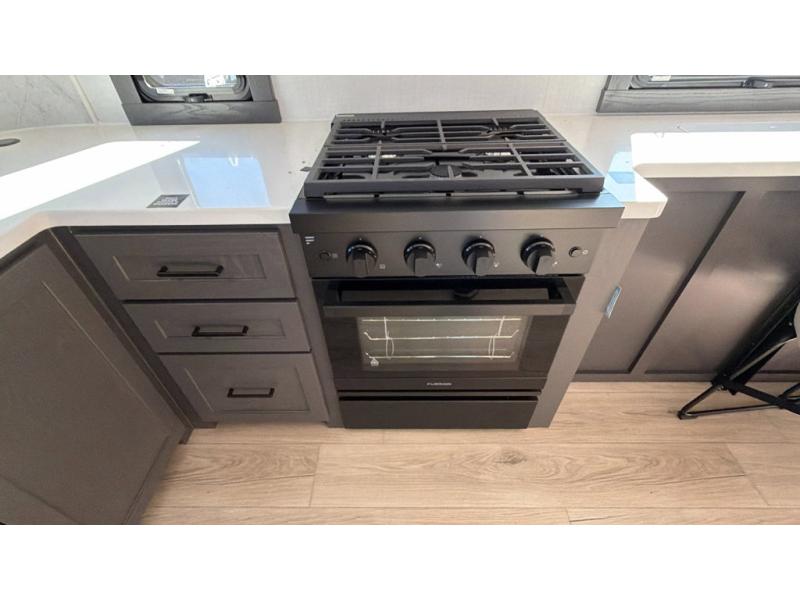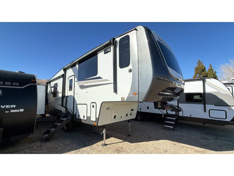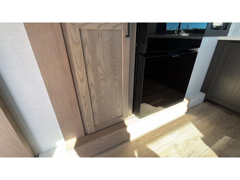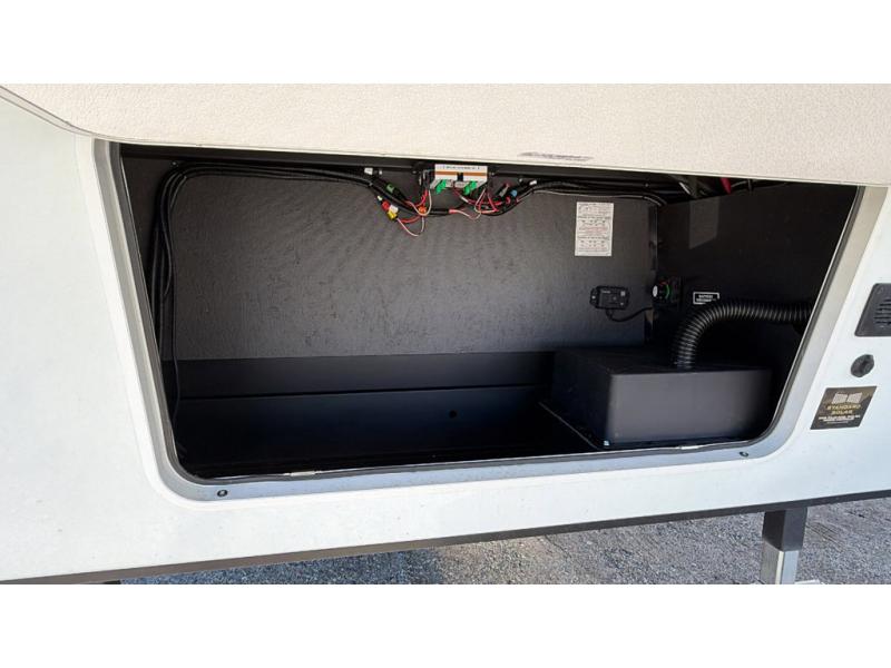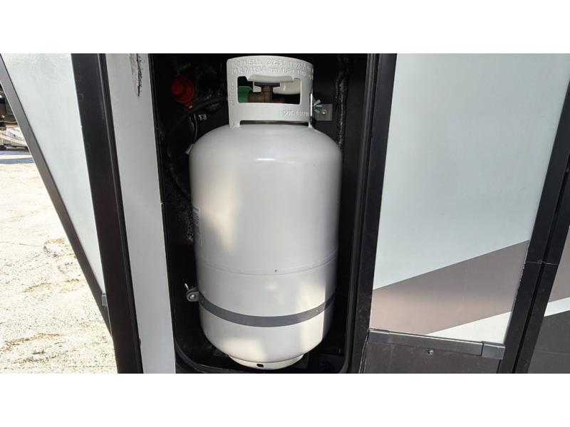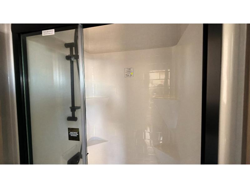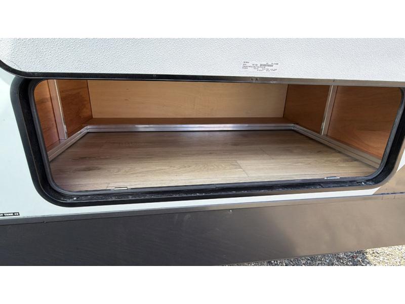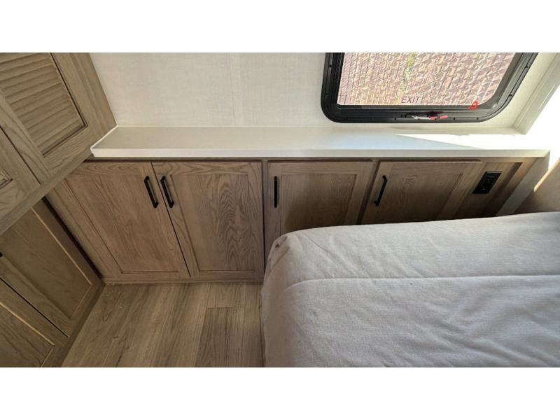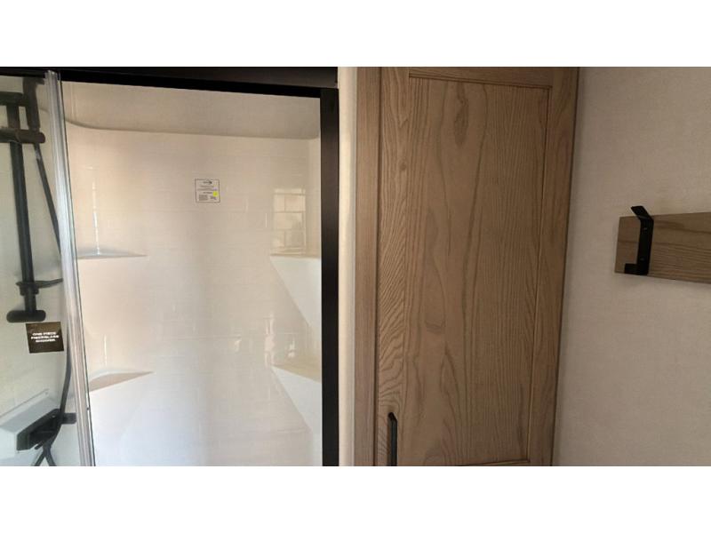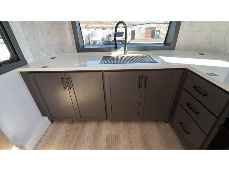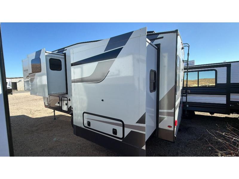 Premium amenities and a serene atmosphere make this fifth wheel your home away from home. The rear bedroom is a peaceful retreat, featuring a queen bed, spacious wardrobe, and a washer and dryer prep for added convenience. The full bathroom is a spa-like oasis, complete with a linen closet to keep your towels and toiletries organized. The theater seat is the perfect spot to relax and unwind, while the table & chairs with a leaf provide a comfortable space for meals and conversation. The televator TV is a sleek and modern touch, perfect for enjoying your favorite shows or movies. The pantry serves as a convenient storage space for your food and cooking essentials, while the fridge, microwave, and overhead cabinets provide ample space for meal preparation. The front countertop is the perfect spot to whip up a quick snack or breakfast.