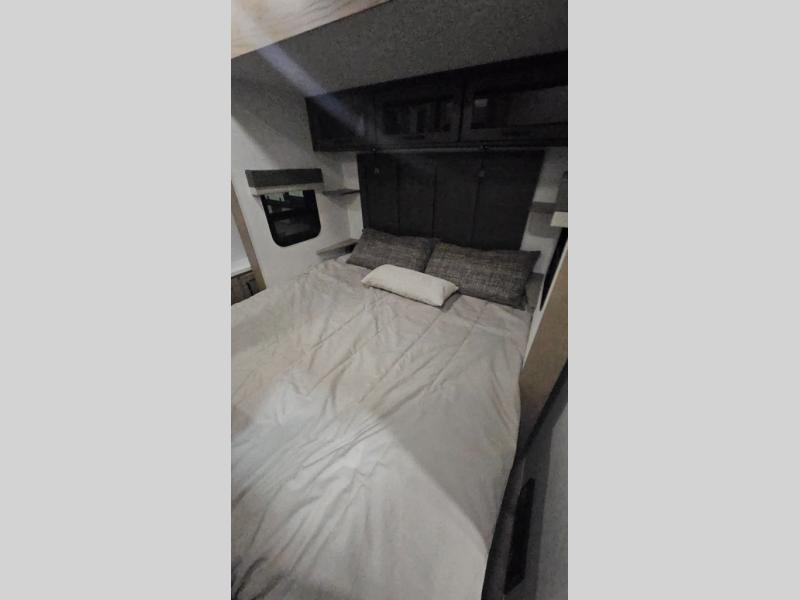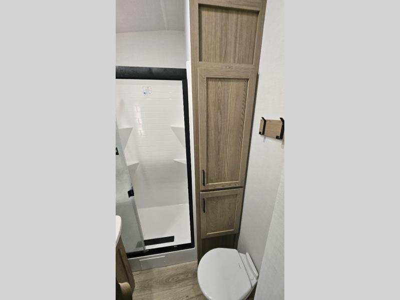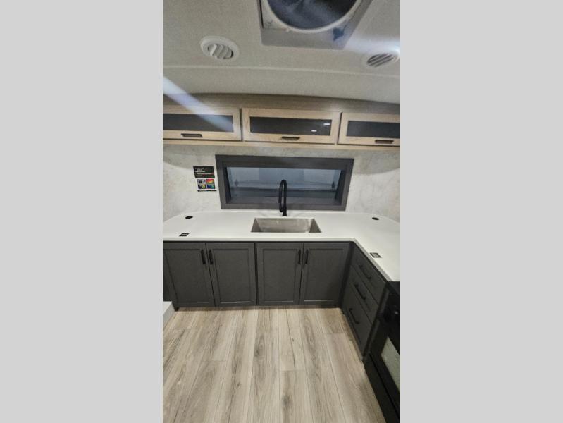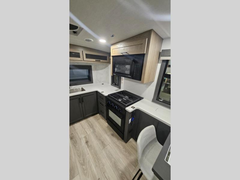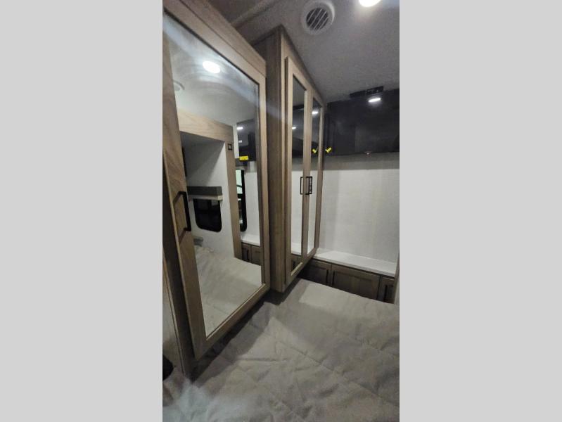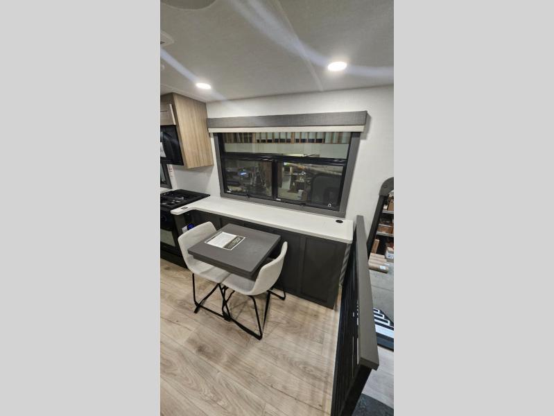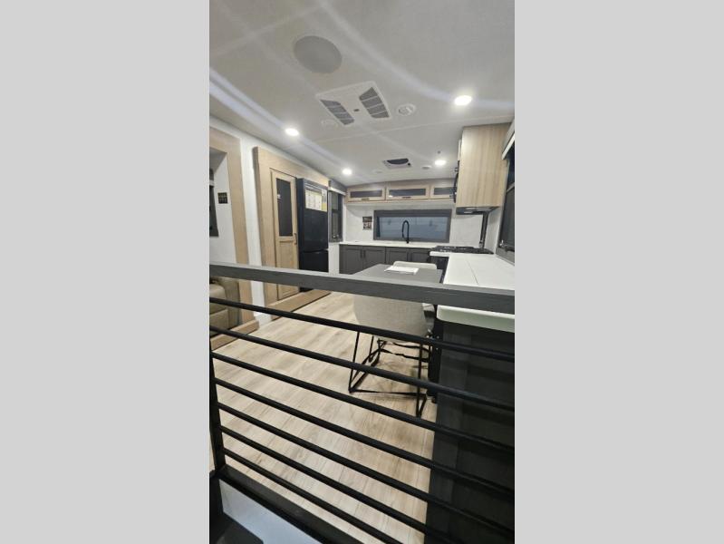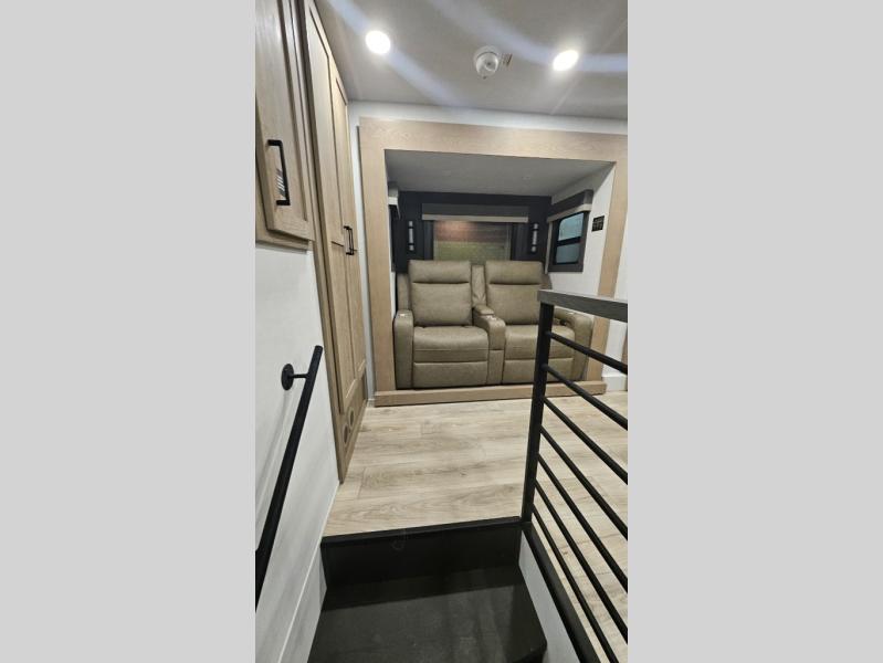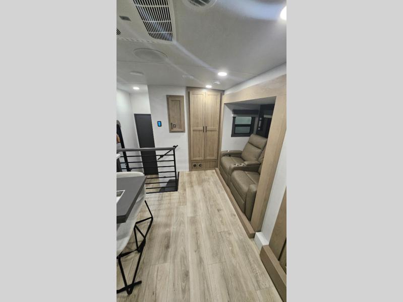 Premium amenities and a serene atmosphere make this fifth wheel your home away from home. The rear bedroom is a peaceful retreat, featuring a queen bed, spacious wardrobe, and a washer and dryer prep for added convenience. The full bathroom is a spa-like oasis, complete with a linen closet to keep your towels and toiletries organized. The theater seat is the perfect spot to relax and unwind, while the table & chairs with a leaf provide a comfortable space for meals and conversation. The televator TV is a sleek and modern touch, perfect for enjoying your favorite shows or movies. The pantry serves as a convenient storage space for your food and cooking essentials, while the fridge, microwave, and overhead cabinets provide ample space for meal preparation. The front countertop is the perfect spot to whip up a quick snack or breakfast.