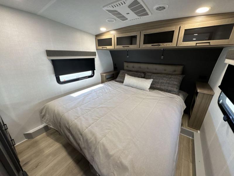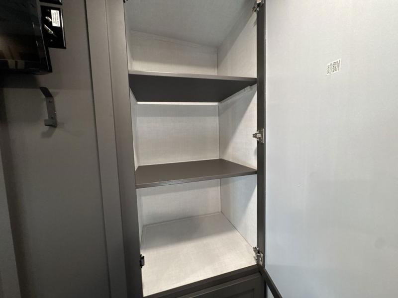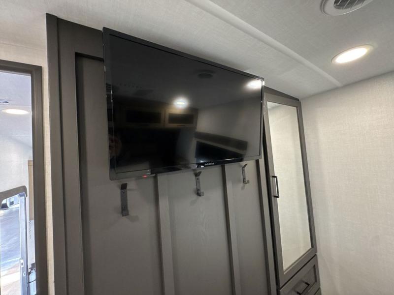 Why not have enough space for all your RVing friends to visit when you camp? This RV offers the perfect living and kitchen area with a large slide giving everyone more floor space, plus there is a king U-shaped dinette and a hide-a-bed sofa to sit on, a fireplace to enjoy and a Smart TV to watch a game or movie together. The cook will love the rear kitchen with extra counter space along a side wall to leave all the snacks and treats for everyone. You might even take everyone outside to enjoy the 21' power awning that offers an outdoor living area with some protection and LED lighting; just grab your camping chairs from the pass-through storage. At night, you can retire to the front bedroom with a queen bed, a spacious wardrobe, plus a TV option if you enjoy movies in bed!