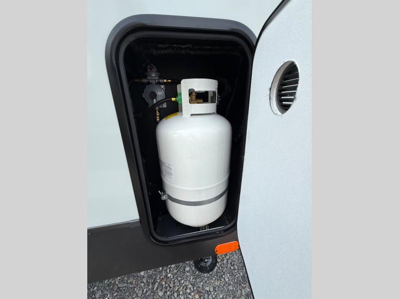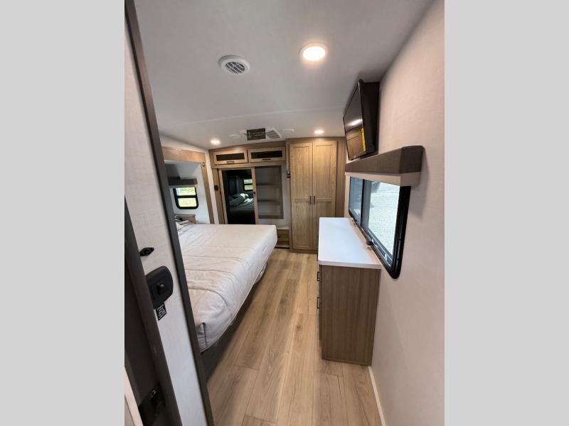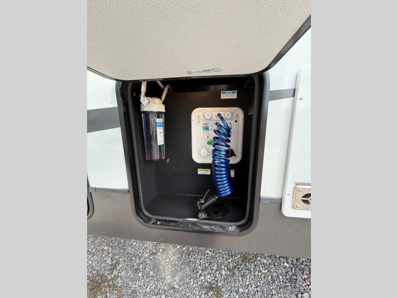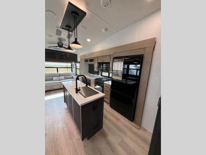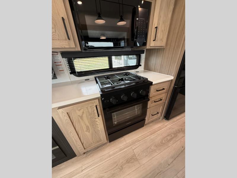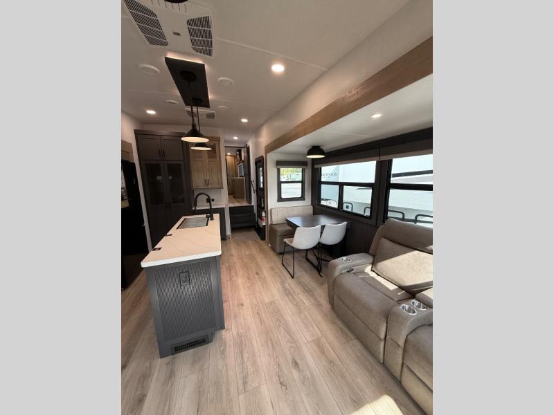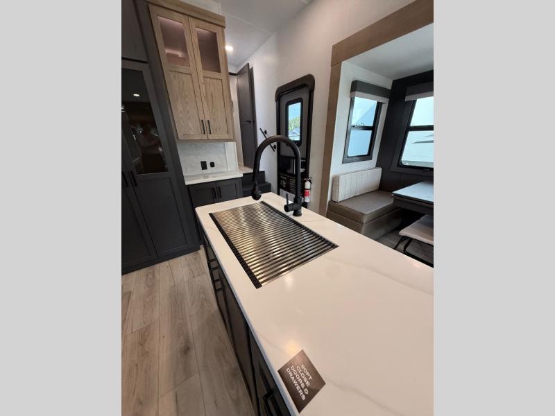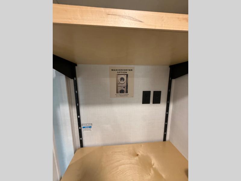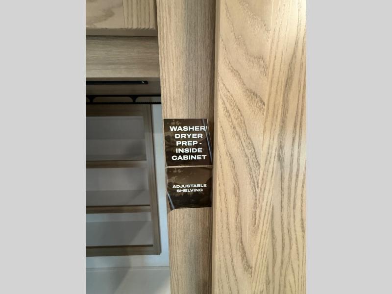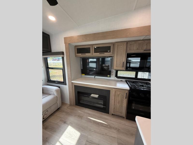 You can enjoy views from inside or outside each day once this RV is set up at the campgrounds! The large windows in the furniture slide and the windows throughout allow you to take in the scenery, and the three slide outs give you a spacious main living and kitchen area as well as front bedroom. You will find lots of seating for guests on the hide-a-bed sofa in the rear, and on the theater seats and booth dinette in the slide. The cook will love the 12V refrigerator and large pantry to store food, and everyone can enjoy the Smart TV and fireplace when visiting and relaxing. The front bedroom offers a king bed slide, a front wardrobe, plus washer and dryer prep if you choose to add those appliances.