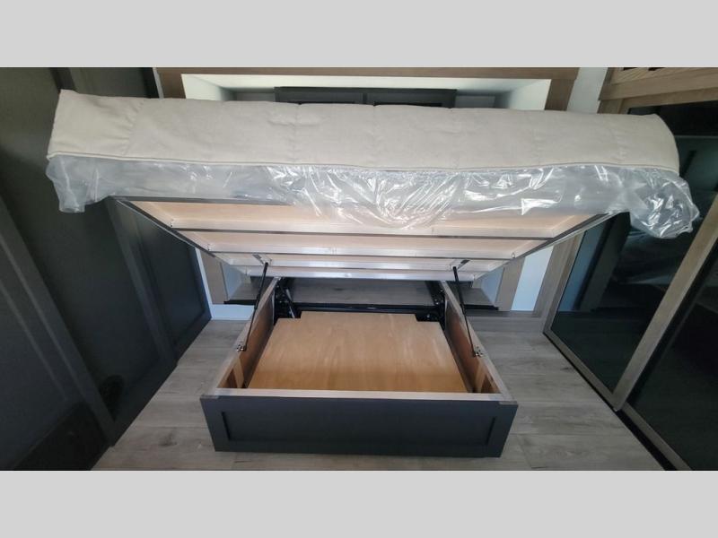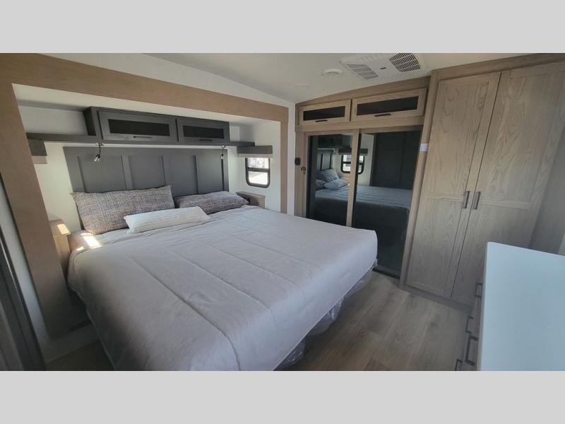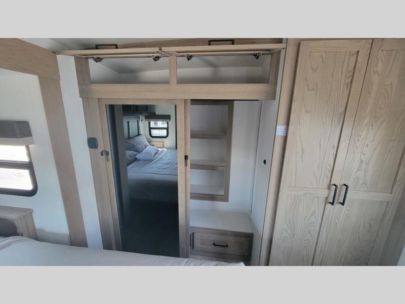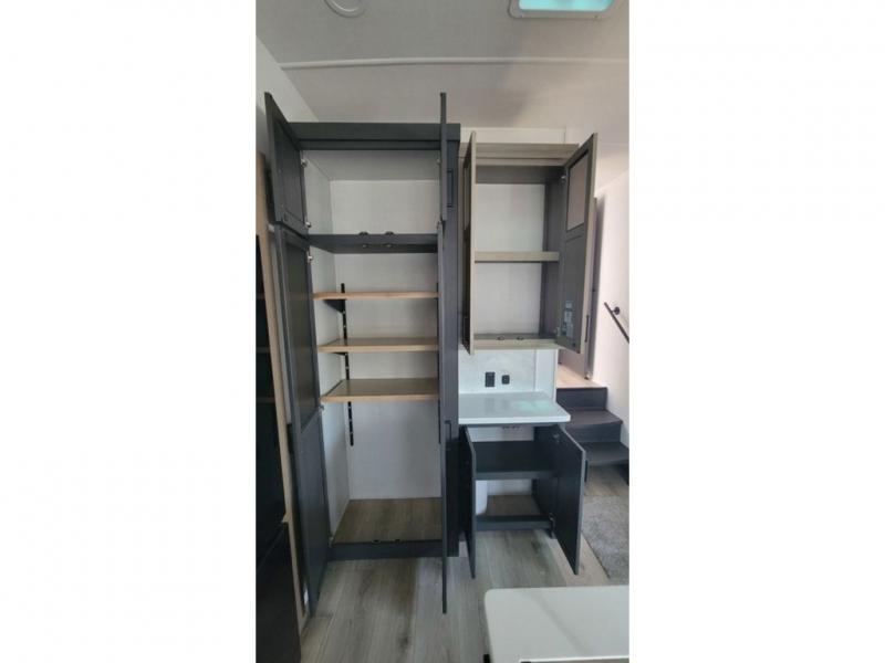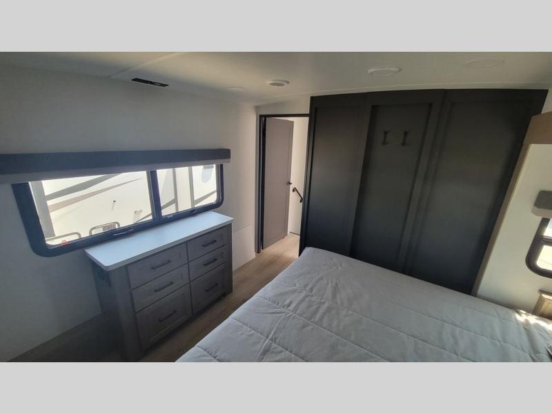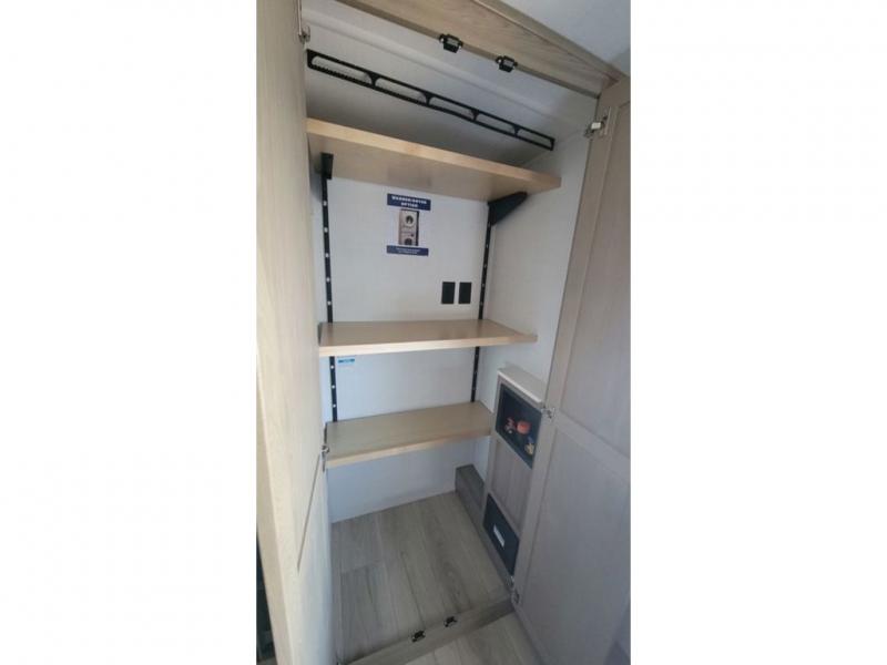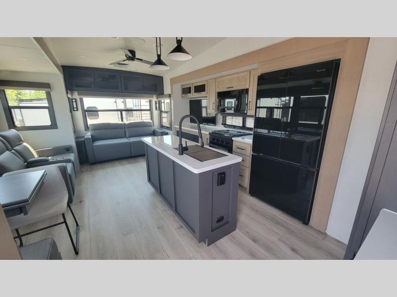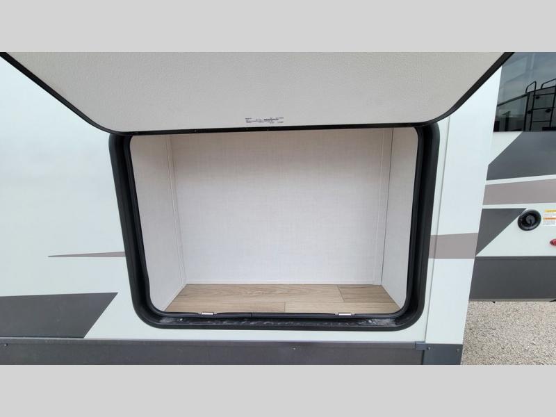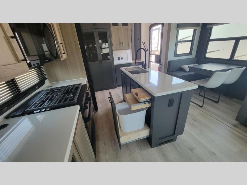 You can enjoy views from inside or outside each day once this RV is set up at the campgrounds! The large windows in the furniture slide and the windows throughout allow you to take in the scenery, and the three slide outs give you a spacious main living and kitchen area as well as front bedroom. You will find lots of seating for guests on the hide-a-bed sofa in the rear, and on the theater seats and booth dinette in the slide. The cook will love the 12V refrigerator and large pantry to store food, and everyone can enjoy the Smart TV and fireplace when visiting and relaxing. The front bedroom offers a king bed slide, a front wardrobe, plus washer and dryer prep if you choose to add those appliances.