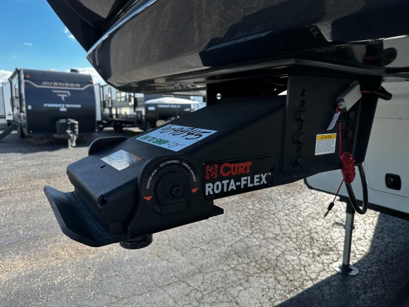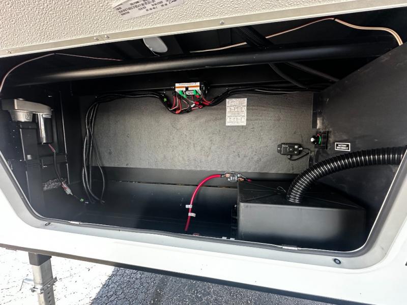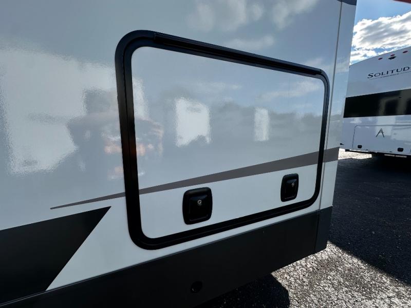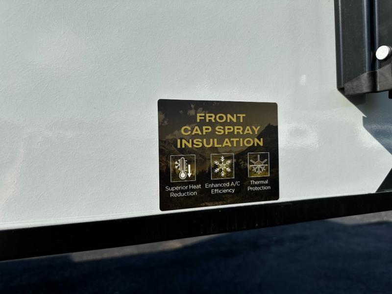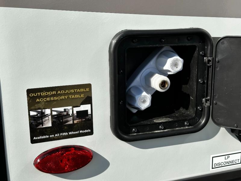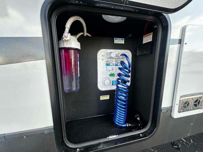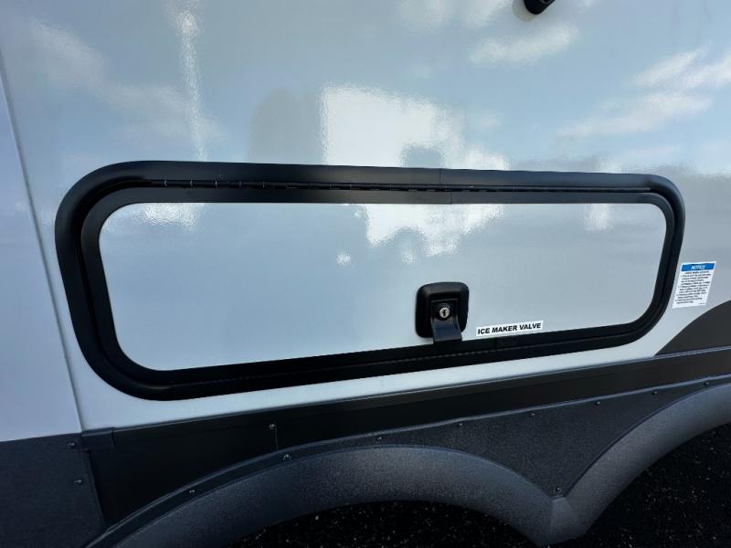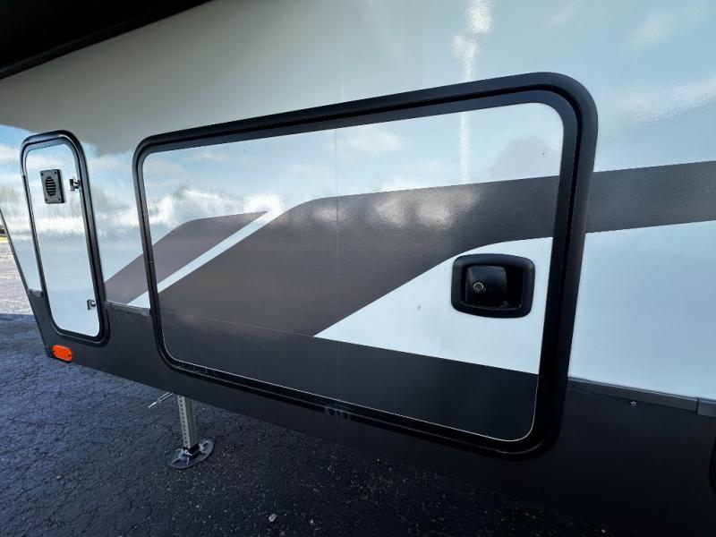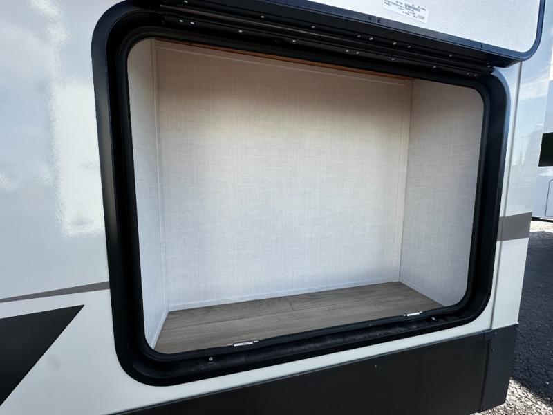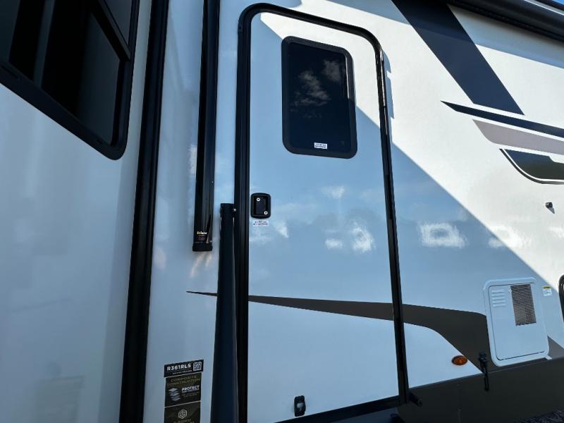 The private front master suite provides a peaceful retreat with a walk-around king or queen bed, ample wardrobe storage, and washer/dryer prep for extended trips. The full bathroom features a large shower with skylight, modern fixtures, and thoughtful storage solutions, delivering the convenience and comfort you expect from a premium fifth wheel. Large windows, high ceilings, and elegant finishes throughout the 361RLS create a bright, airy space that feels like home no matter where your travels take you.