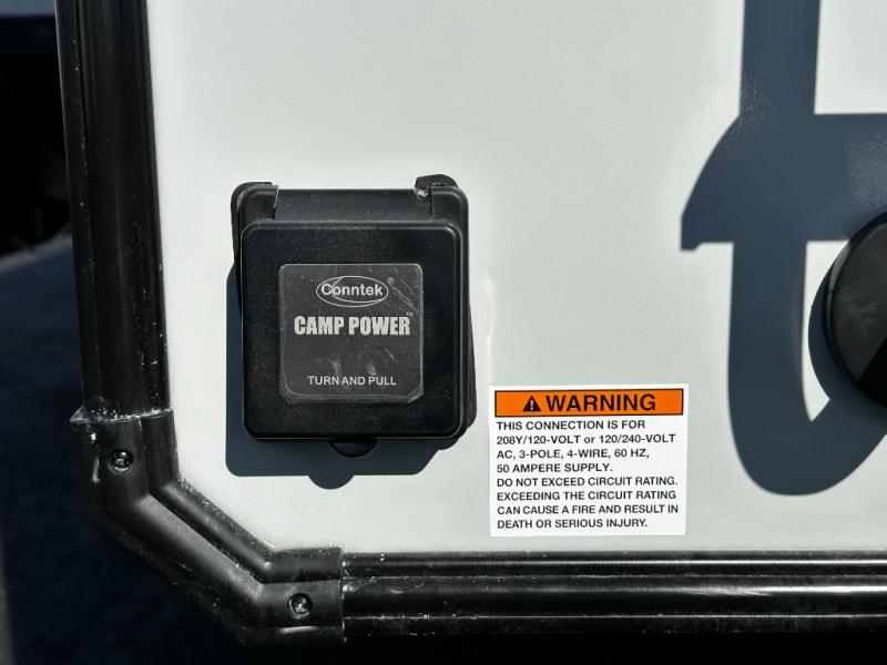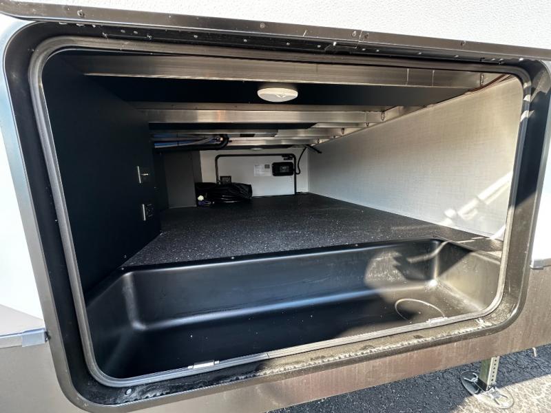 Inside, you’ll find a spacious and inviting living area designed for relaxation and entertainment. Plush theater seating and a tri-fold sofa surround a full entertainment center with fireplace, making it easy to unwind after a day of travel or outdoor adventure. The chef-inspired kitchen includes solid-surface countertops, residential-grade appliances, an oversized pantry, and an island with extra storage, offering everything you need to prepare meals with ease and style. The open floorplan ensures seamless flow between the kitchen, dining, and living areas, enhancing comfort and functionality.