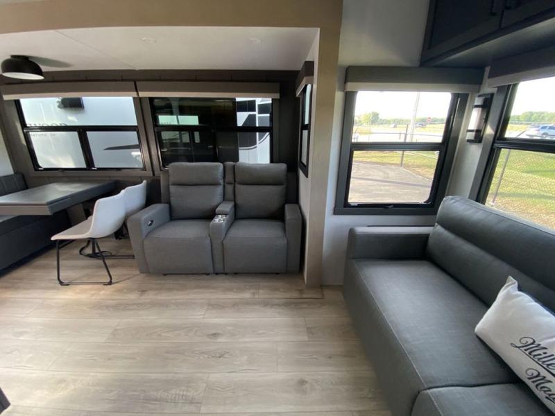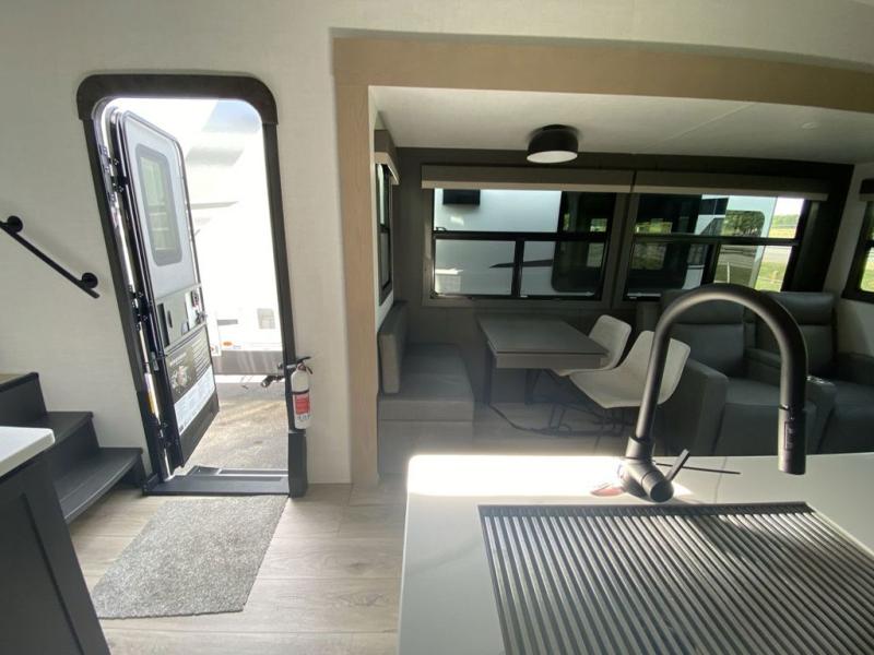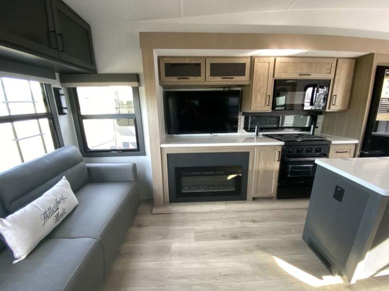 You can enjoy views from inside or outside each day once this RV is set up at the campgrounds! The large windows in the furniture slide and the windows throughout allow you to take in the scenery, and the three slide outs give you a spacious main living and kitchen area as well as front bedroom. You will find lots of seating for guests on the hide-a-bed sofa in the rear, on the theater seats and the table, chairs and bench in the slide. The cook will love the 12V refrigerator and large pantry to store food, and everyone can enjoy the Smart TV and fireplace when visiting and relaxing. The front bedroom offers a king bed slide, a front wardrobe, plus washer and dryer prep if you choose to add those appliances.