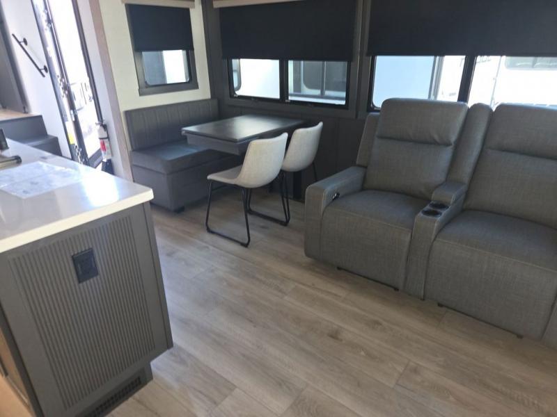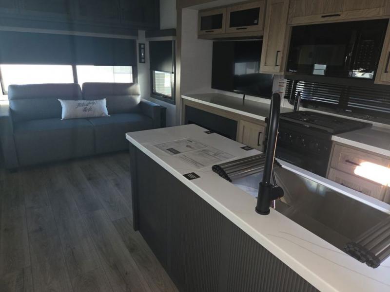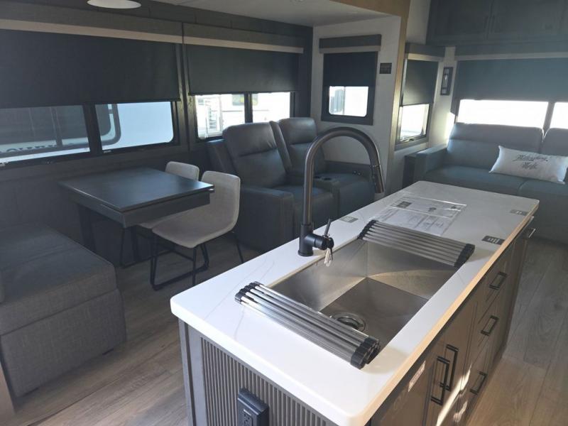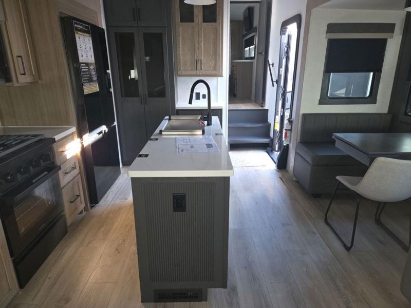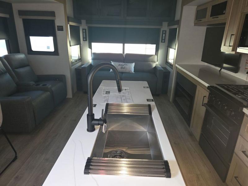You can enjoy views from inside or outside each day once this RV is set up at the campgrounds! The large windows in the furniture slide and the windows throughout allow you to take in the scenery, and the three slide outs give you a spacious main living and kitchen area as well as front bedroom. You will find lots of seating for guests on the hide-a-bed sofa in the rear, on the theater seats and the table, chairs and bench in the slide. The cook will love the 12V refrigerator and large pantry to store food, and everyone can enjoy the Smart TV and fireplace when visiting and relaxing. The front bedroom offers a king bed slide, a front wardrobe, plus washer and dryer prep if you choose to add those appliances.