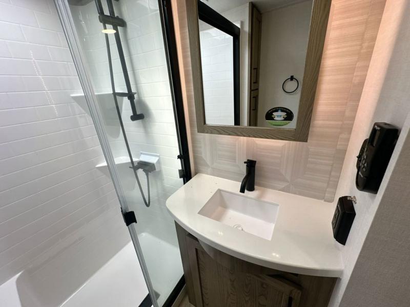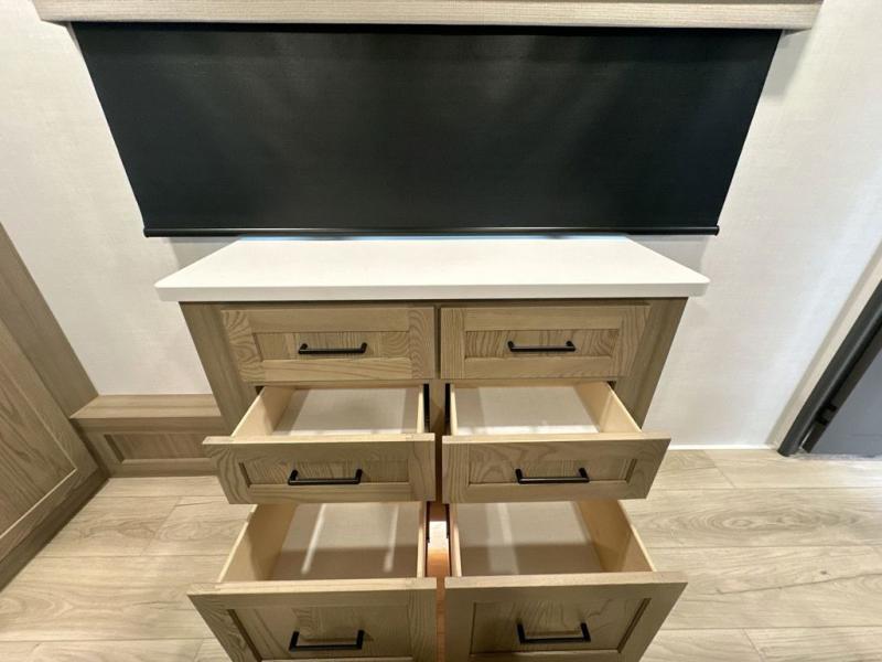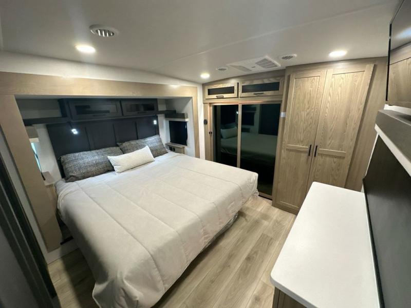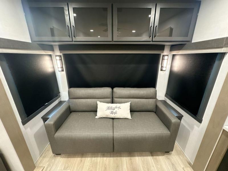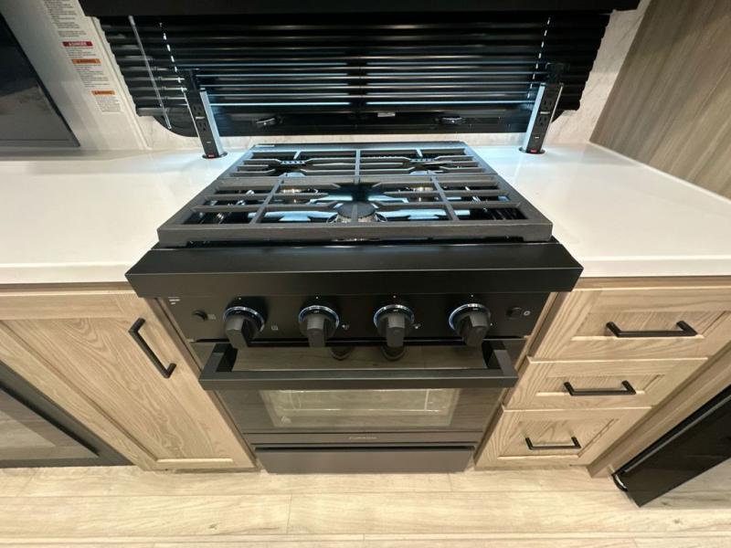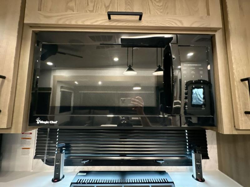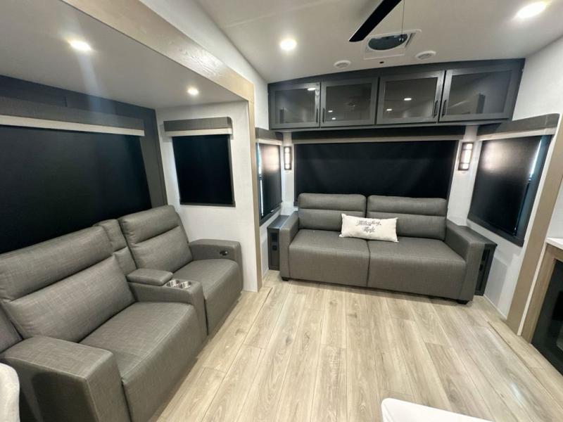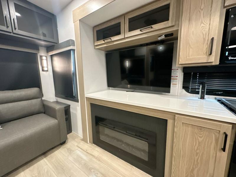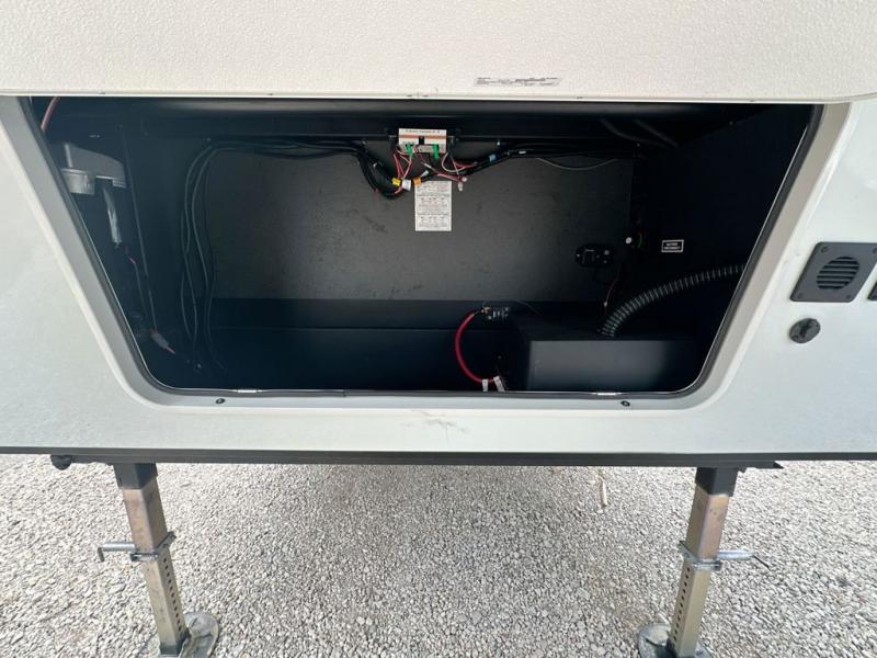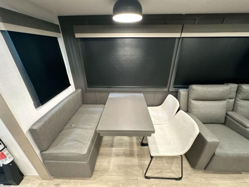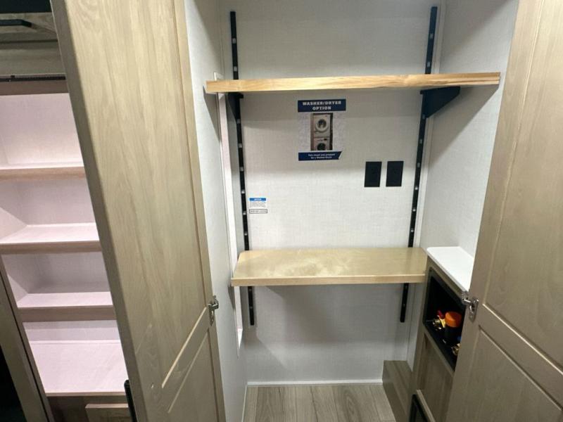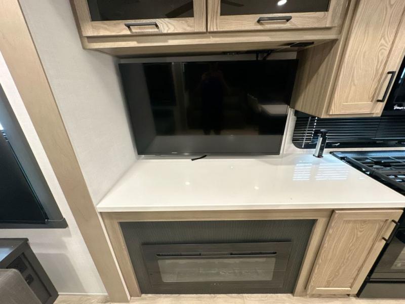 You can enjoy views from inside or outside each day once this RV is set up at the campgrounds! The large windows in the furniture slide and the windows throughout allow you to take in the scenery, and the three slide outs give you a spacious main living and kitchen area as well as front bedroom. You will find lots of seating for guests on the hide-a-bed sofa in the rear, on the theater seats and the table, chairs and bench in the slide. The cook will love the 12V refrigerator and large pantry to store food, and everyone can enjoy the Smart TV and fireplace when visiting and relaxing. The front bedroom offers a king bed slide, a front wardrobe, plus washer and dryer prep if you choose to add those appliances.