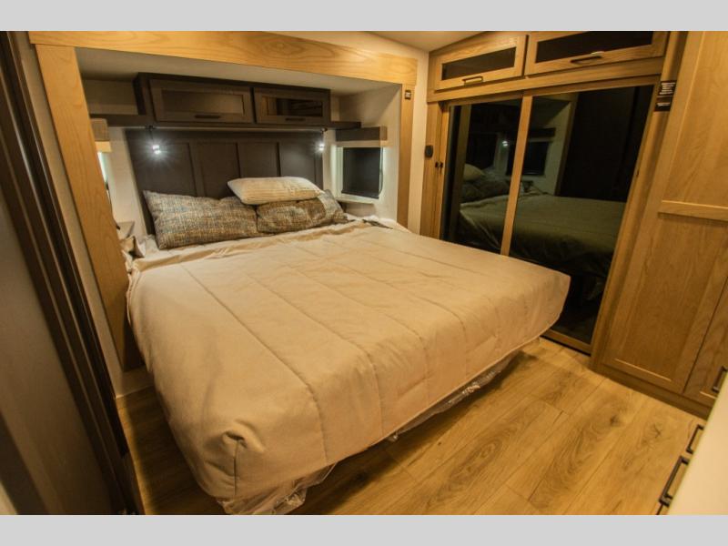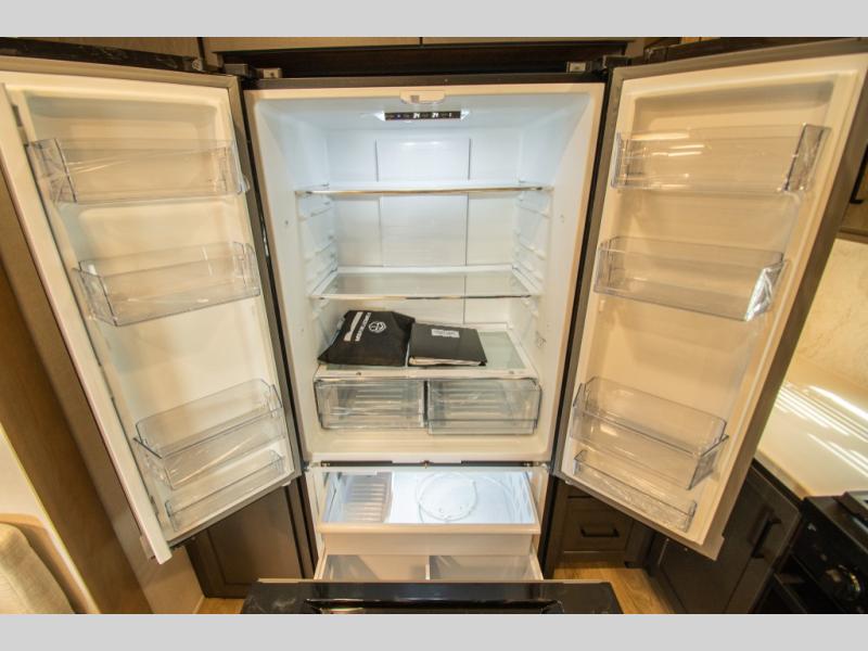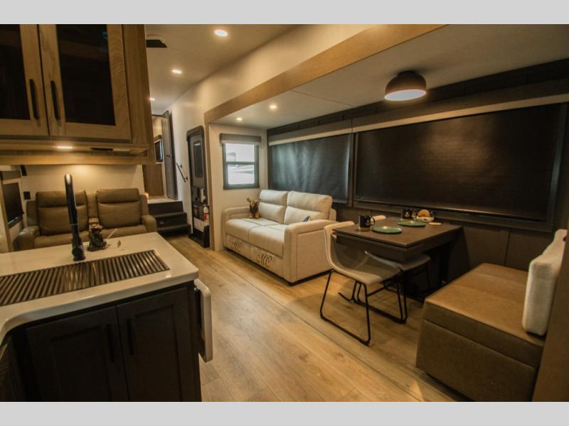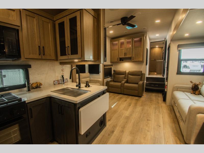 At the rear of the fifth wheel, the rear kitchen features a U-shaped counter design that gives you generous prep space and keeps cooking separate from the main seating area. Storage is thoughtfully placed throughout the kitchen and living space, making it easy to stay organized during longer trips.