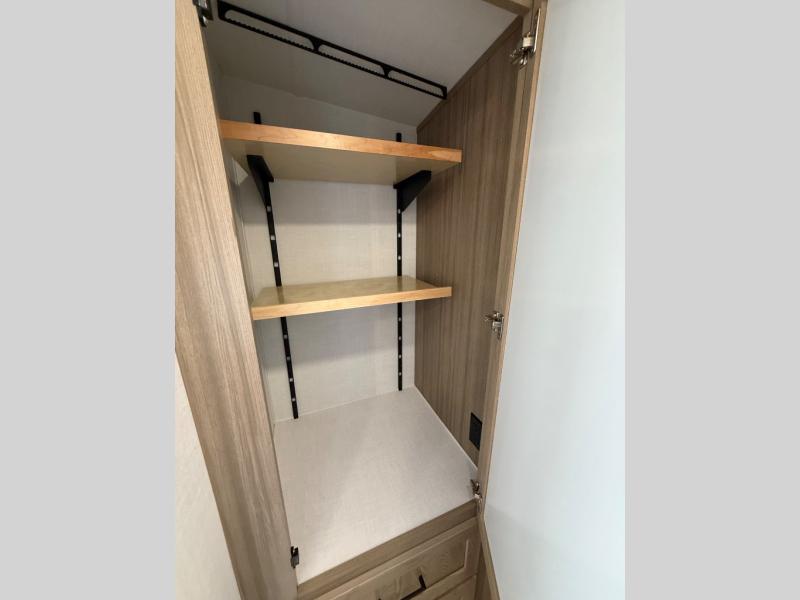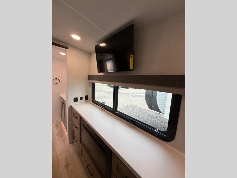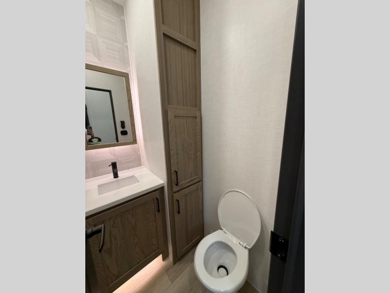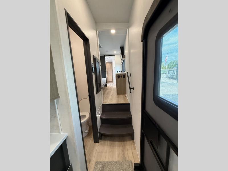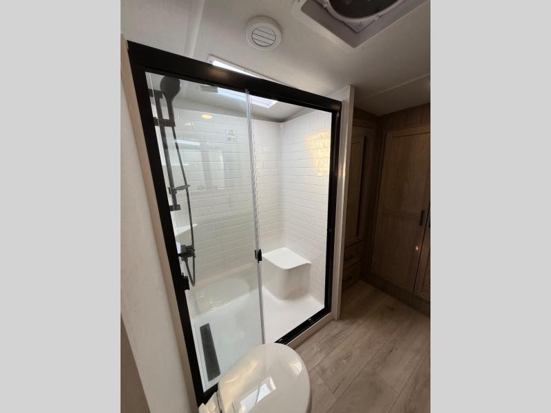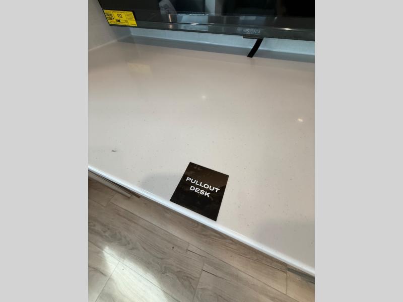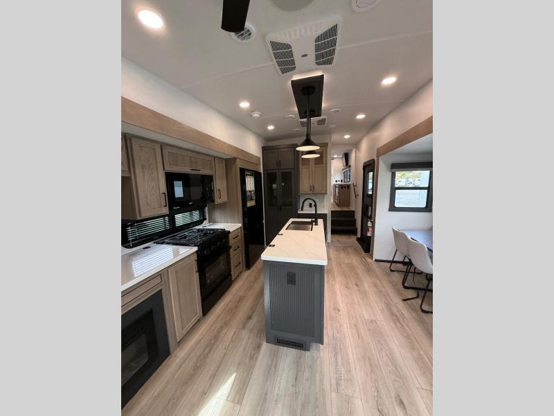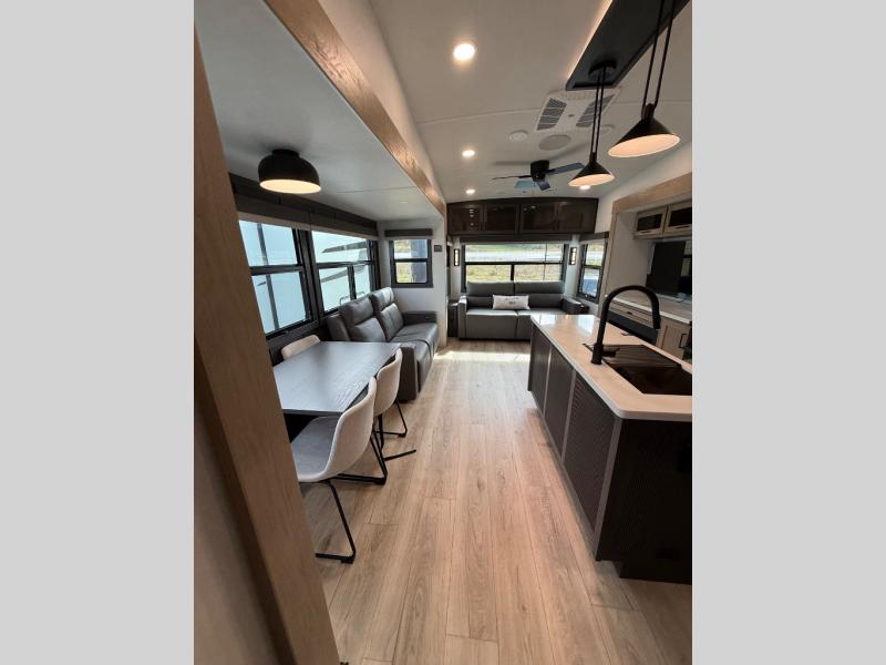 This well-designed layout offers both comfort and functionality. The 72" x 80" king bed provides a spacious and restful sleeping area in the main bedroom. Just steps away, the full front bathroom includes a shower seat for added accessibility, while a convenient half bath near the entrance is perfect for quick use. The kitchen features solid surface countertops and a large island, giving the cook plenty of room to move and work comfortably, along with a rotating table and chairs for dinner and board games. A pull-out desk creates a dedicated space for working away from home, and the 76" hide-a-bed adds extra sleeping space for the whole gang.