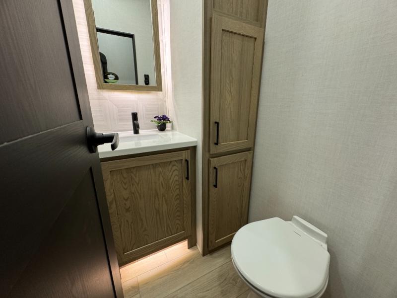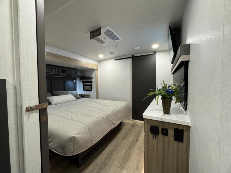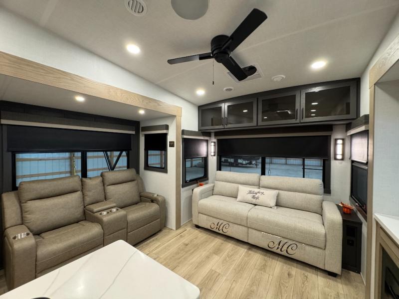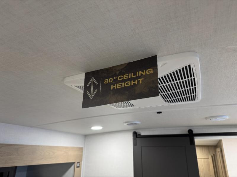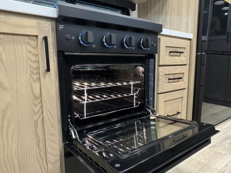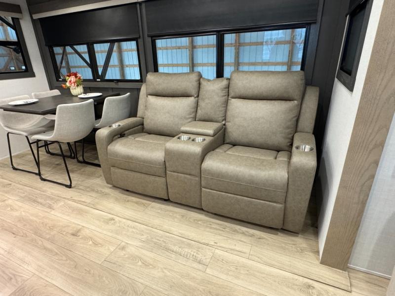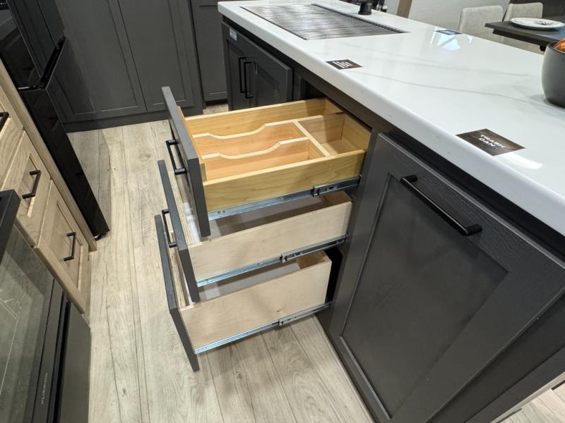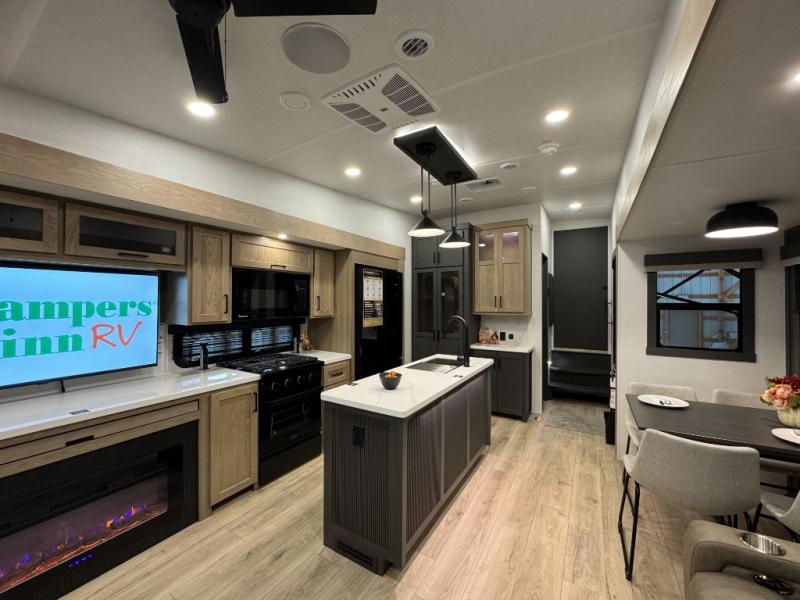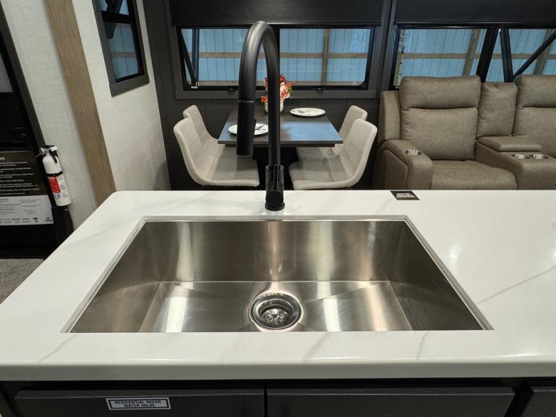This well-designed layout offers both comfort and functionality. The 72" x 80" king bed provides a spacious and restful sleeping area in the main bedroom. Just steps away, the full front bathroom includes a shower seat for added accessibility, while a convenient half bath near the entrance is perfect for quick use. The kitchen features solid surface countertops and a large island, giving the cook plenty of room to move and work comfortably, along with a rotating table and chairs for dinner and board games. A pull-out desk creates a dedicated space for working away from home, and the 76" hide-a-bed adds extra sleeping space for the whole gang.