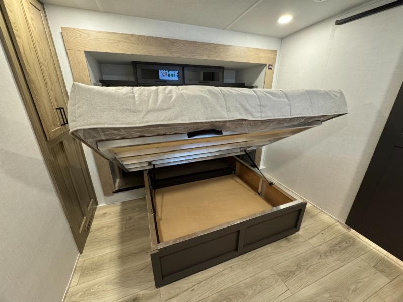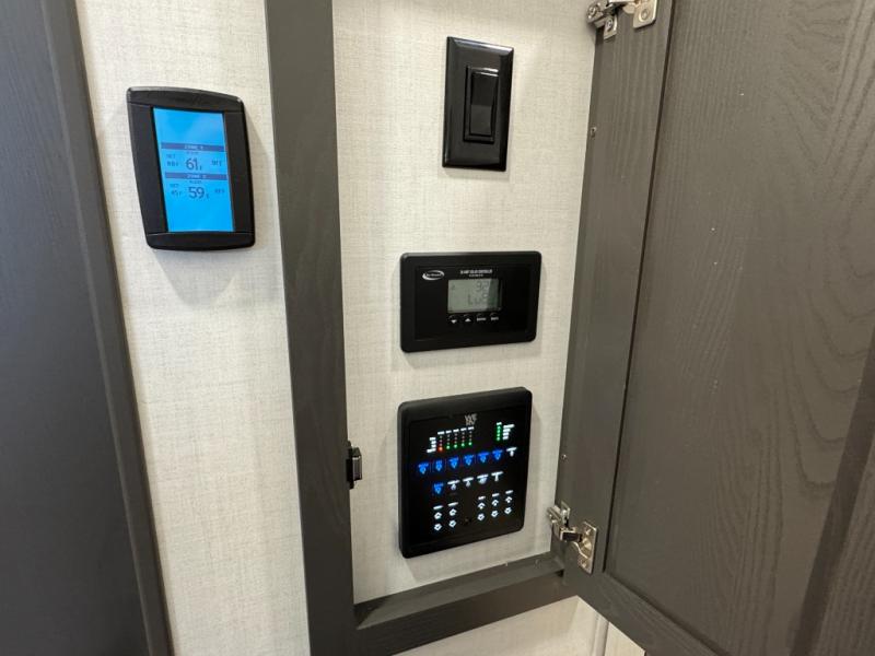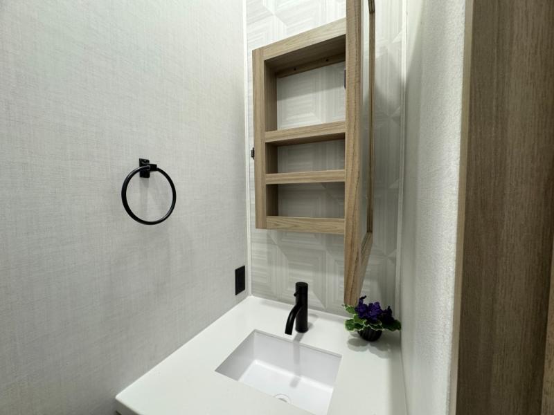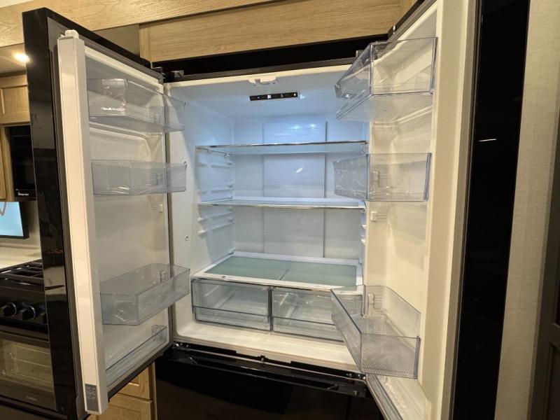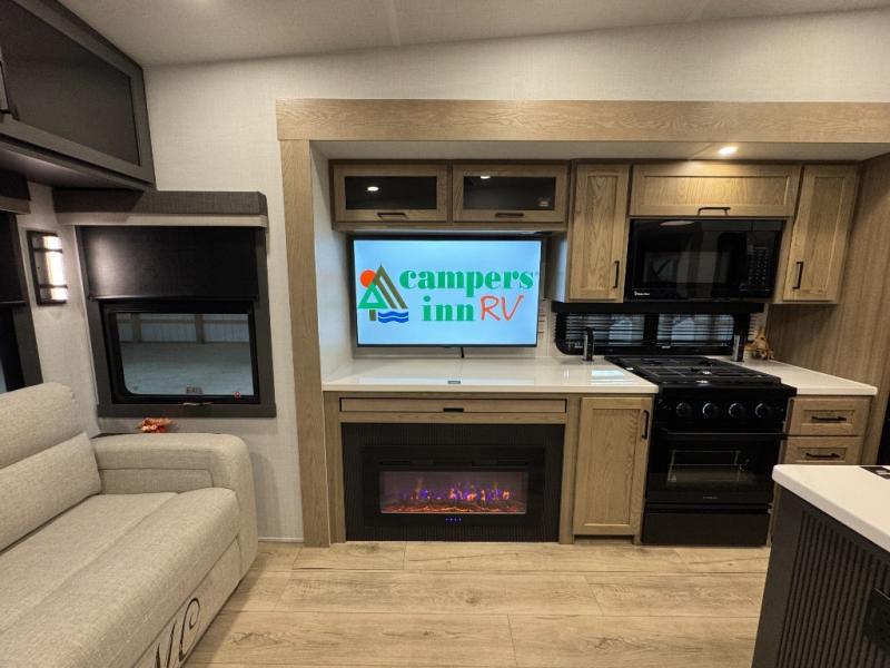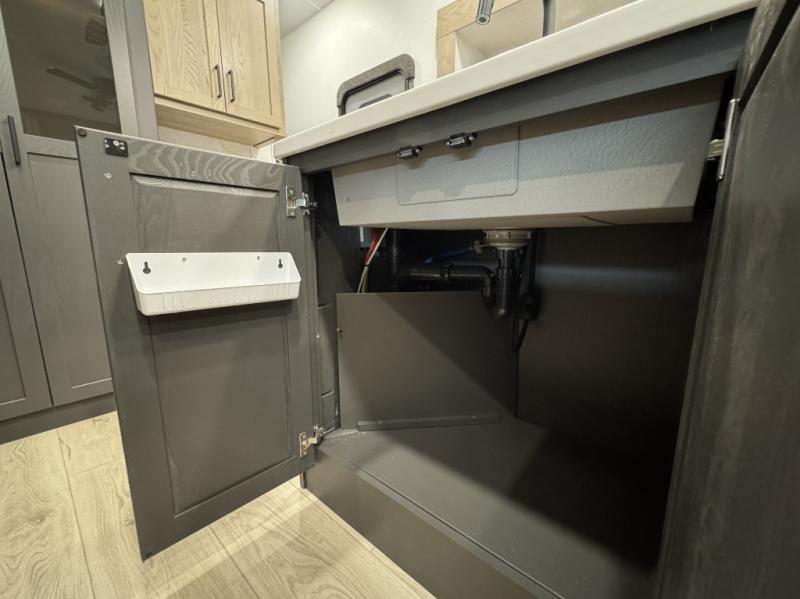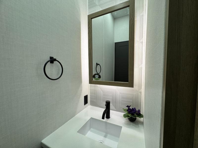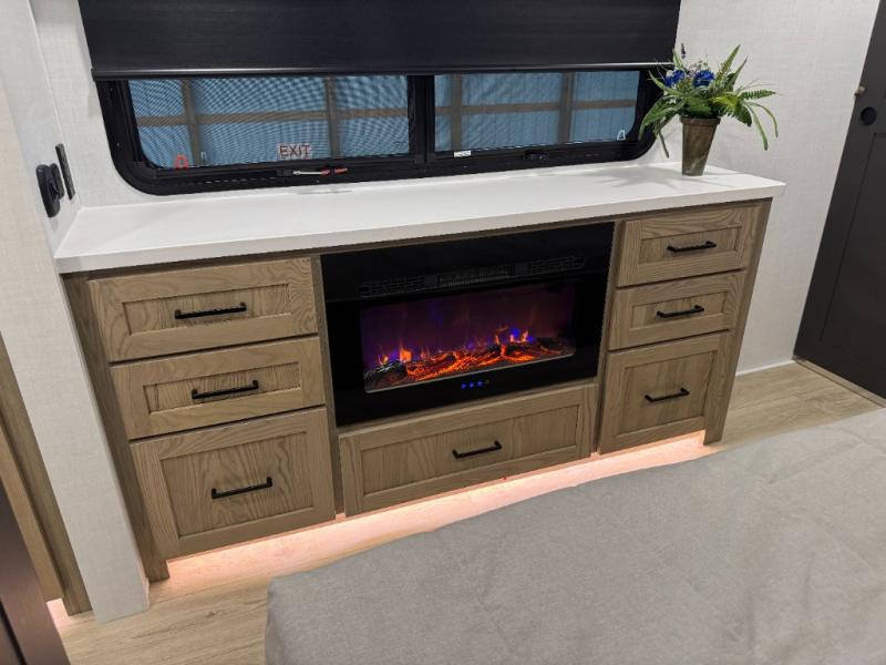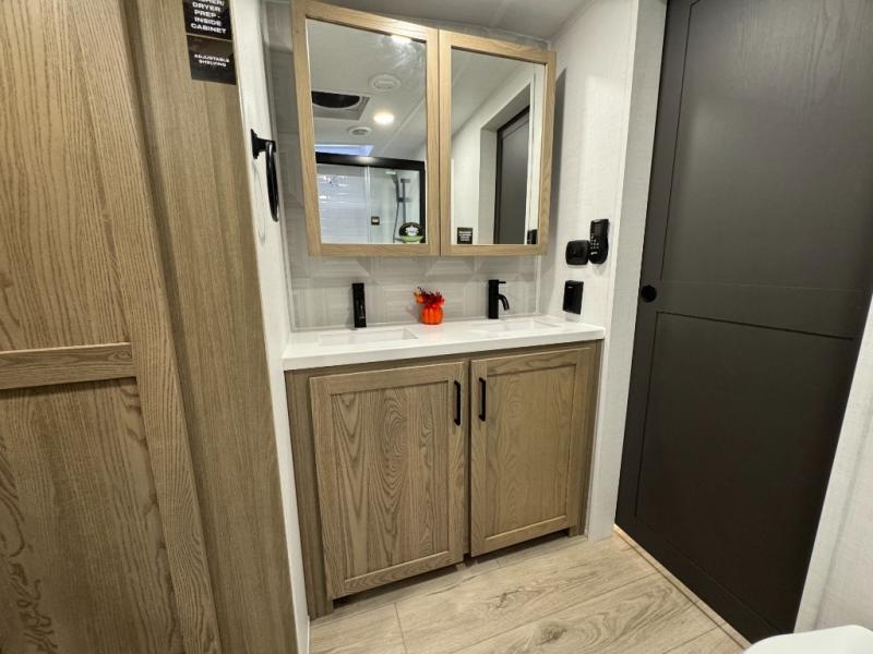 This well-designed layout offers both comfort and functionality. The 72" x 80" king bed provides a spacious and restful sleeping area in the main bedroom. Just steps away, the full front bathroom includes a shower seat for added accessibility, while a convenient half bath near the entrance is perfect for quick use. The kitchen features solid surface countertops and a large island, giving the cook plenty of room to move and work comfortably, along with a rotating table and chairs for dinner and board games. A pull-out desk creates a dedicated space for working away from home, and the 76" hide-a-bed adds extra sleeping space for the whole gang.