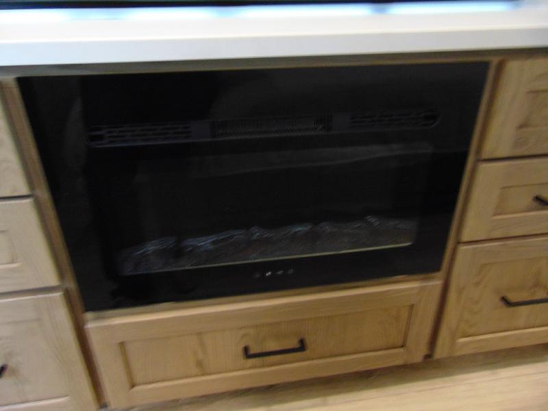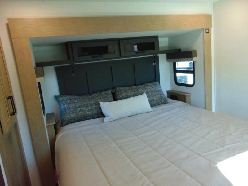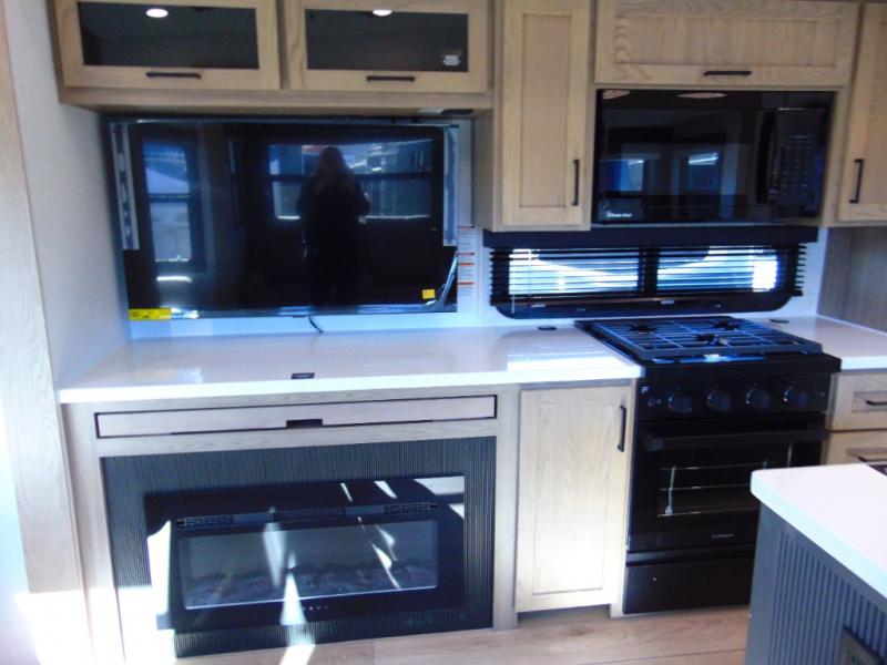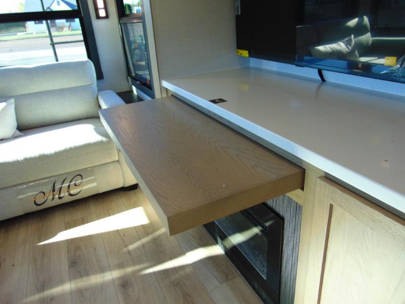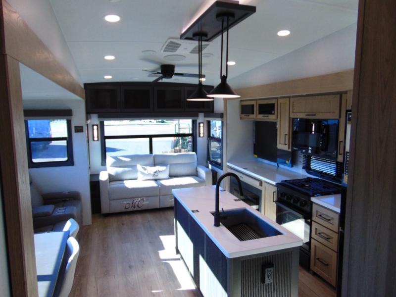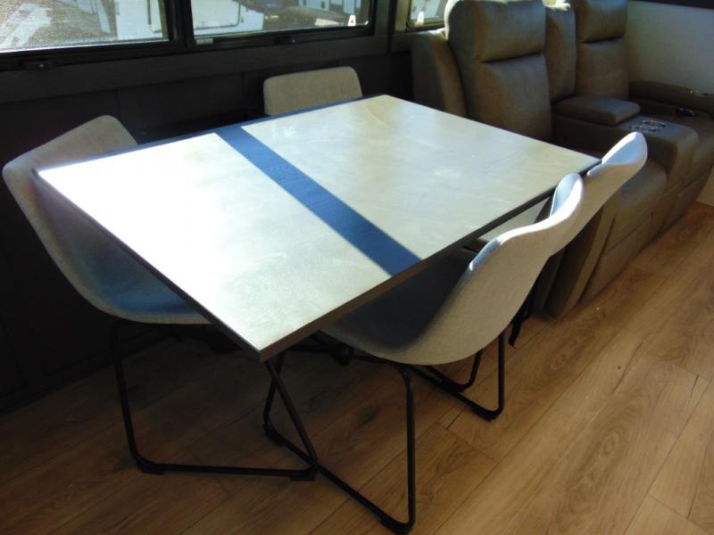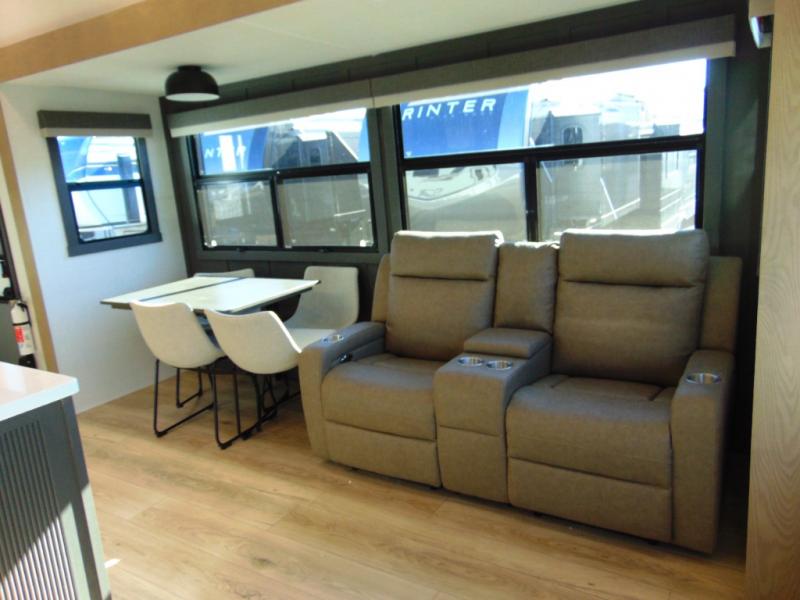 This well-designed layout offers both comfort and functionality. The 72" x 80" king bed provides a spacious and restful sleeping area in the main bedroom. Just steps away, the full front bathroom includes a shower seat for added accessibility, while a convenient half bath near the entrance is perfect for quick use. The kitchen features solid surface countertops and a large island, giving the cook plenty of room to move and work comfortably, along with a rotating table and chairs for dinner and board games. A pull-out desk creates a dedicated space for working away from home, and the 76" hide-a-bed adds extra sleeping space for the whole gang.