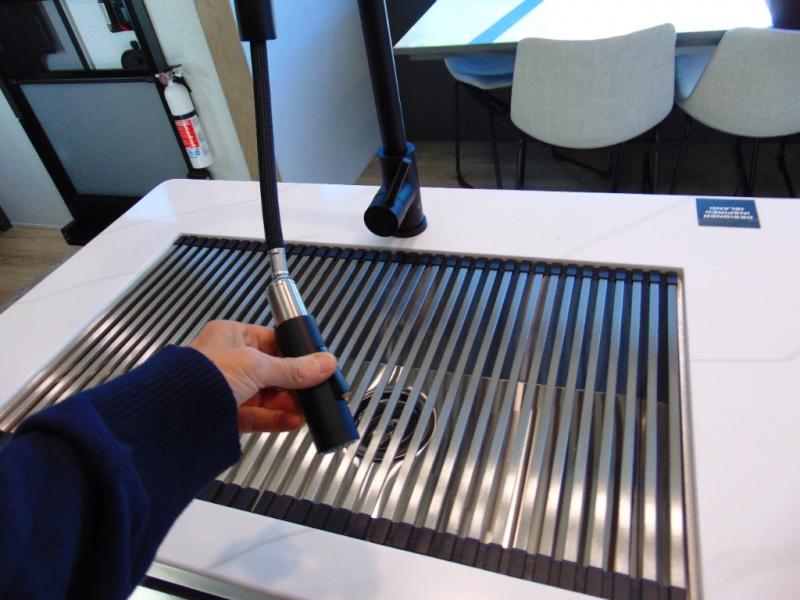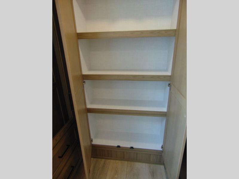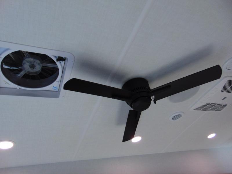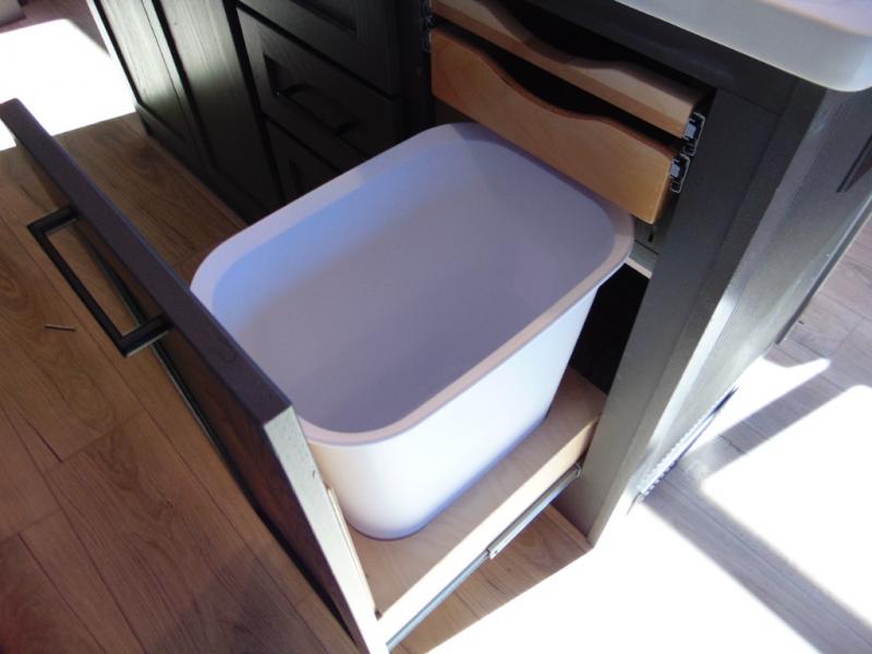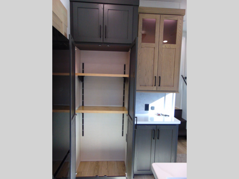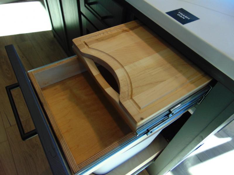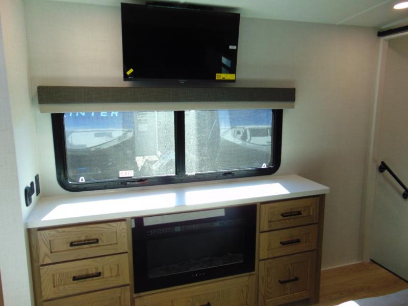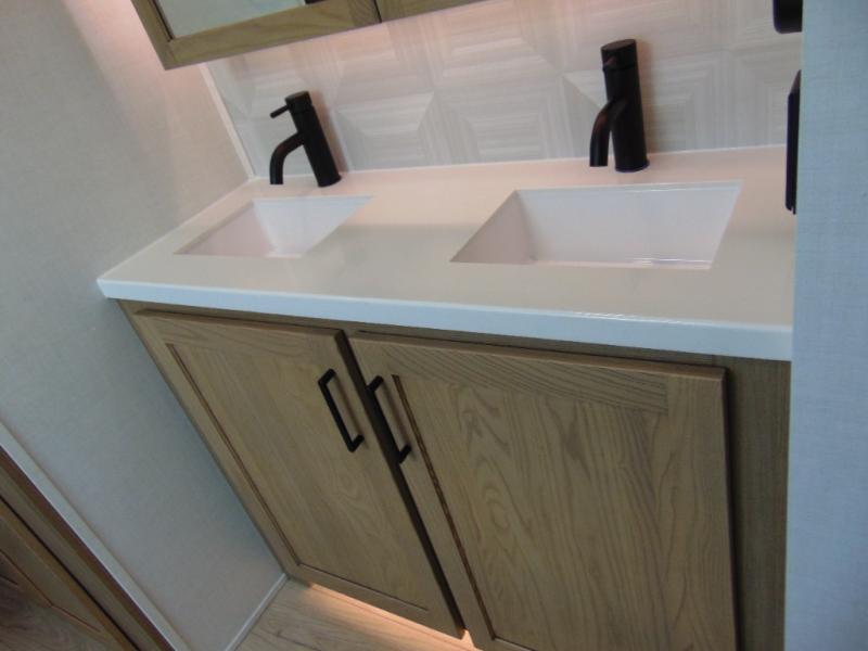 This well-designed layout offers both comfort and functionality. The 72" x 80" king bed provides a spacious and restful sleeping area in the main bedroom. Just steps away, the full front bathroom includes a shower seat for added accessibility, while a convenient half bath near the entrance is perfect for quick use. The kitchen features solid surface countertops and a large island, giving the cook plenty of room to move and work comfortably, along with a rotating table and chairs for dinner and board games. A pull-out desk creates a dedicated space for working away from home, and the 76" hide-a-bed adds extra sleeping space for the whole gang.