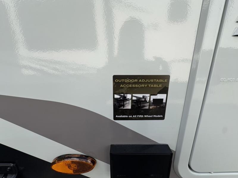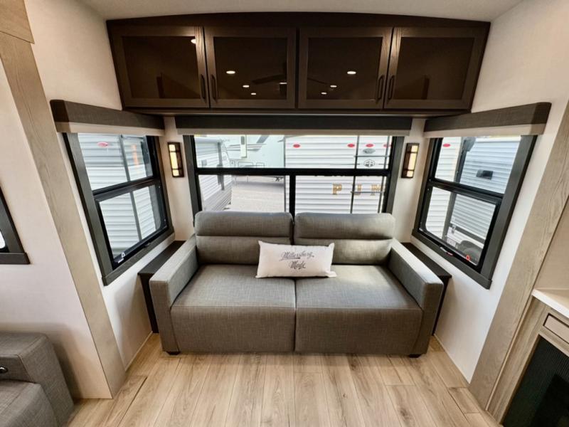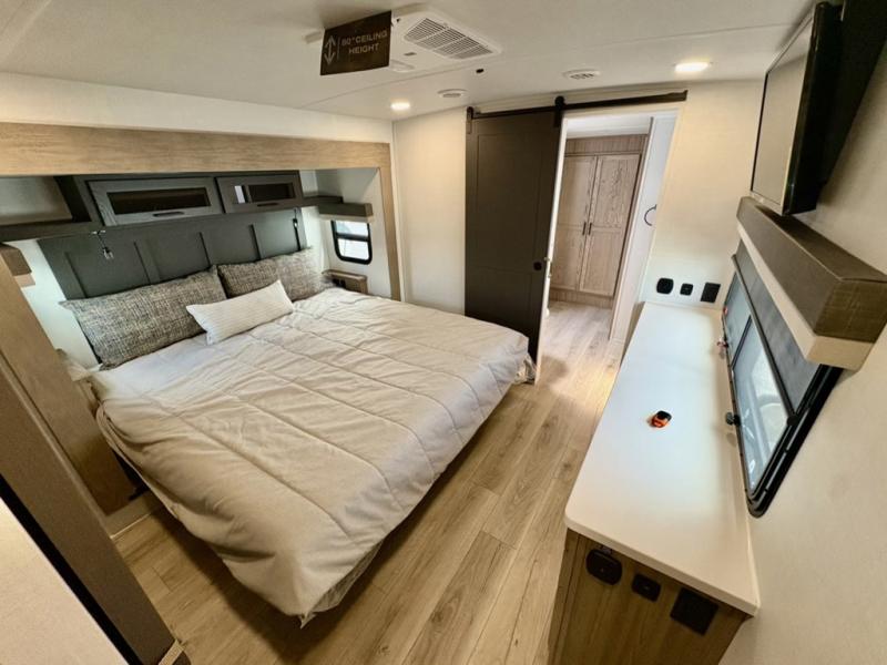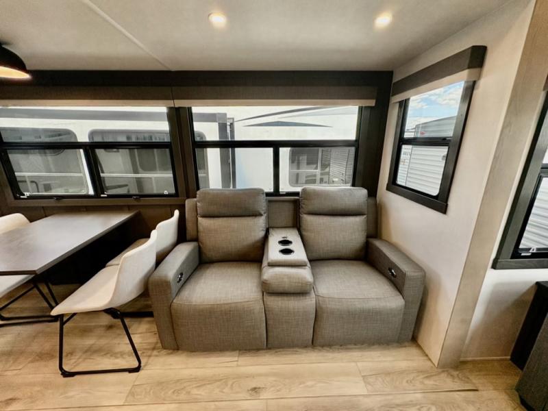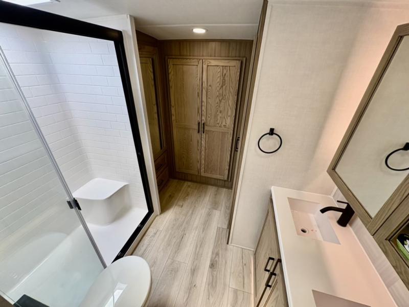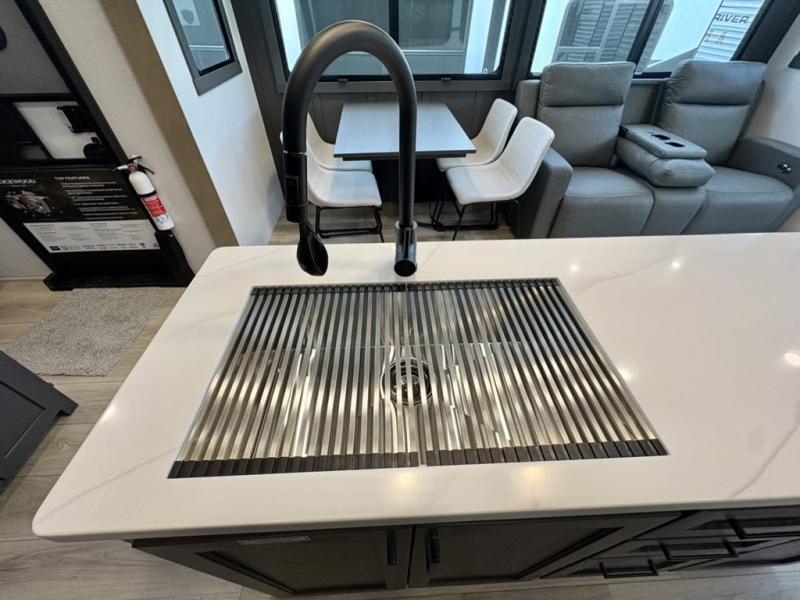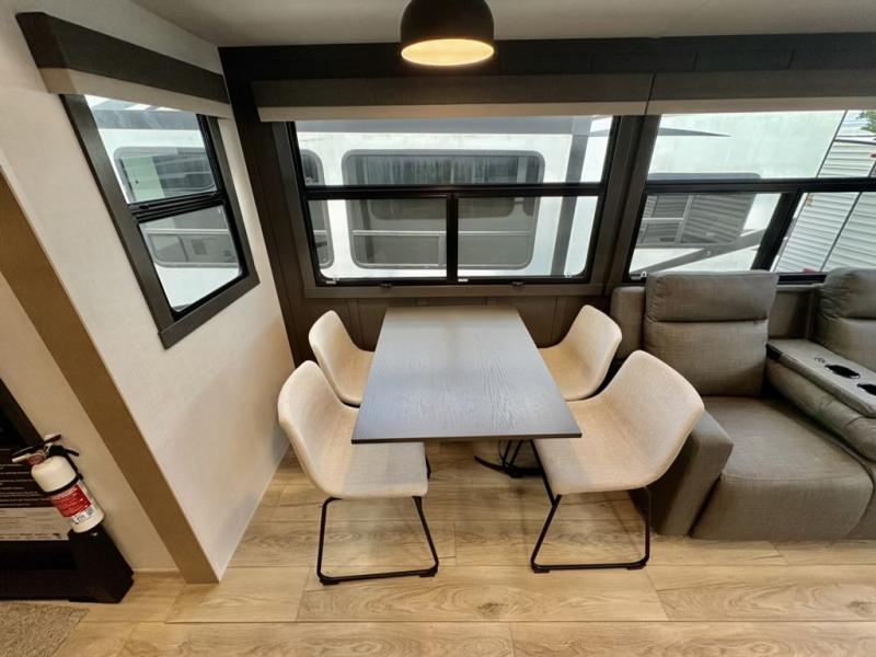 This well-designed layout offers both comfort and functionality. The 72" x 80" king bed provides a spacious and restful sleeping area in the main bedroom. Just steps away, the full front bathroom includes a shower seat for added accessibility, while a convenient half bath near the entrance is perfect for quick use. The kitchen features solid surface countertops and a large island, giving the cook plenty of room to move and work comfortably, along with a rotating table and chairs for dinner and board games. A pull-out desk creates a dedicated space for working away from home, and the 76" hide-a-bed adds extra sleeping space for the whole gang.