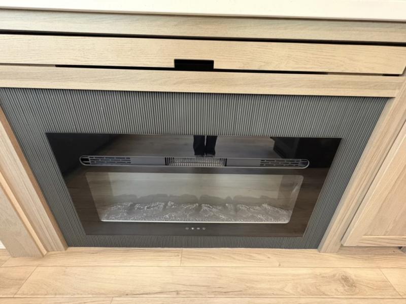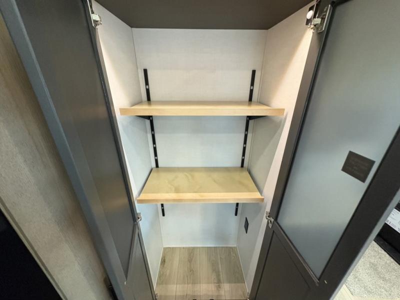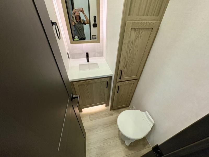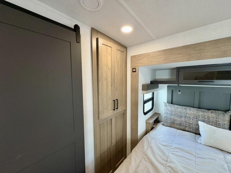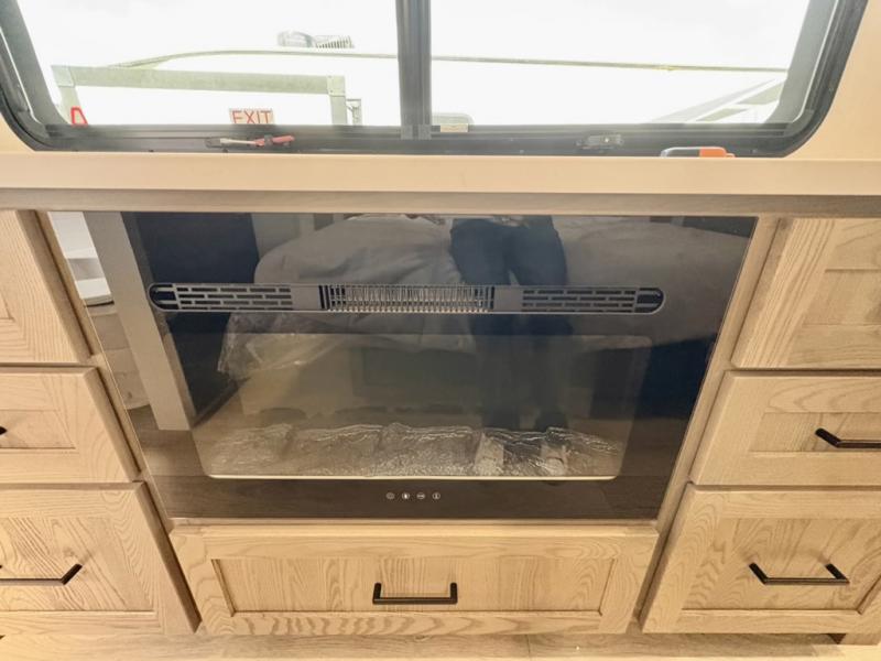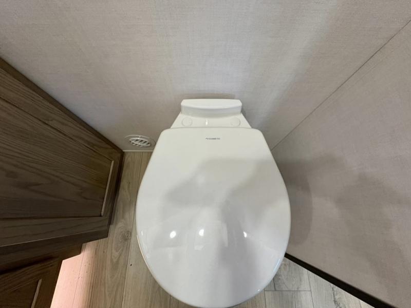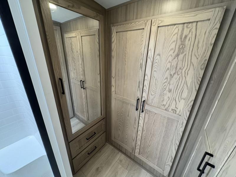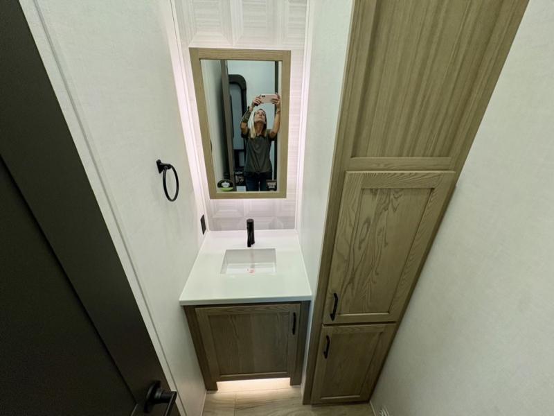 This well-designed layout offers both comfort and functionality. The 72" x 80" king bed provides a spacious and restful sleeping area in the main bedroom. Just steps away, the full front bathroom includes a shower seat for added accessibility, while a convenient half bath near the entrance is perfect for quick use. The kitchen features solid surface countertops and a large island, giving the cook plenty of room to move and work comfortably, along with a rotating table and chairs for dinner and board games. A pull-out desk creates a dedicated space for working away from home, and the 76" hide-a-bed adds extra sleeping space for the whole gang.