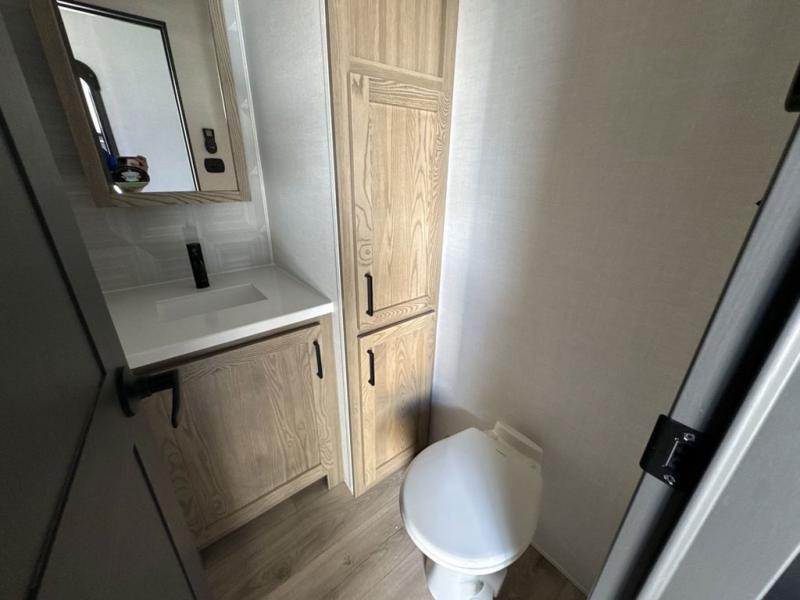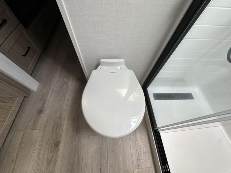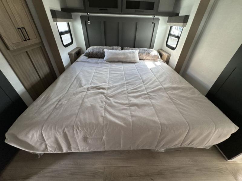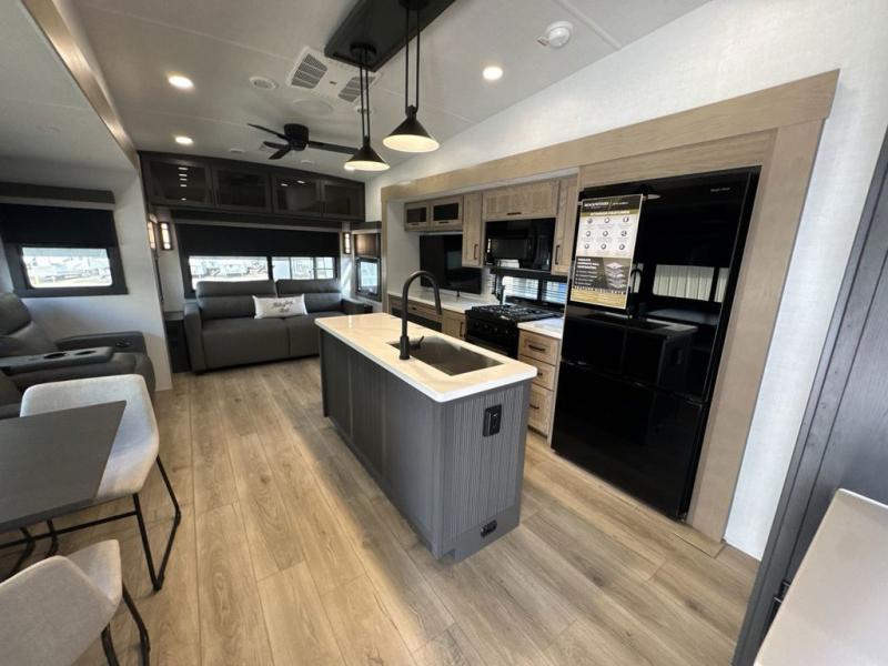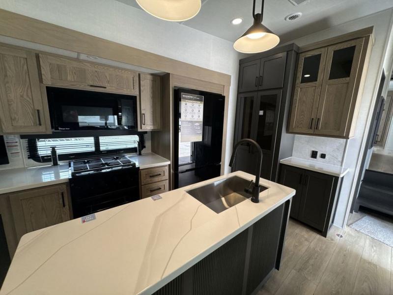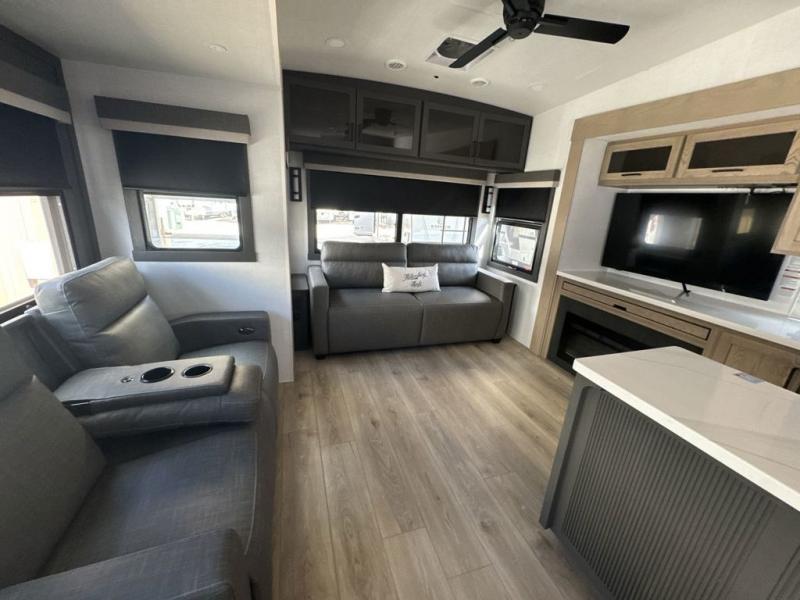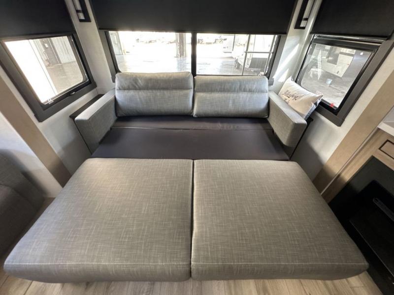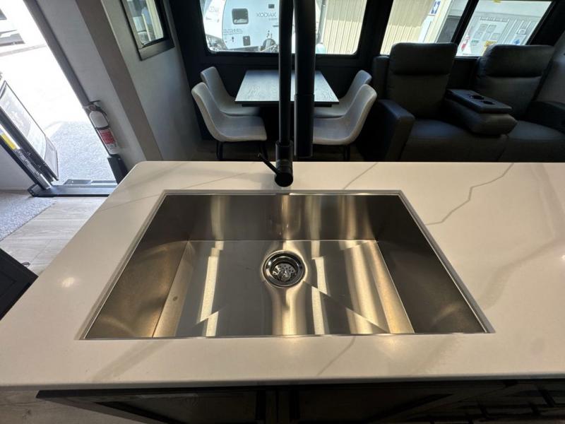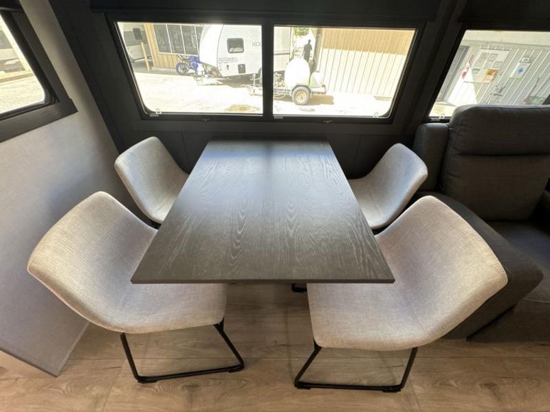 This well-designed layout offers both comfort and functionality. The 72" x 80" king bed provides a spacious and restful sleeping area in the main bedroom. Just steps away, the full front bathroom includes a shower seat for added accessibility, while a convenient half bath near the entrance is perfect for quick use. The kitchen features solid surface countertops and a large island, giving the cook plenty of room to move and work comfortably, along with a rotating table and chairs for dinner and board games. A pull-out desk creates a dedicated space for working away from home, and the 76" hide-a-bed adds extra sleeping space for the whole gang.