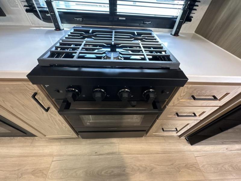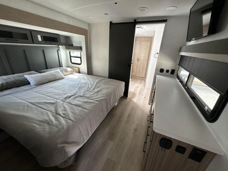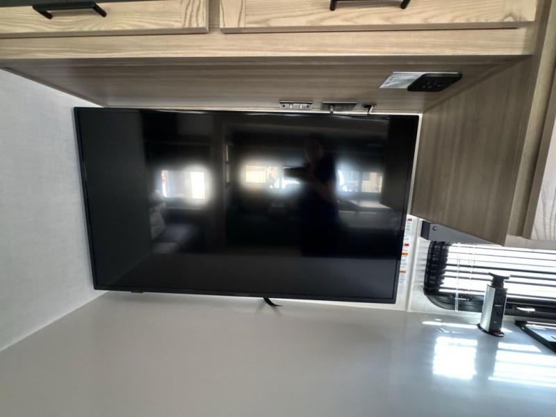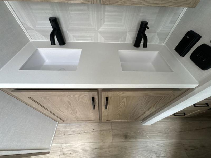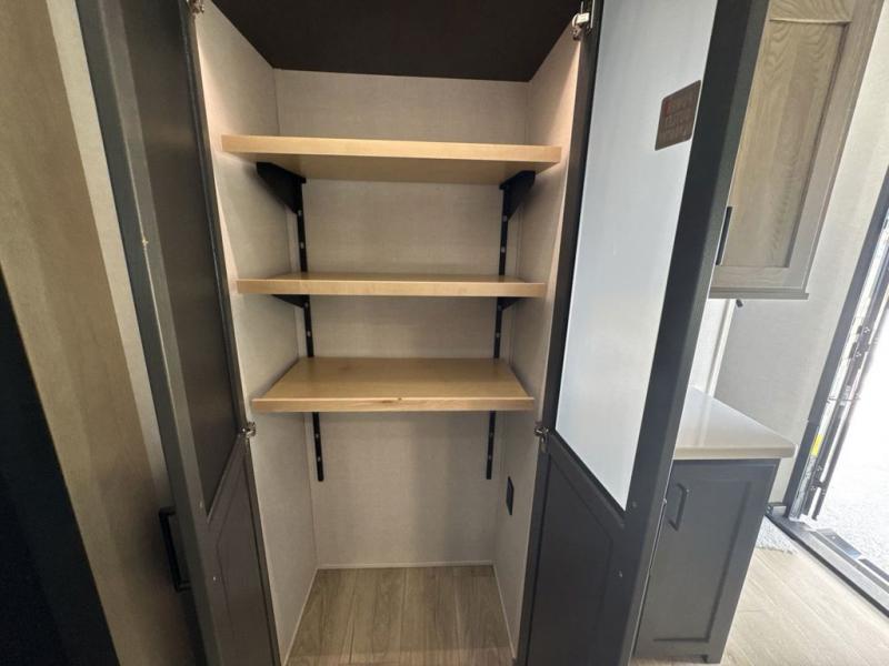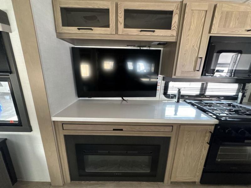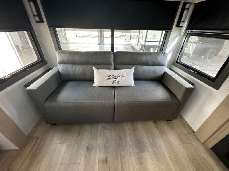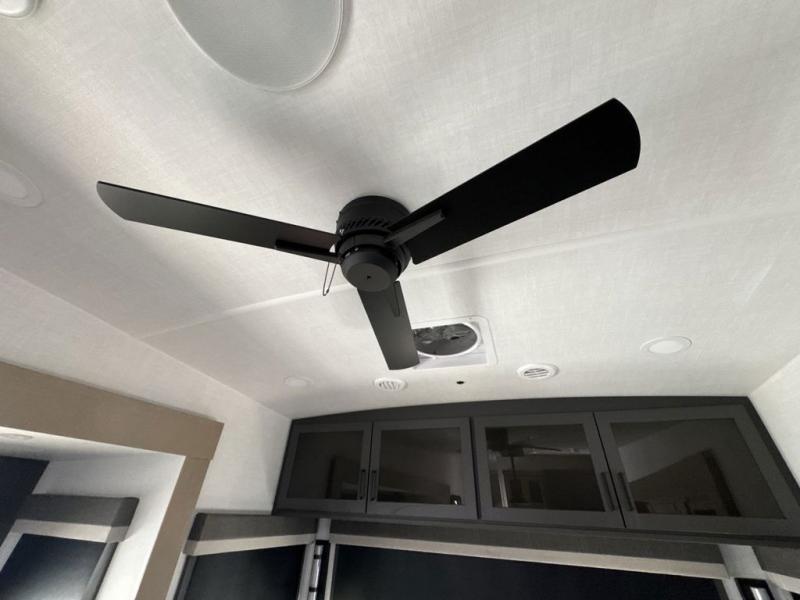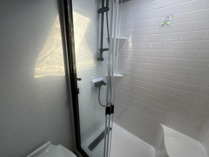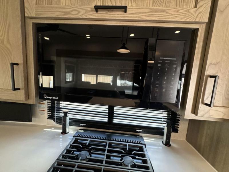 This well-designed layout offers both comfort and functionality. The 72" x 80" king bed provides a spacious and restful sleeping area in the main bedroom. Just steps away, the full front bathroom includes a shower seat for added accessibility, while a convenient half bath near the entrance is perfect for quick use. The kitchen features solid surface countertops and a large island, giving the cook plenty of room to move and work comfortably, along with a rotating table and chairs for dinner and board games. A pull-out desk creates a dedicated space for working away from home, and the 76" hide-a-bed adds extra sleeping space for the whole gang.