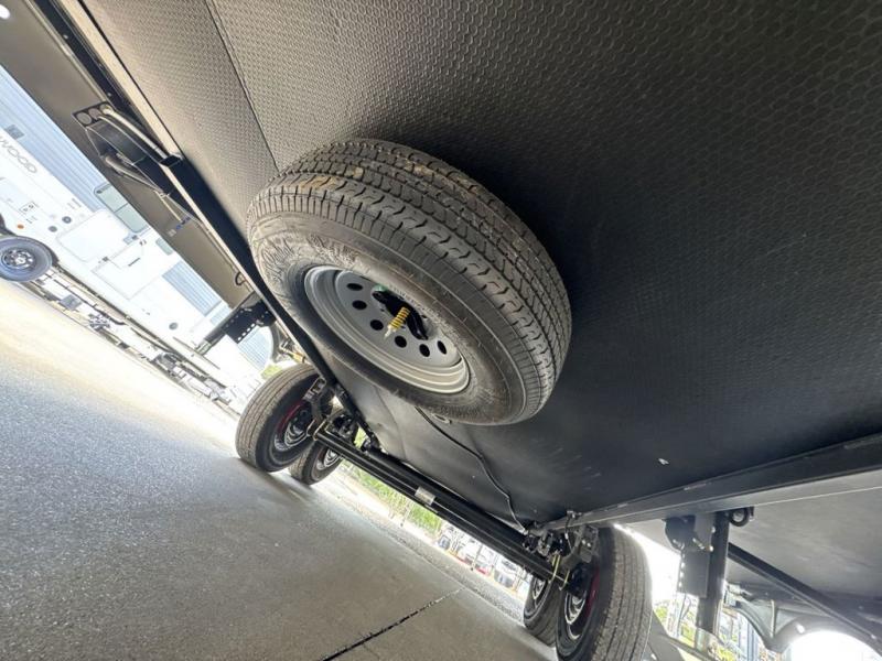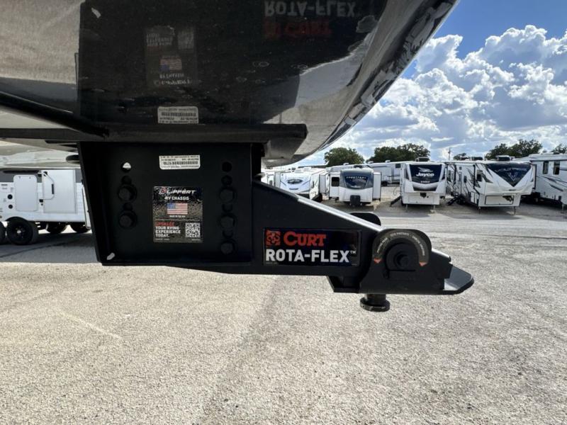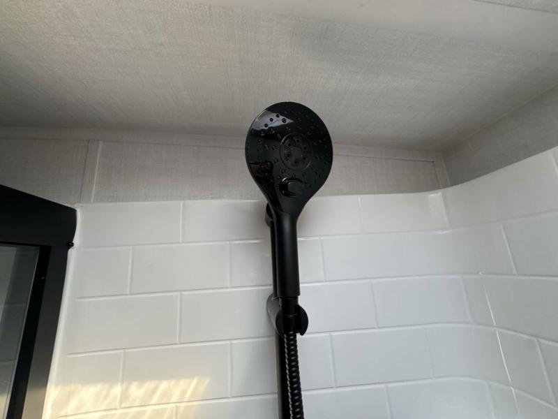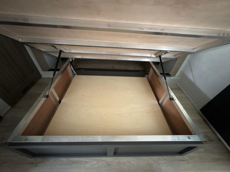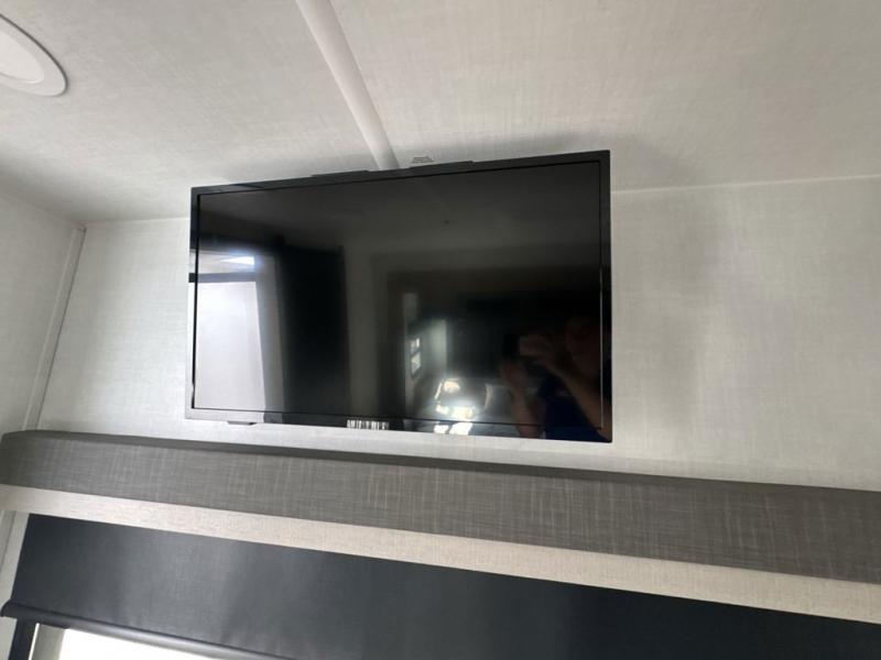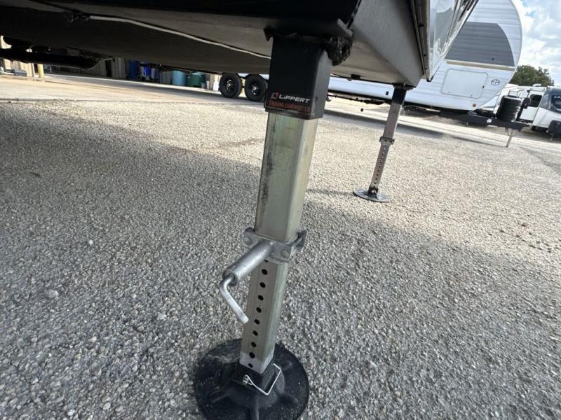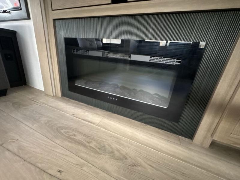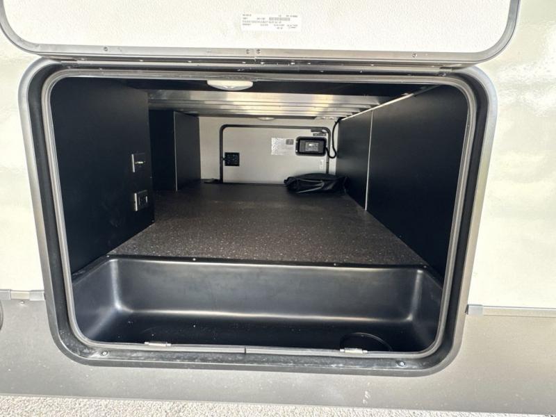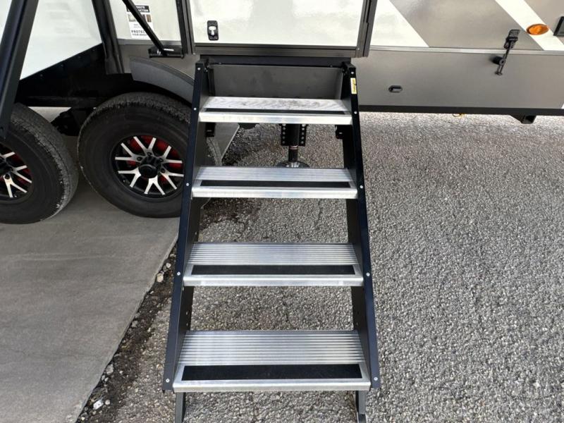 This well-designed layout offers both comfort and functionality. The 72" x 80" king bed provides a spacious and restful sleeping area in the main bedroom. Just steps away, the full front bathroom includes a shower seat for added accessibility, while a convenient half bath near the entrance is perfect for quick use. The kitchen features solid surface countertops and a large island, giving the cook plenty of room to move and work comfortably, along with a rotating table and chairs for dinner and board games. A pull-out desk creates a dedicated space for working away from home, and the 76" hide-a-bed adds extra sleeping space for the whole gang.
