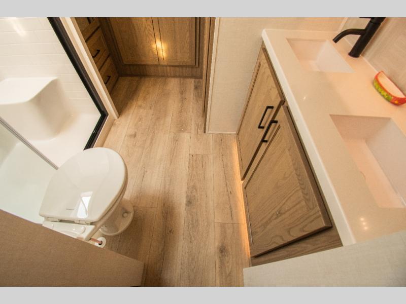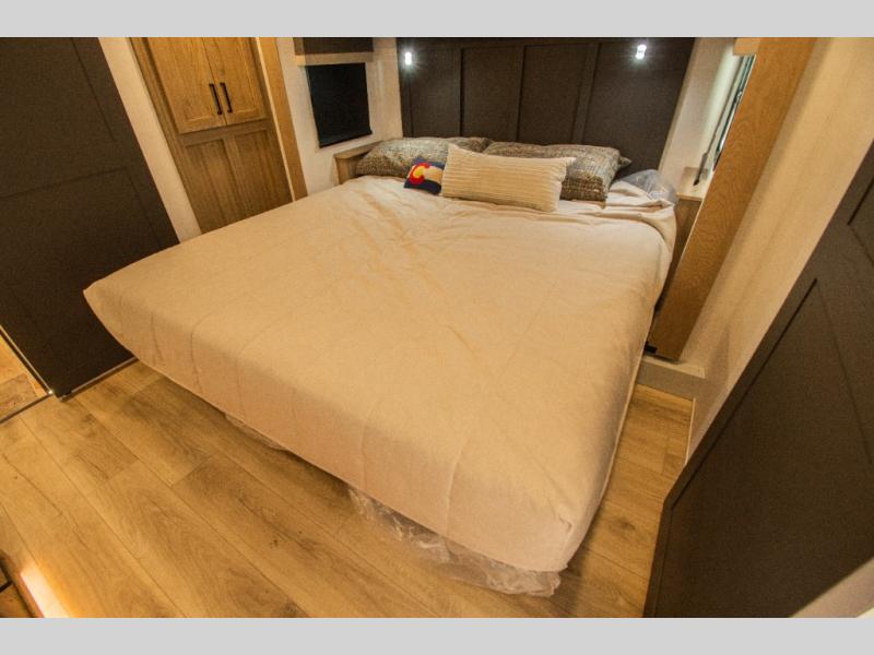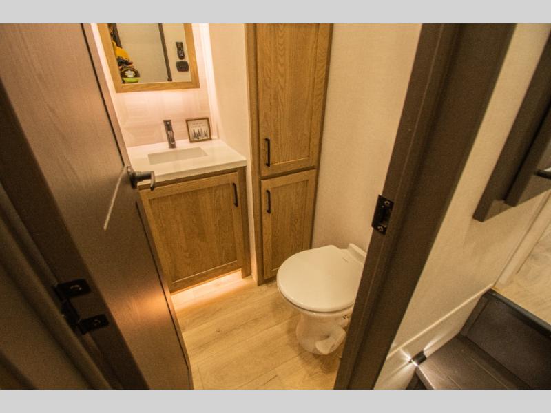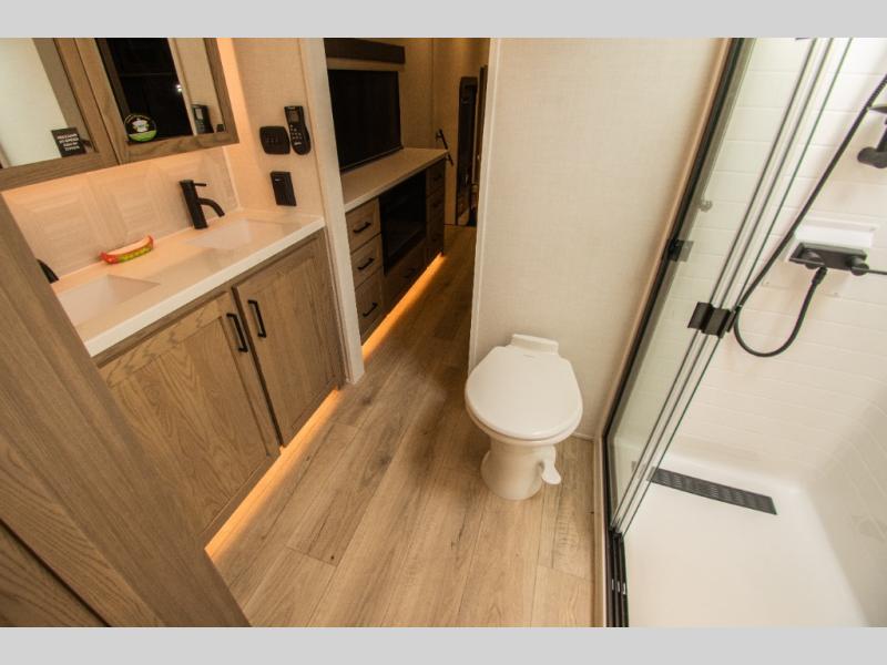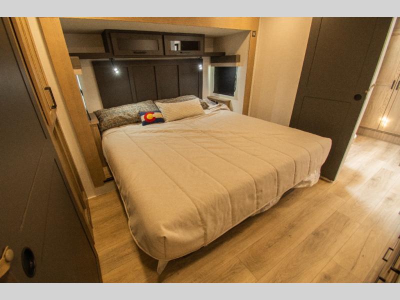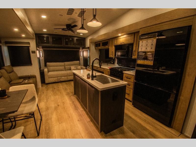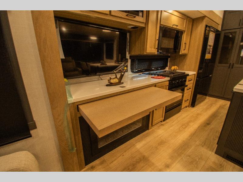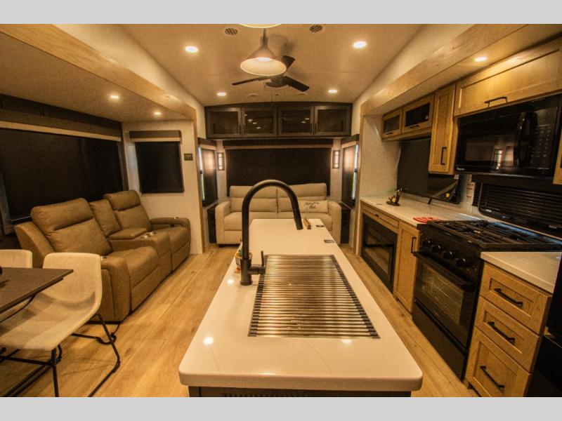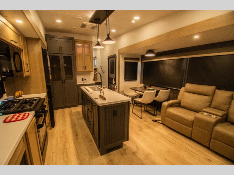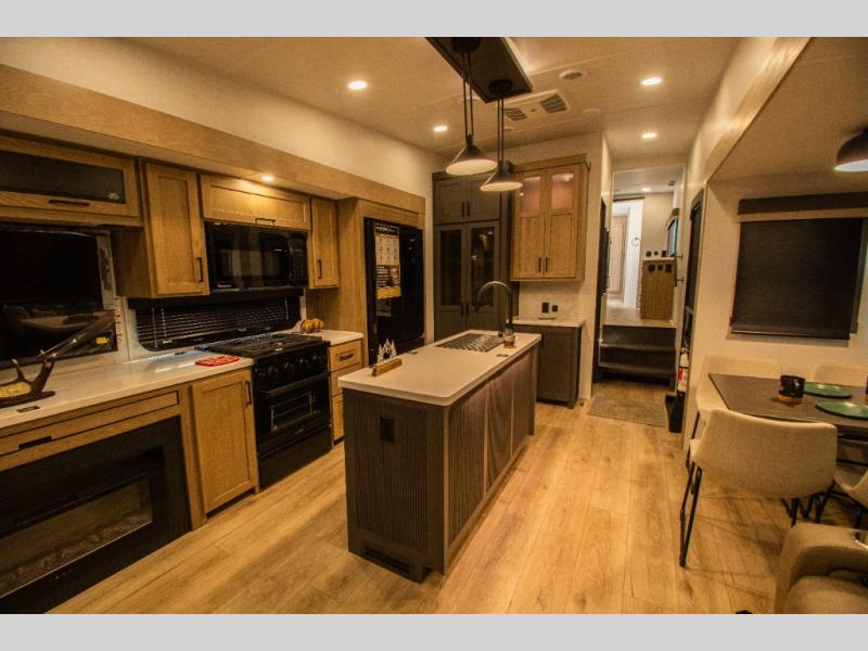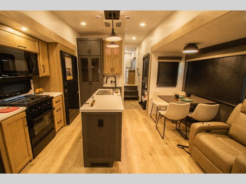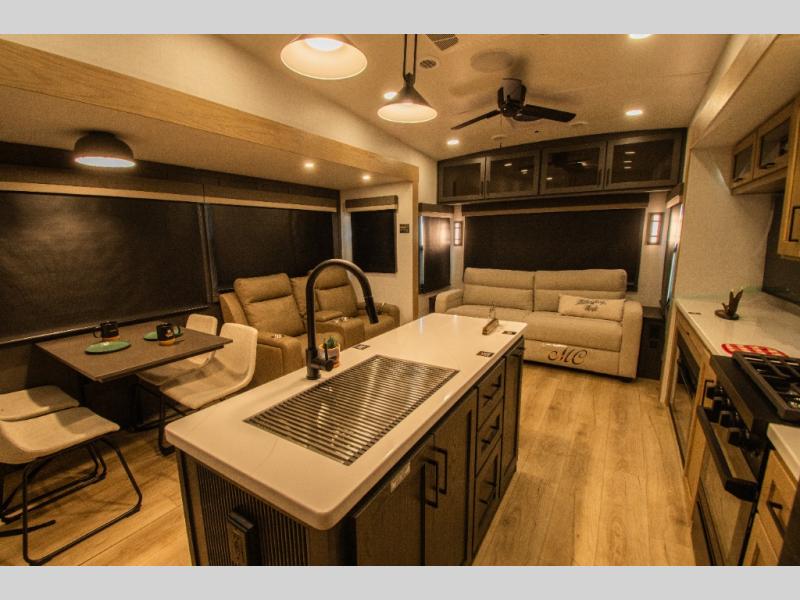 This well-designed layout offers both comfort and functionality. The 72" x 80" king bed provides a spacious and restful sleeping area in the main bedroom. Just steps away, the full front bathroom includes a shower seat for added accessibility, while a convenient half bath near the entrance is perfect for quick use. The kitchen features solid surface countertops and a large island, giving the cook plenty of room to move and work comfortably, along with a rotating table and chairs for dinner and board games. A pull-out desk creates a dedicated space for working away from home, and the 76" hide-a-bed adds extra sleeping space for the whole gang.