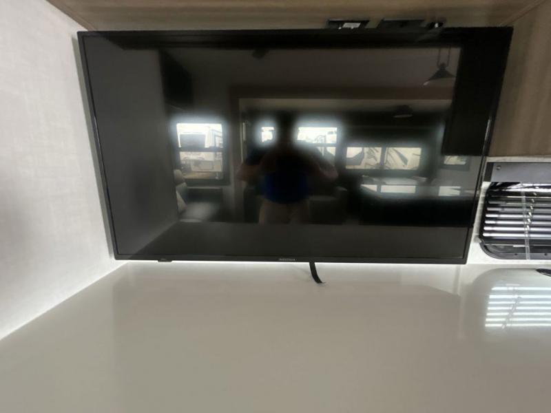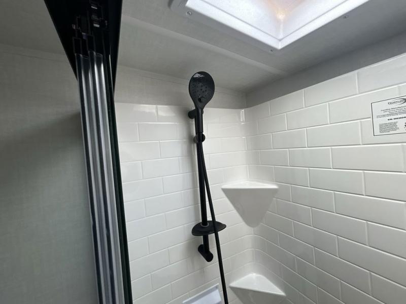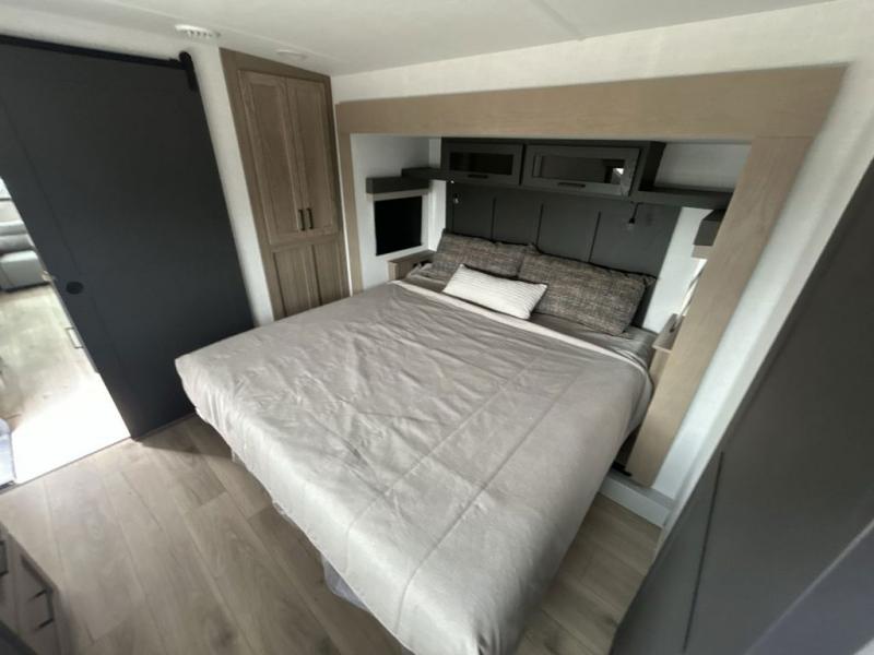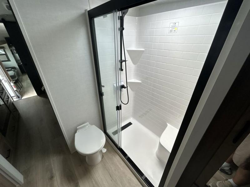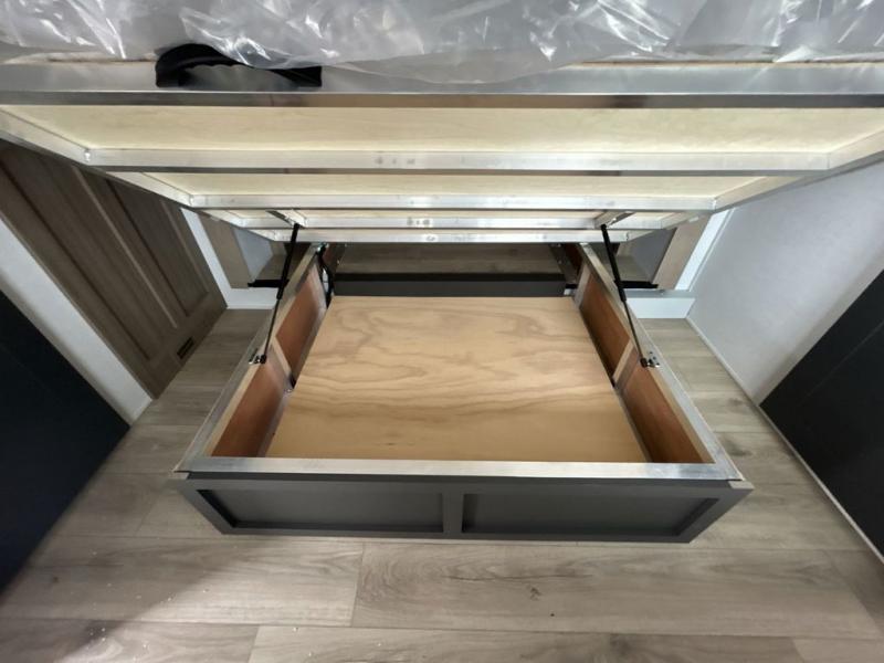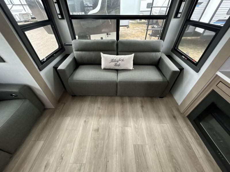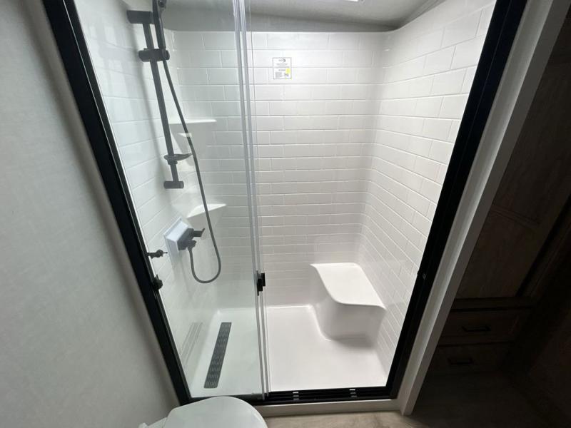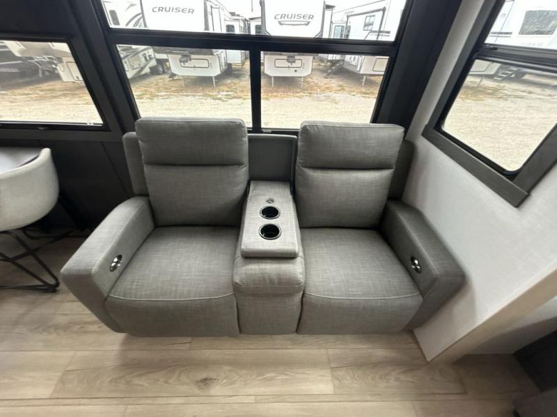 This well-designed layout offers both comfort and functionality. The 72" x 80" king bed provides a spacious and restful sleeping area in the main bedroom. Just steps away, the full front bathroom includes a shower seat for added accessibility, while a convenient half bath near the entrance is perfect for quick use. The kitchen features solid surface countertops and a large island, giving the cook plenty of room to move and work comfortably, along with a rotating table and chairs for dinner and board games. A pull-out desk creates a dedicated space for working away from home, and the 76" hide-a-bed adds extra sleeping space for the whole gang.