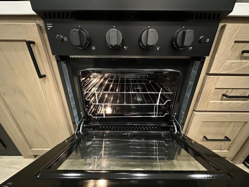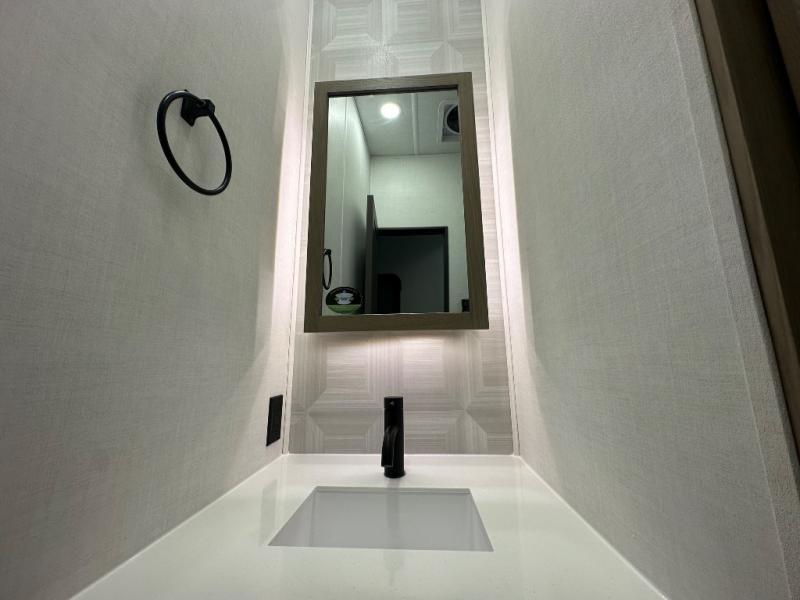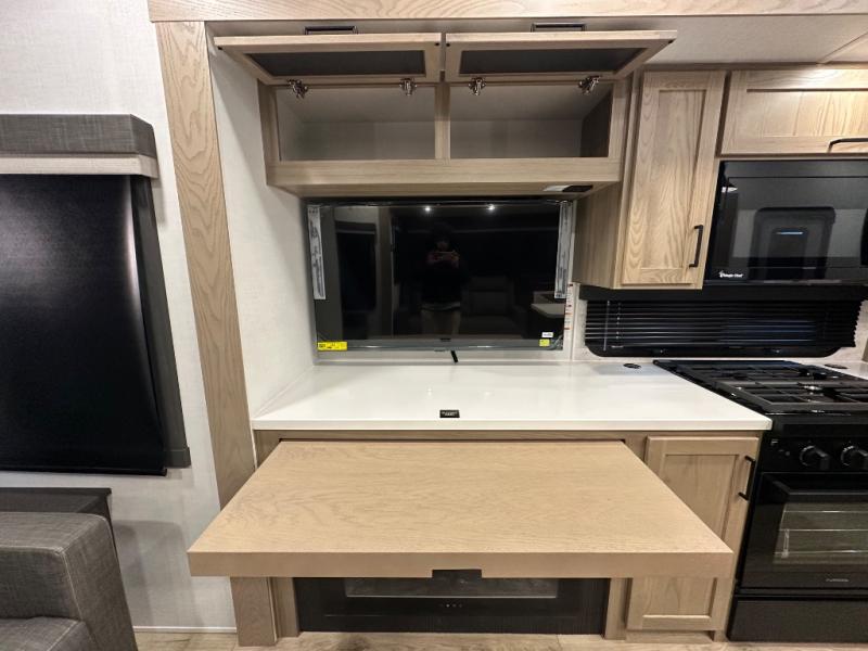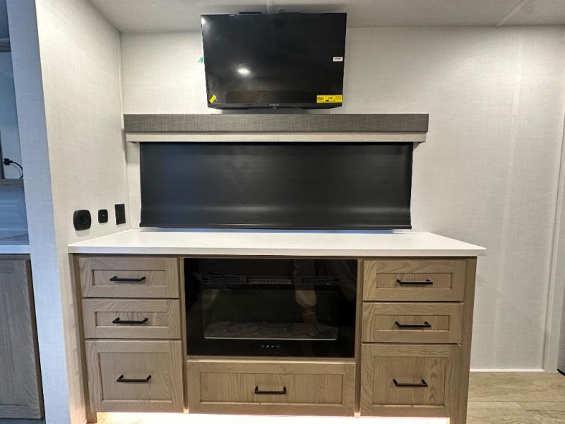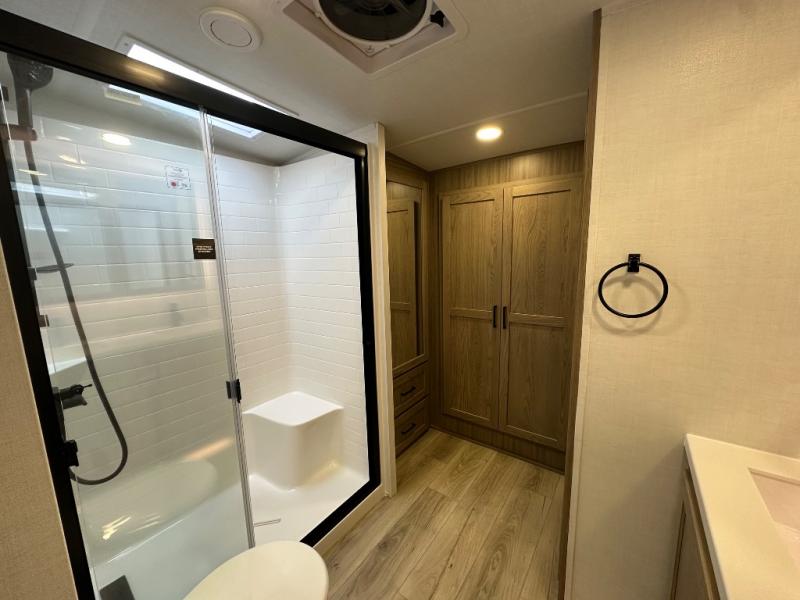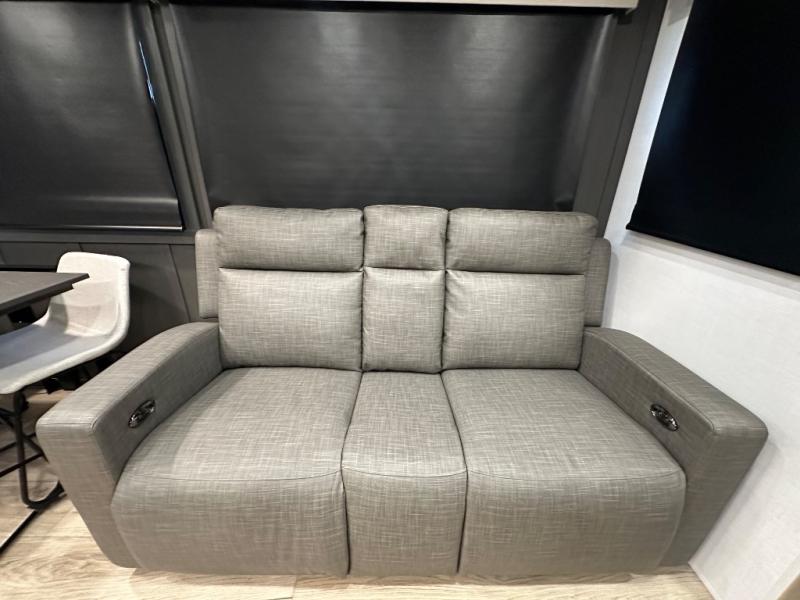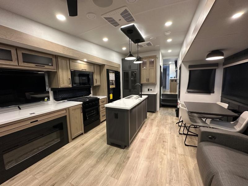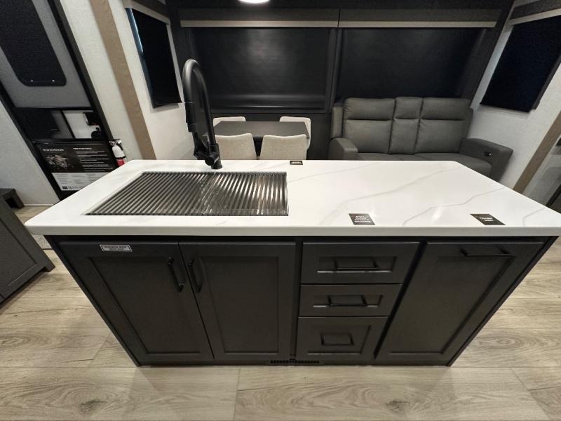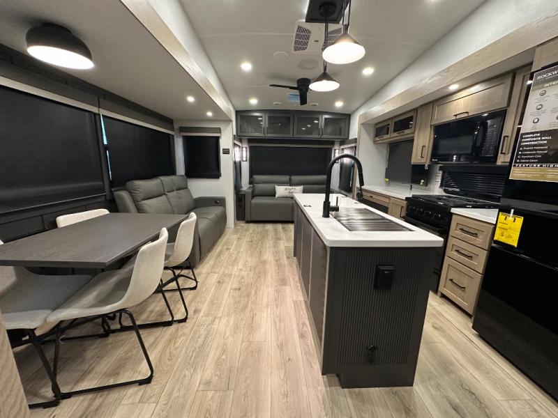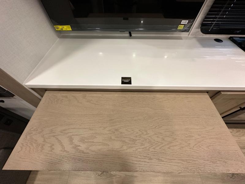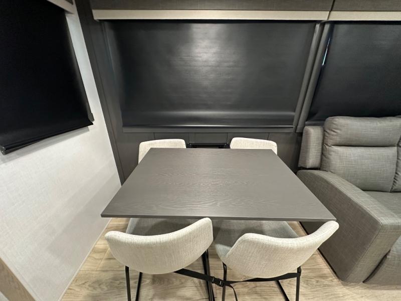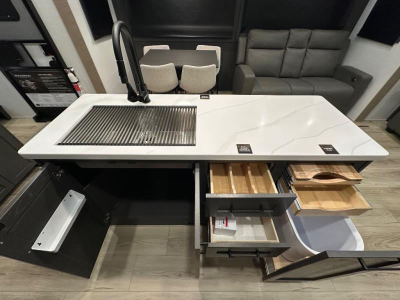 This well-designed layout offers both comfort and functionality. The 72" x 80" king bed provides a spacious and restful sleeping area in the main bedroom. Just steps away, the full front bathroom includes a shower seat for added accessibility, while a convenient half bath near the entrance is perfect for quick use. The kitchen features solid surface countertops and a large island, giving the cook plenty of room to move and work comfortably, along with a rotating table and chairs for dinner and board games. A pull-out desk creates a dedicated space for working away from home, and the 76" hide-a-bed adds extra sleeping space for the whole gang.