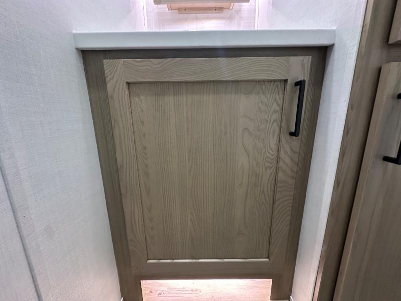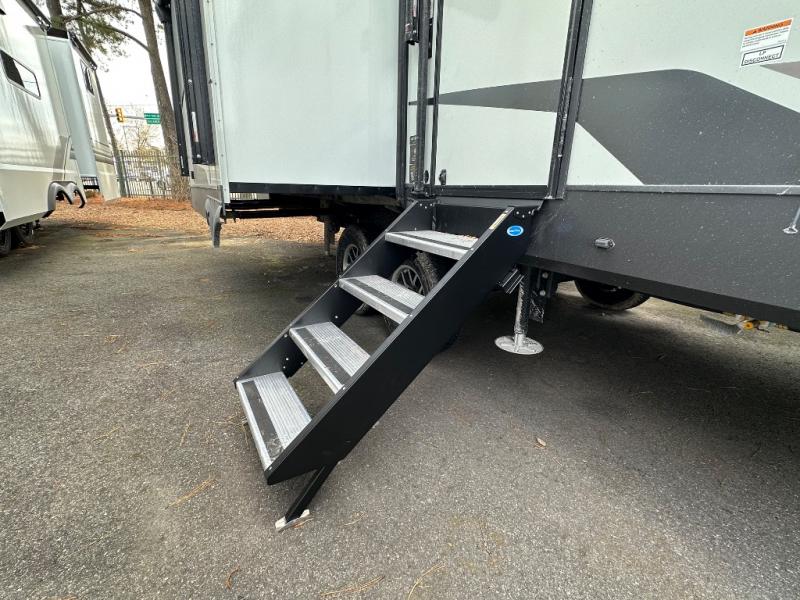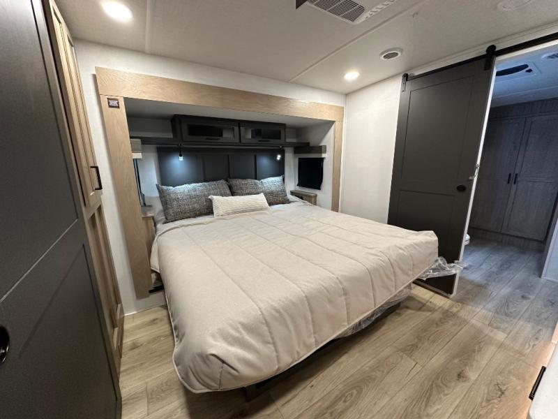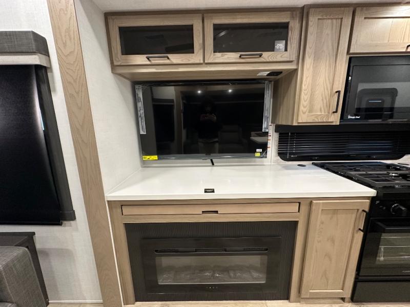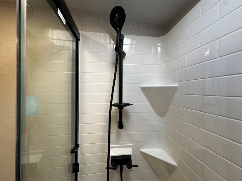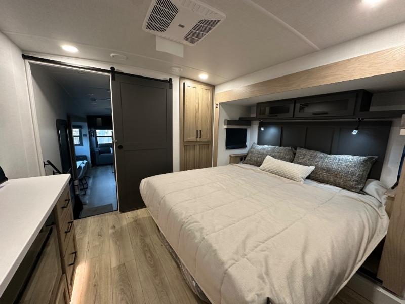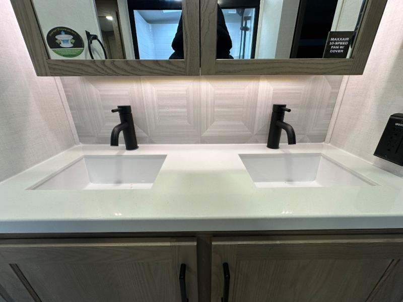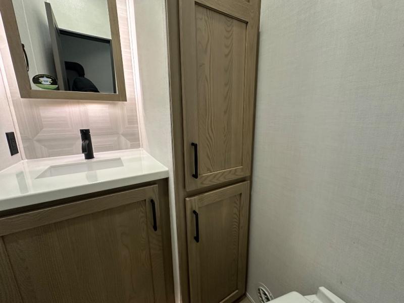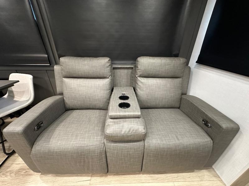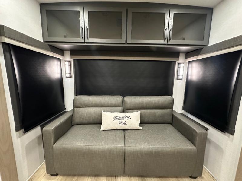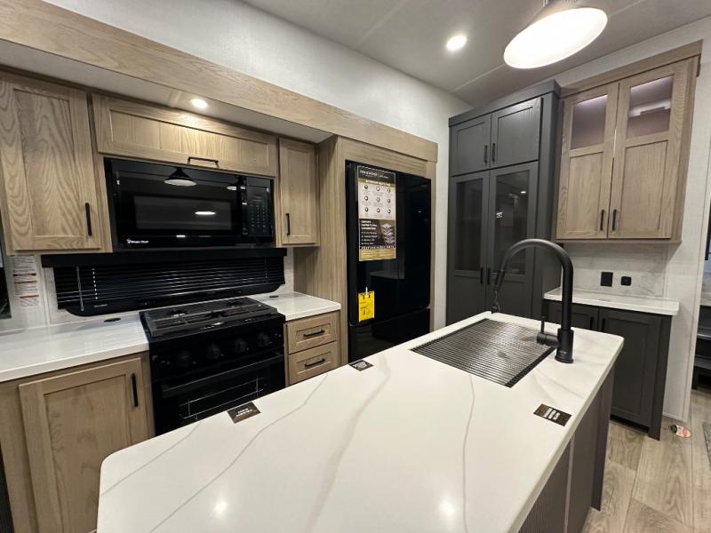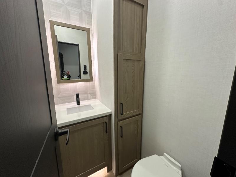 This well-designed layout offers both comfort and functionality. The 72" x 80" king bed provides a spacious and restful sleeping area in the main bedroom. Just steps away, the full front bathroom includes a shower seat for added accessibility, while a convenient half bath near the entrance is perfect for quick use. The kitchen features solid surface countertops and a large island, giving the cook plenty of room to move and work comfortably, along with a rotating table and chairs for dinner and board games. A pull-out desk creates a dedicated space for working away from home, and the 76" hide-a-bed adds extra sleeping space for the whole gang.