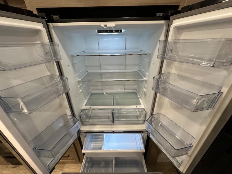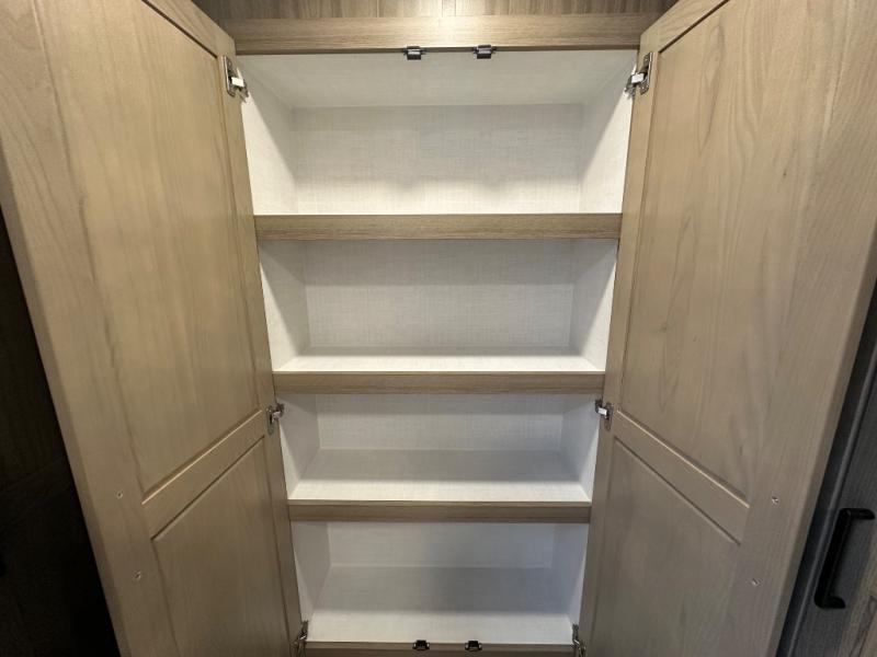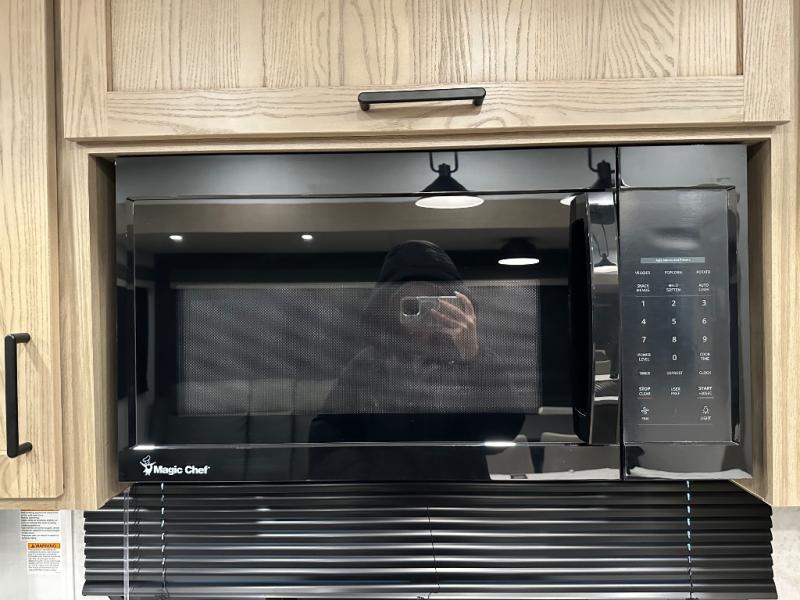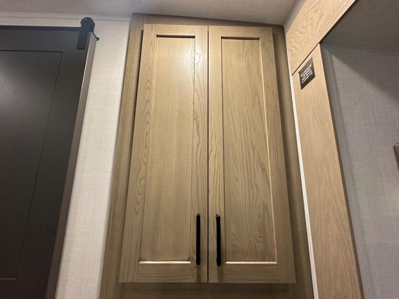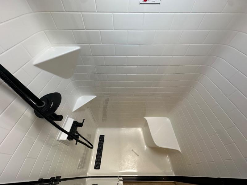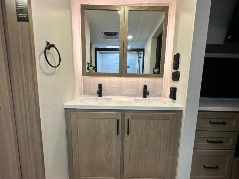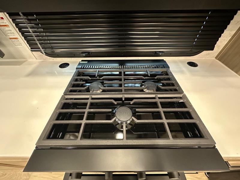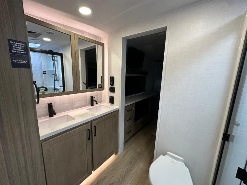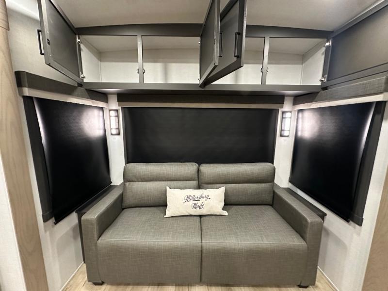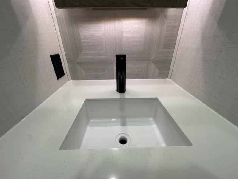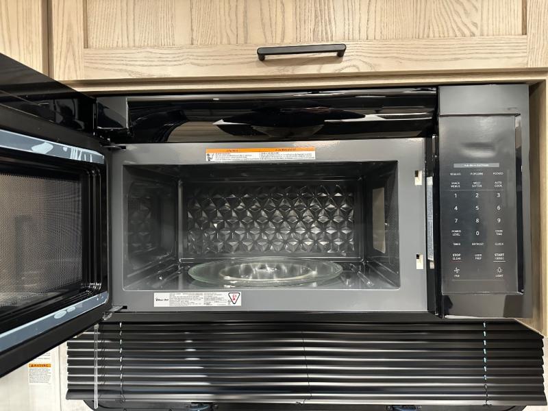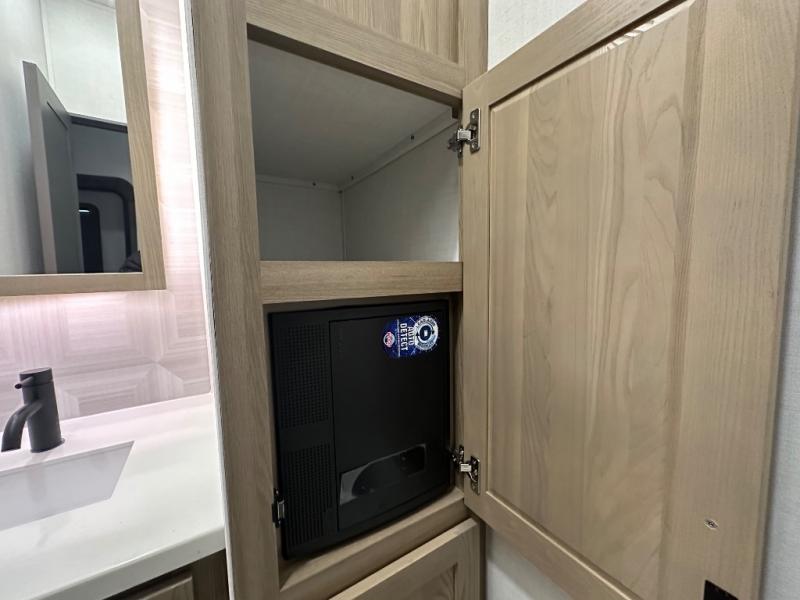 This well-designed layout offers both comfort and functionality. The 72" x 80" king bed provides a spacious and restful sleeping area in the main bedroom. Just steps away, the full front bathroom includes a shower seat for added accessibility, while a convenient half bath near the entrance is perfect for quick use. The kitchen features solid surface countertops and a large island, giving the cook plenty of room to move and work comfortably, along with a rotating table and chairs for dinner and board games. A pull-out desk creates a dedicated space for working away from home, and the 76" hide-a-bed adds extra sleeping space for the whole gang.
