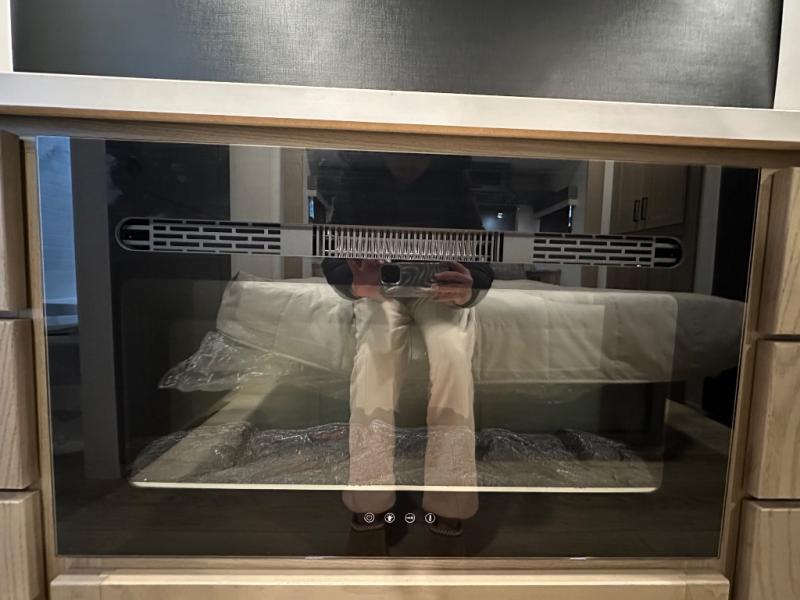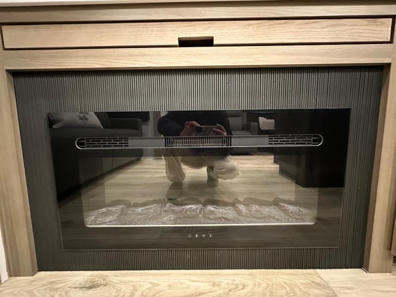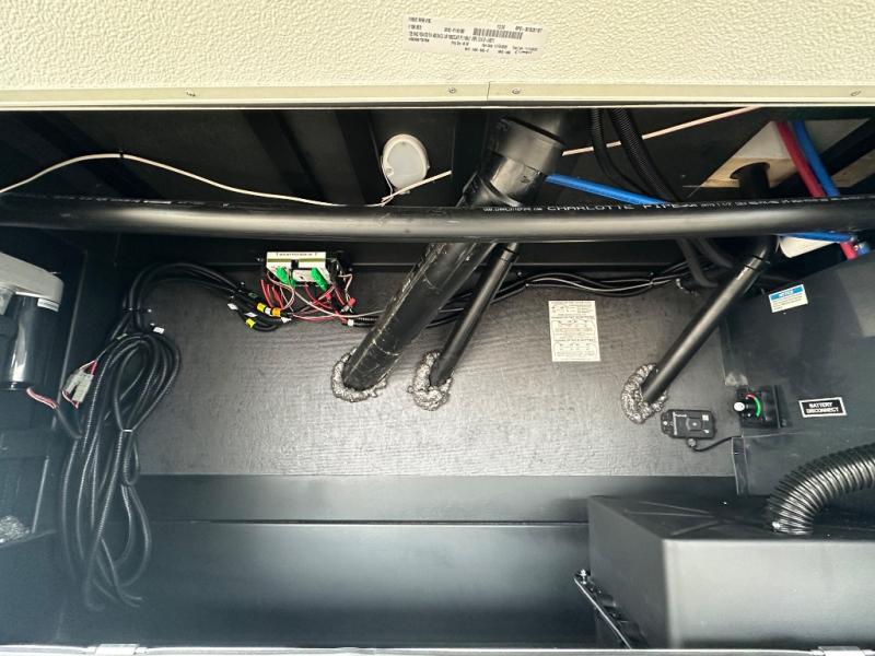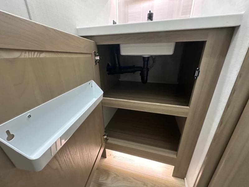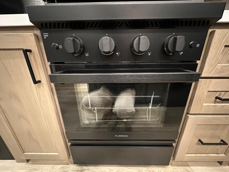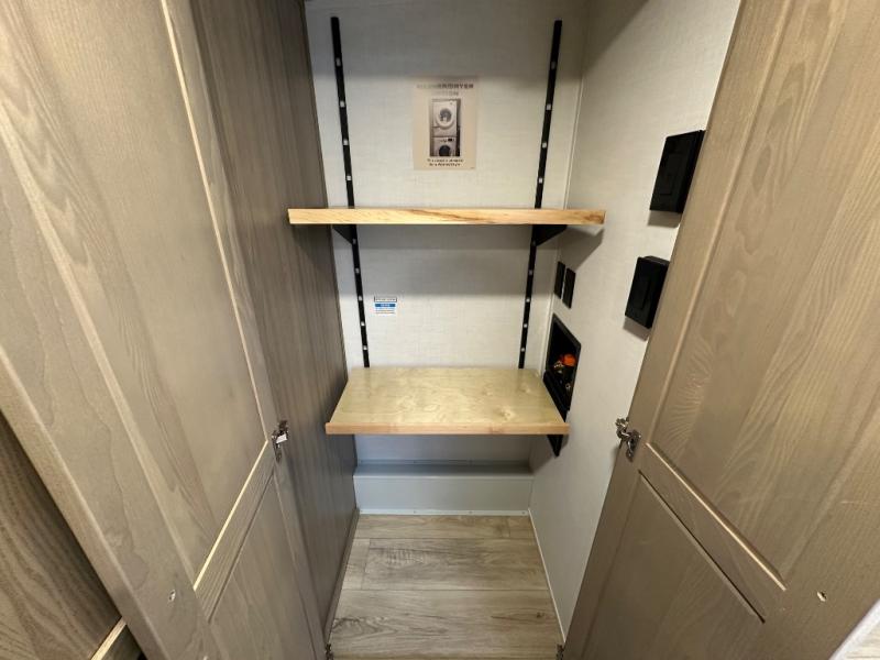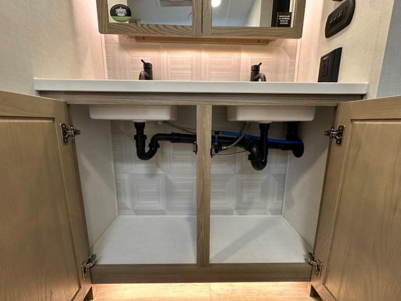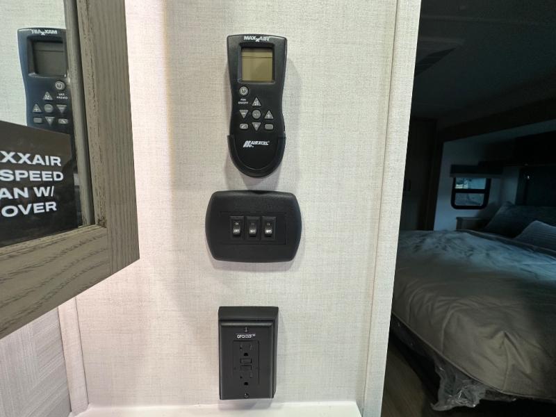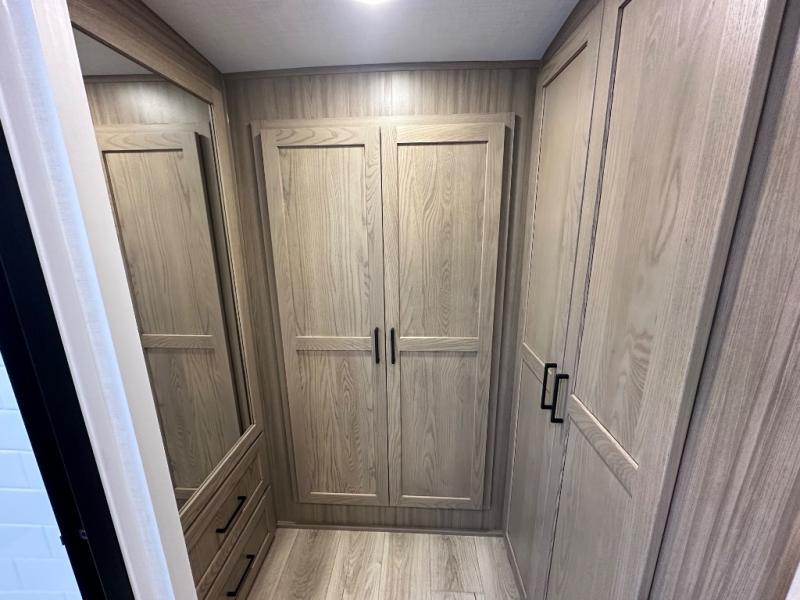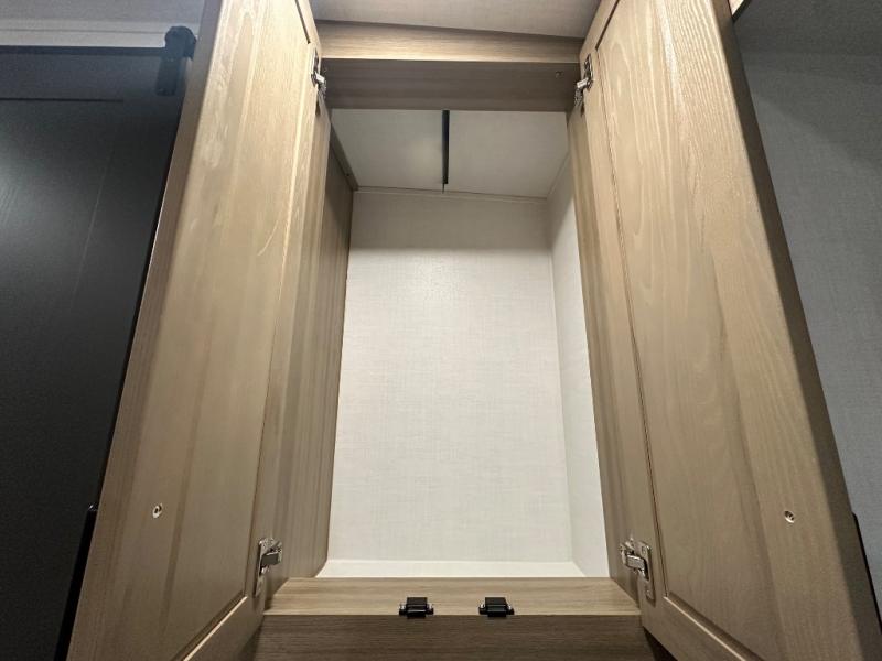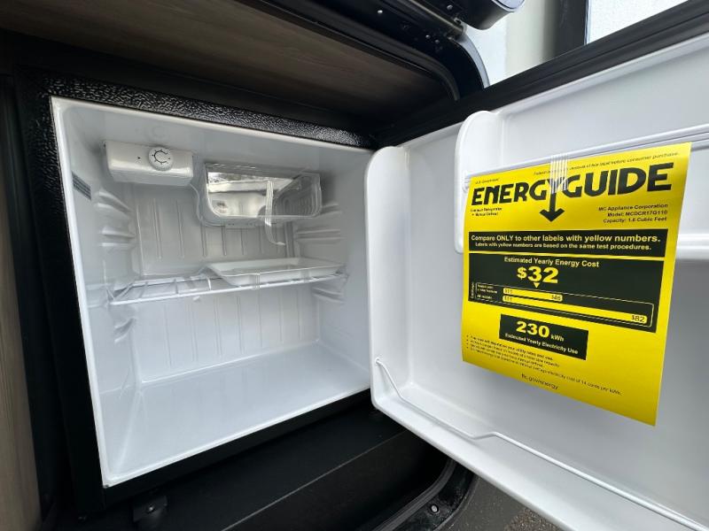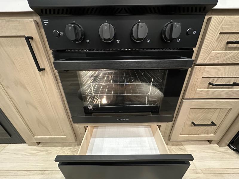 This well-designed layout offers both comfort and functionality. The 72" x 80" king bed provides a spacious and restful sleeping area in the main bedroom. Just steps away, the full front bathroom includes a shower seat for added accessibility, while a convenient half bath near the entrance is perfect for quick use. The kitchen features solid surface countertops and a large island, giving the cook plenty of room to move and work comfortably, along with a rotating table and chairs for dinner and board games. A pull-out desk creates a dedicated space for working away from home, and the 76" hide-a-bed adds extra sleeping space for the whole gang.
