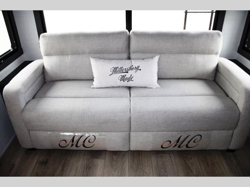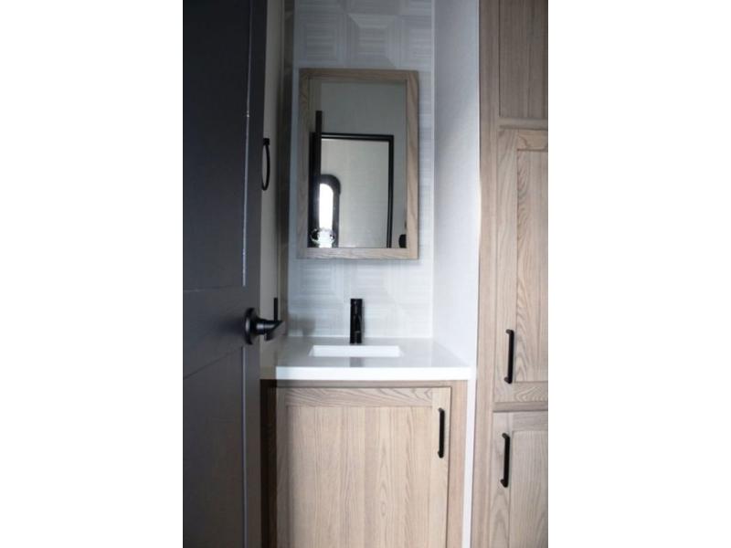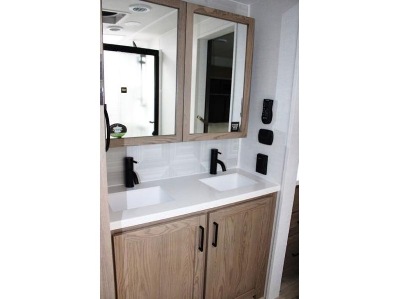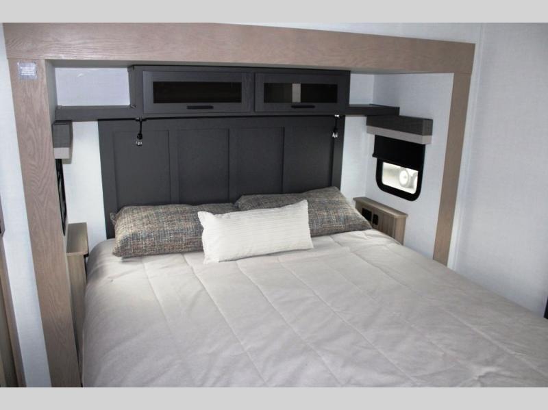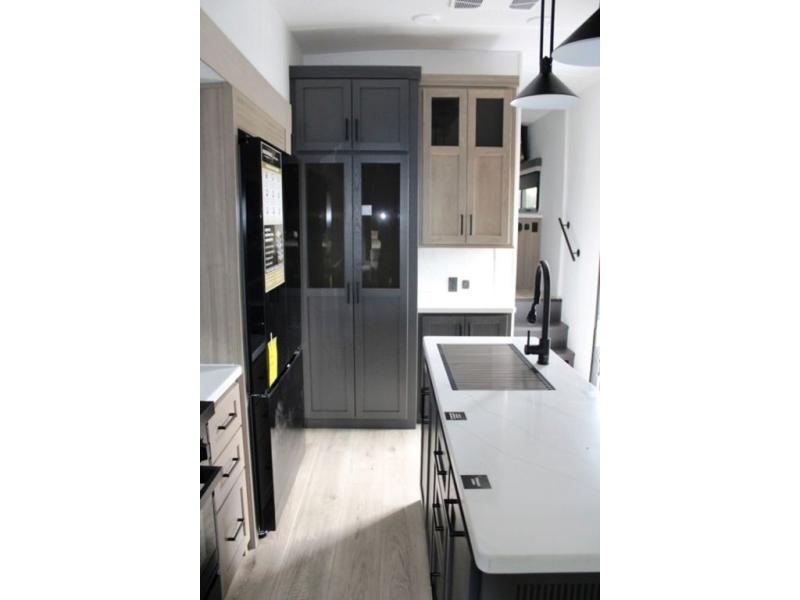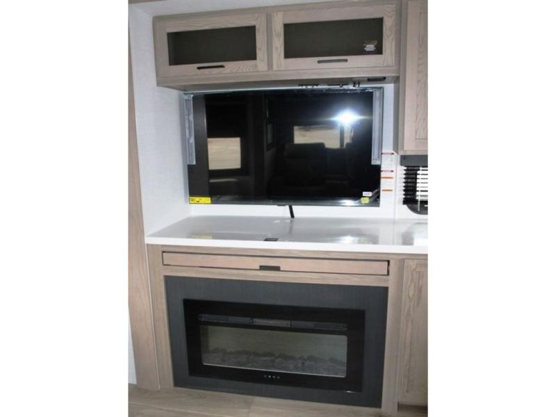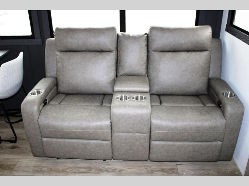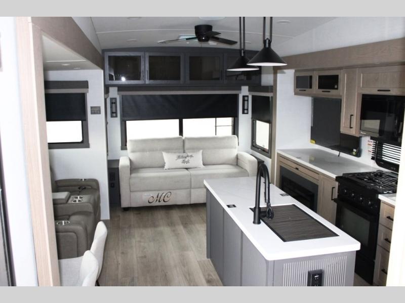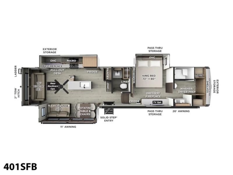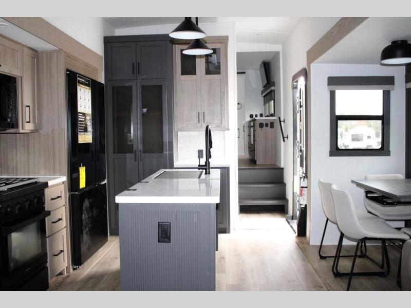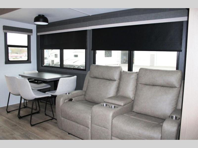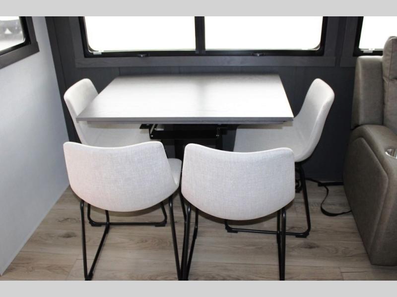 This well-designed layout offers both comfort and functionality. The 72" x 80" king bed provides a spacious and restful sleeping area in the main bedroom. Just steps away, the full front bathroom includes a shower seat for added accessibility, while a convenient half bath near the entrance is perfect for quick use. The kitchen features solid surface countertops and a large island, giving the cook plenty of room to move and work comfortably, along with a rotating table and chairs for dinner and board games. A pull-out desk creates a dedicated space for working away from home, and the 76" hide-a-bed adds extra sleeping space for the whole gang.