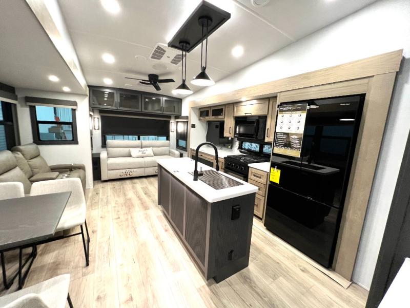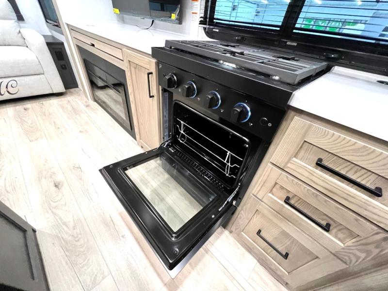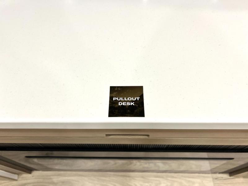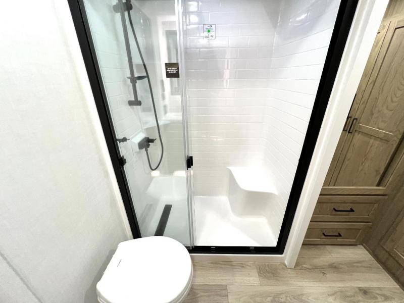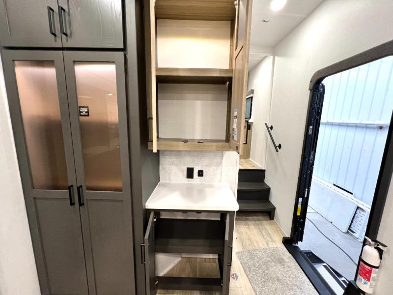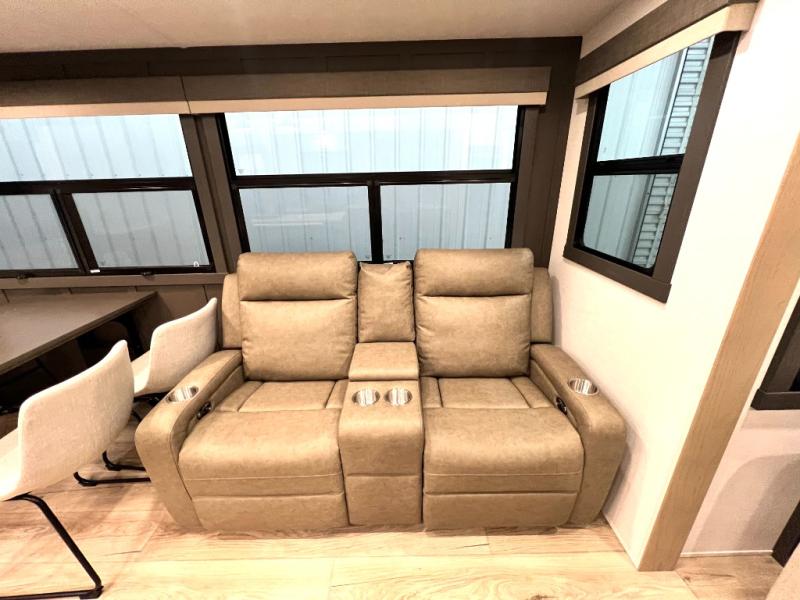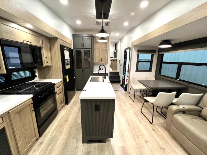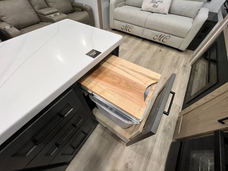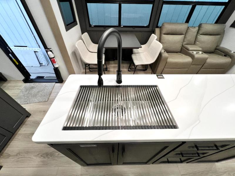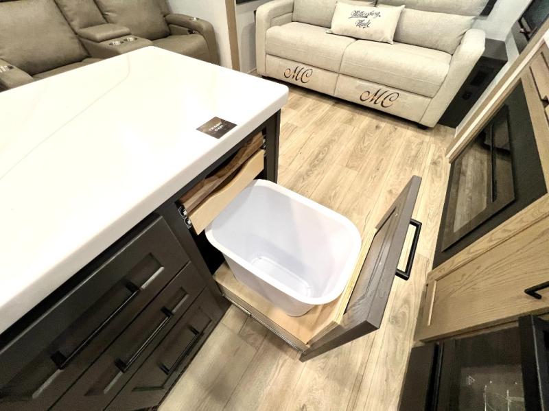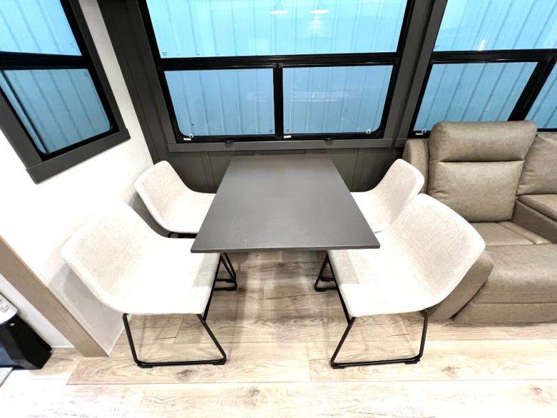 This well-designed layout offers both comfort and functionality. The 72" x 80" king bed provides a spacious and restful sleeping area in the main bedroom. Just steps away, the full front bathroom includes a shower seat for added accessibility, while a convenient half bath near the entrance is perfect for quick use. The kitchen features solid surface countertops and a large island, giving the cook plenty of room to move and work comfortably, along with a rotating table and chairs for dinner and board games. A pull-out desk creates a dedicated space for working away from home, and the 76" hide-a-bed adds extra sleeping space for the whole gang.