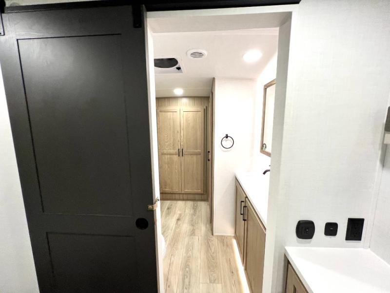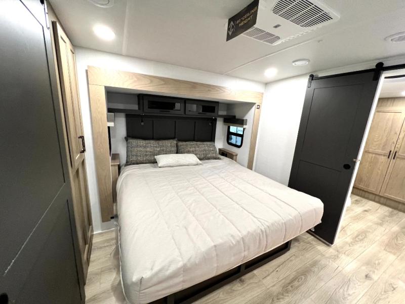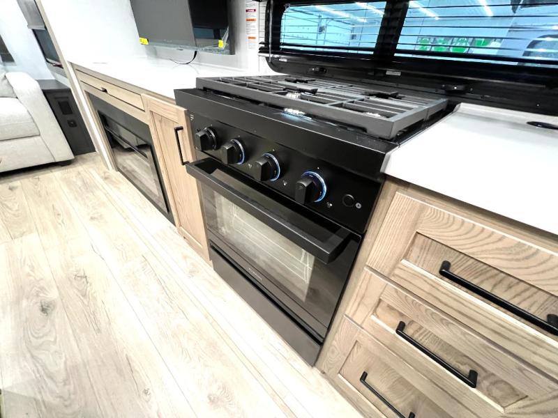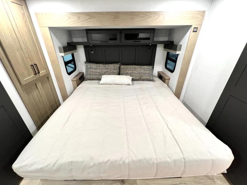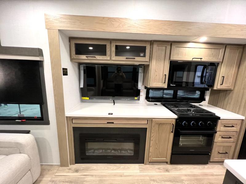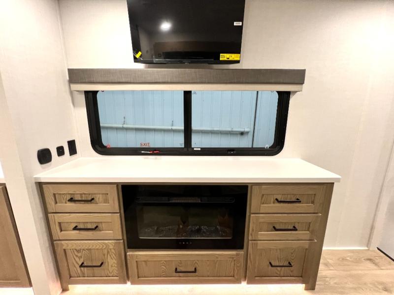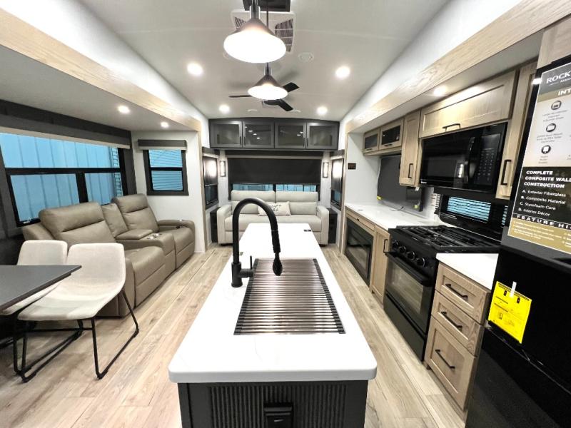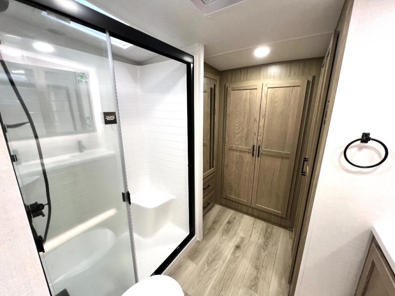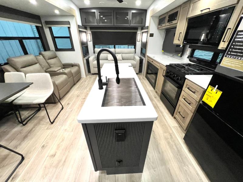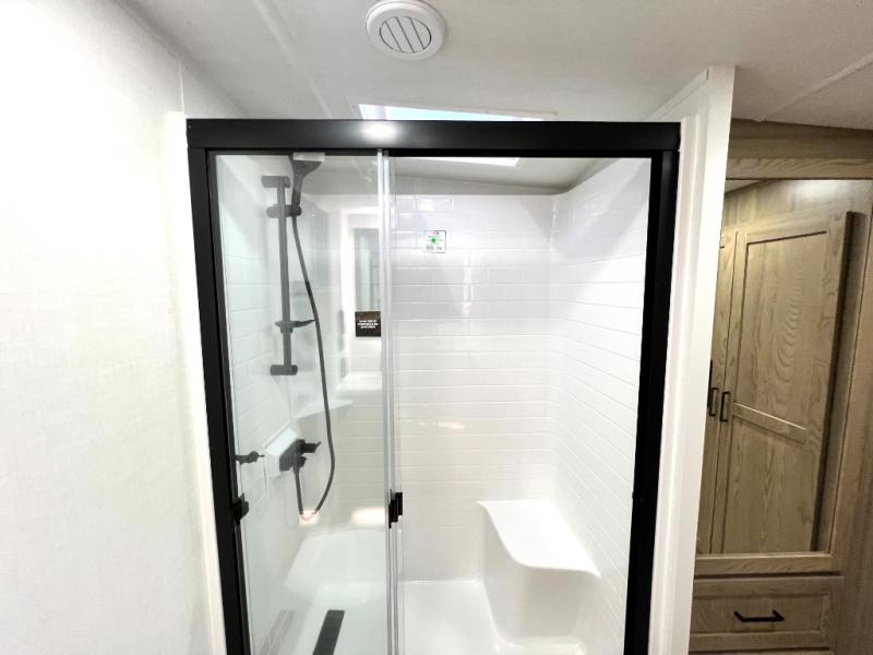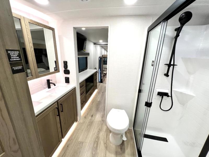 This well-designed layout offers both comfort and functionality. The 72" x 80" king bed provides a spacious and restful sleeping area in the main bedroom. Just steps away, the full front bathroom includes a shower seat for added accessibility, while a convenient half bath near the entrance is perfect for quick use. The kitchen features solid surface countertops and a large island, giving the cook plenty of room to move and work comfortably, along with a rotating table and chairs for dinner and board games. A pull-out desk creates a dedicated space for working away from home, and the 76" hide-a-bed adds extra sleeping space for the whole gang.