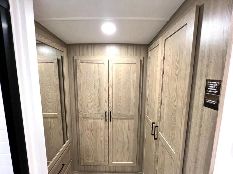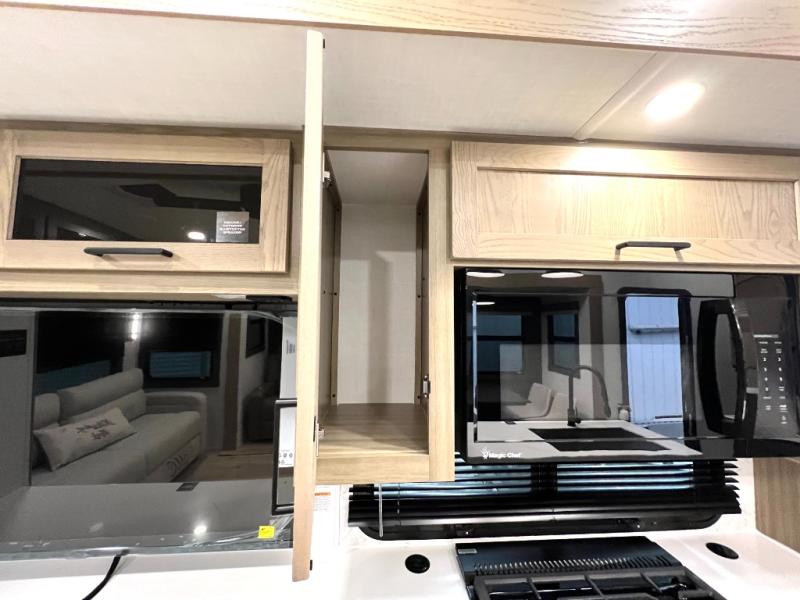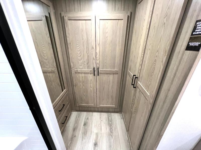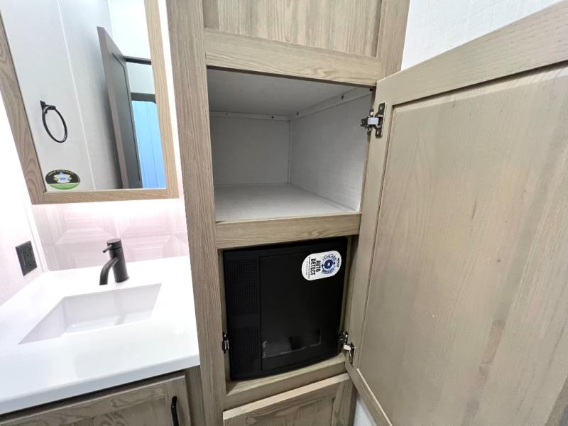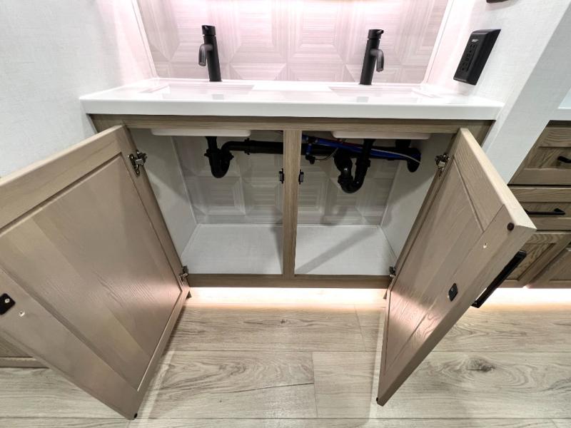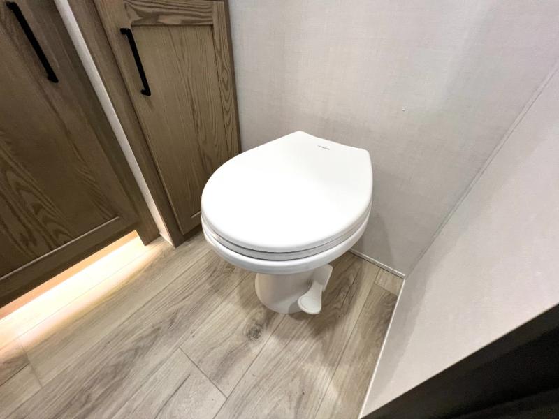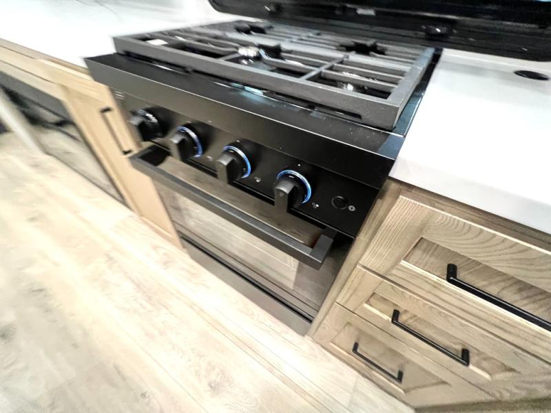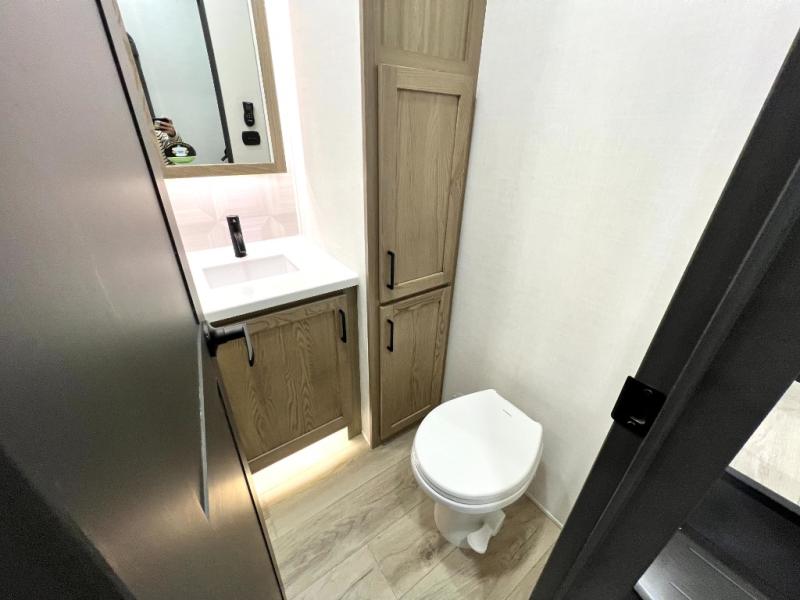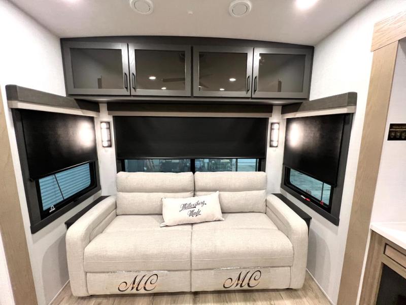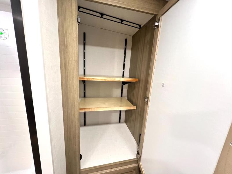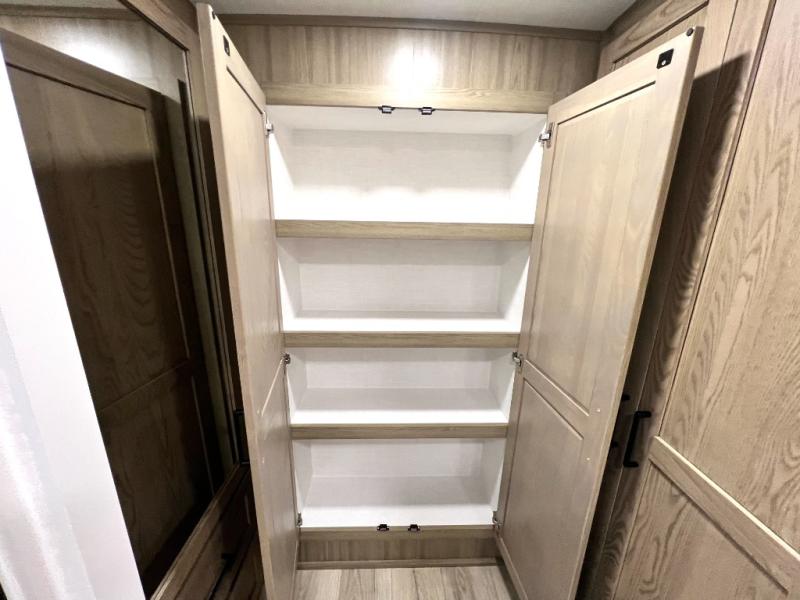 This well-designed layout offers both comfort and functionality. The 72" x 80" king bed provides a spacious and restful sleeping area in the main bedroom. Just steps away, the full front bathroom includes a shower seat for added accessibility, while a convenient half bath near the entrance is perfect for quick use. The kitchen features solid surface countertops and a large island, giving the cook plenty of room to move and work comfortably, along with a rotating table and chairs for dinner and board games. A pull-out desk creates a dedicated space for working away from home, and the 76" hide-a-bed adds extra sleeping space for the whole gang.