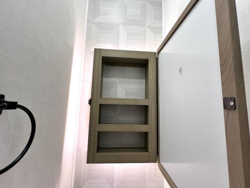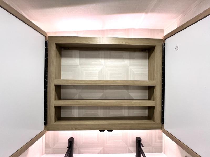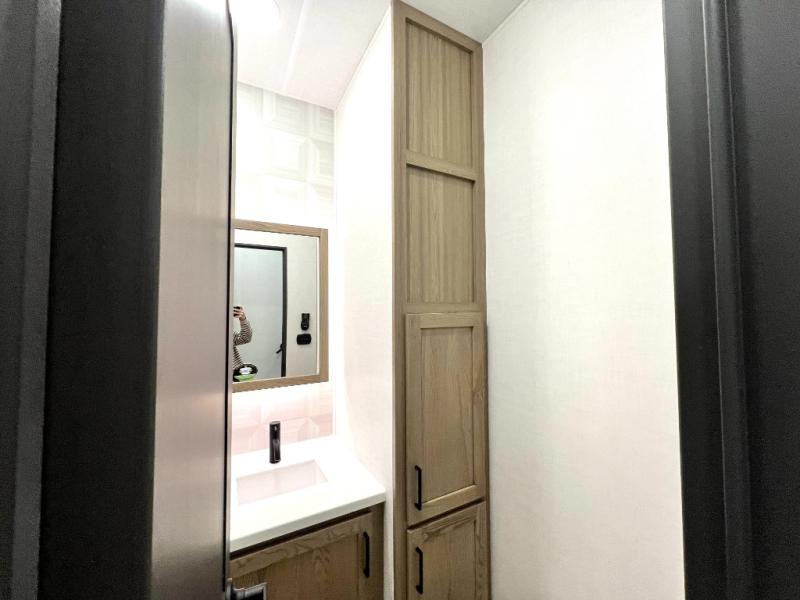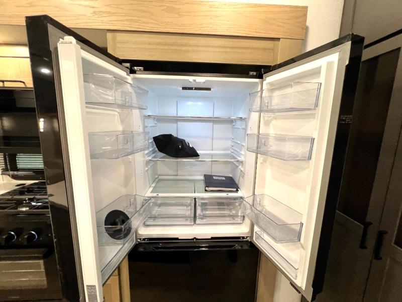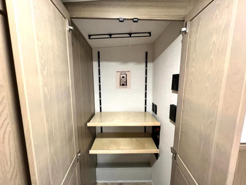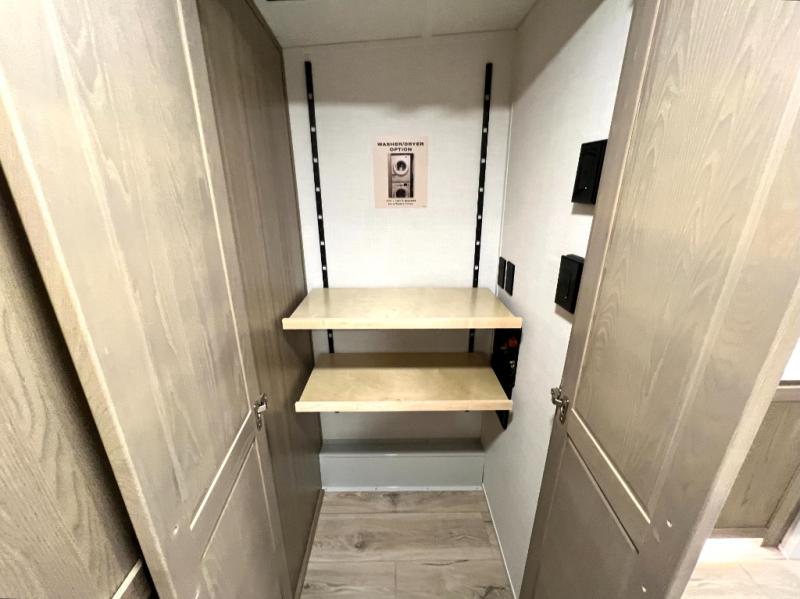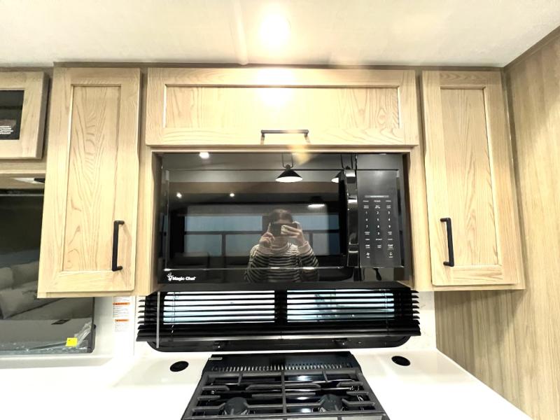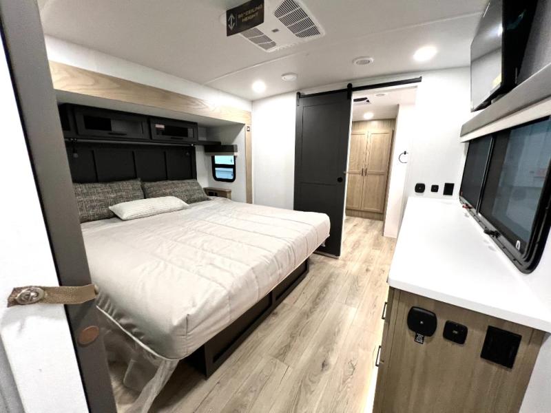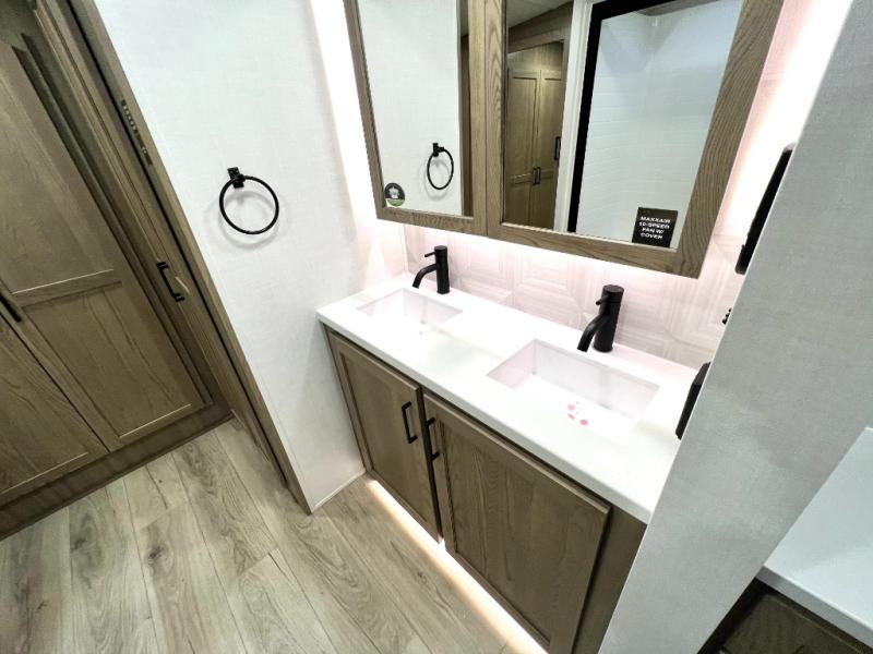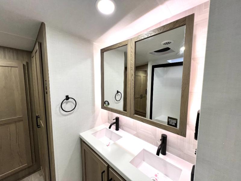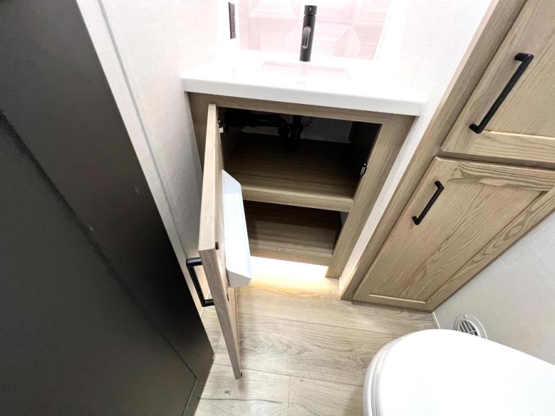 This well-designed layout offers both comfort and functionality. The 72" x 80" king bed provides a spacious and restful sleeping area in the main bedroom. Just steps away, the full front bathroom includes a shower seat for added accessibility, while a convenient half bath near the entrance is perfect for quick use. The kitchen features solid surface countertops and a large island, giving the cook plenty of room to move and work comfortably, along with a rotating table and chairs for dinner and board games. A pull-out desk creates a dedicated space for working away from home, and the 76" hide-a-bed adds extra sleeping space for the whole gang.