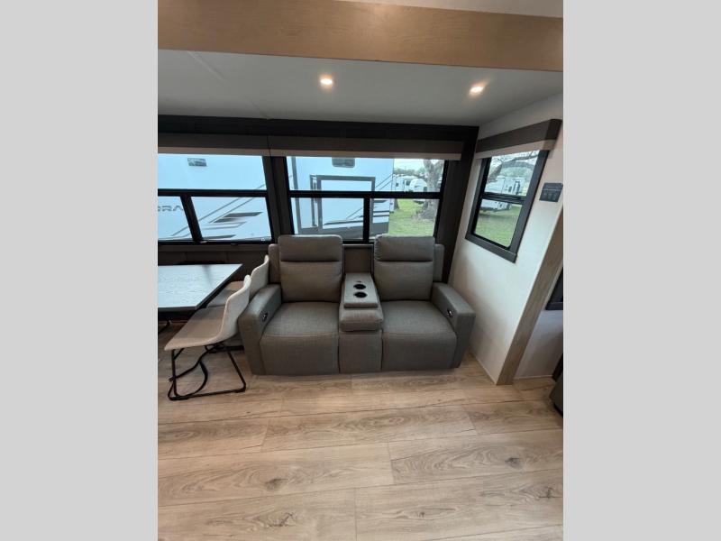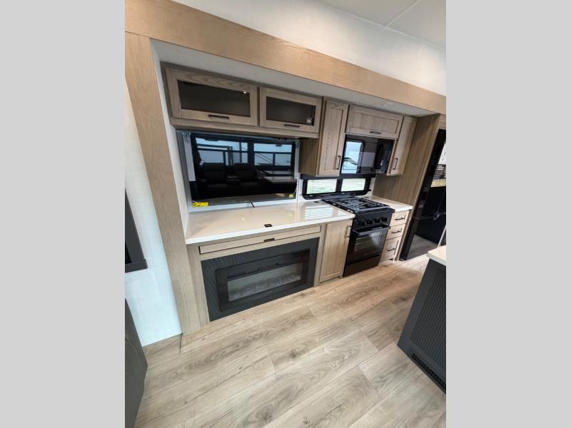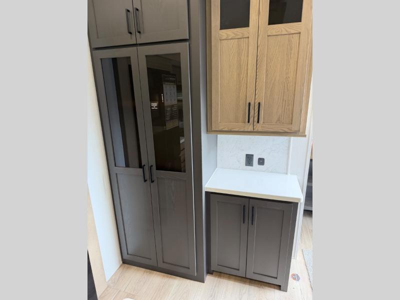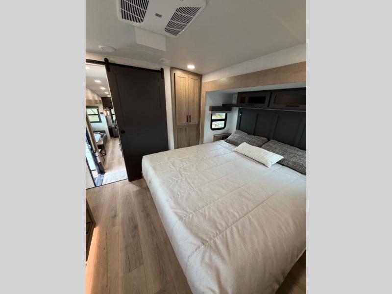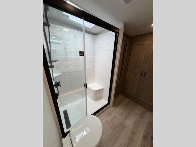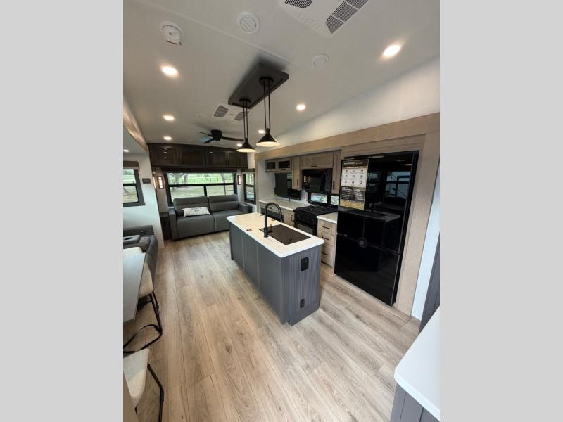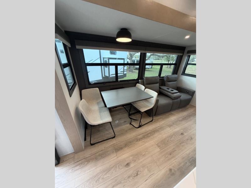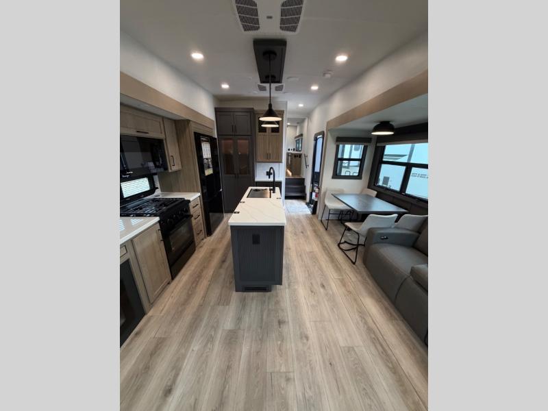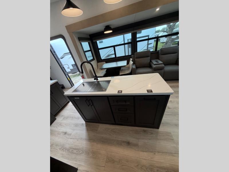 This well-designed layout offers both comfort and functionality. The 72" x 80" king bed provides a spacious and restful sleeping area in the main bedroom. Just steps away, the full front bathroom includes a shower seat for added accessibility, while a convenient half bath near the entrance is perfect for quick use. The kitchen features solid surface countertops and a large island, giving the cook plenty of room to move and work comfortably, along with a rotating table and chairs for dinner and board games. A pull-out desk creates a dedicated space for working away from home, and the 76" hide-a-bed adds extra sleeping space for the whole gang.