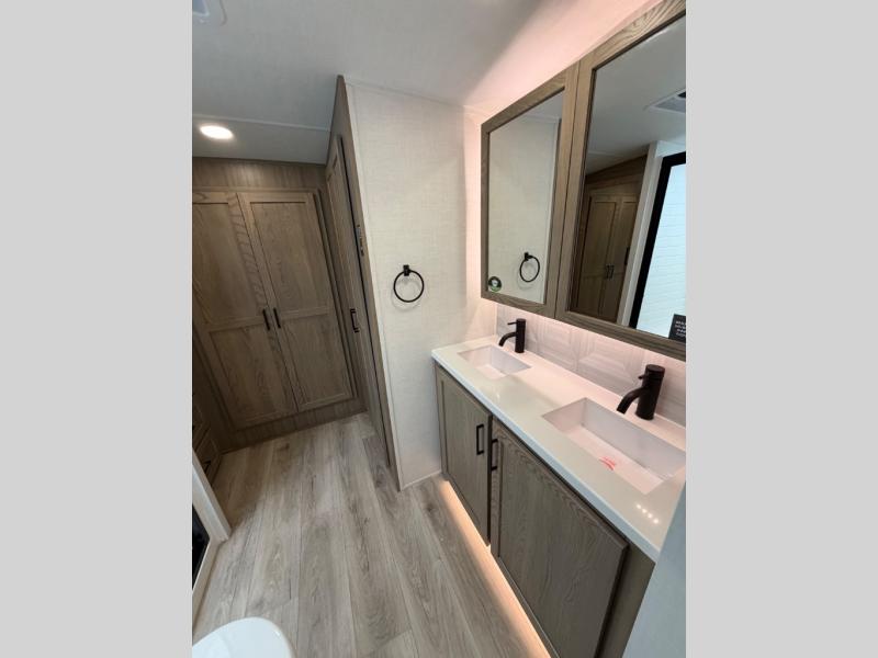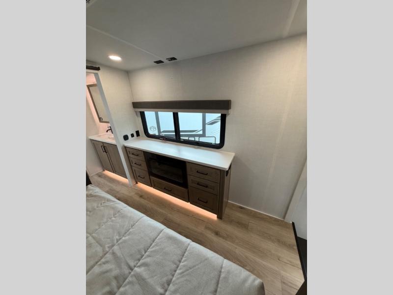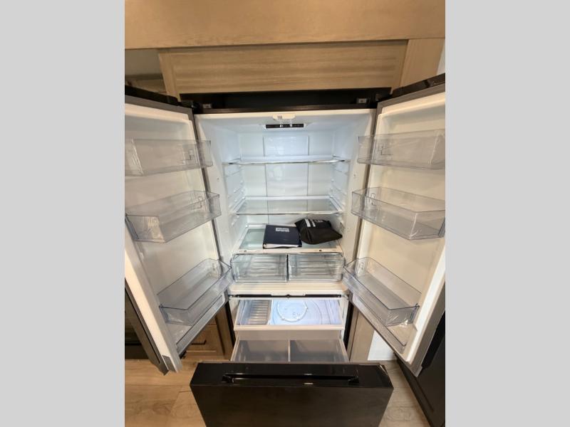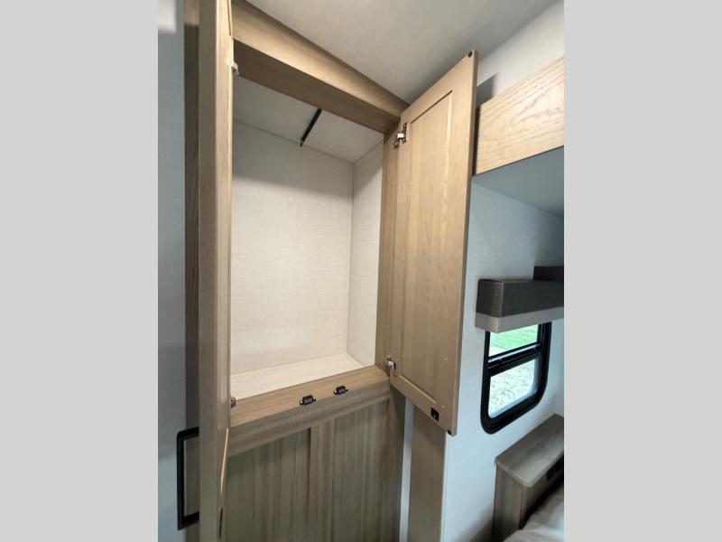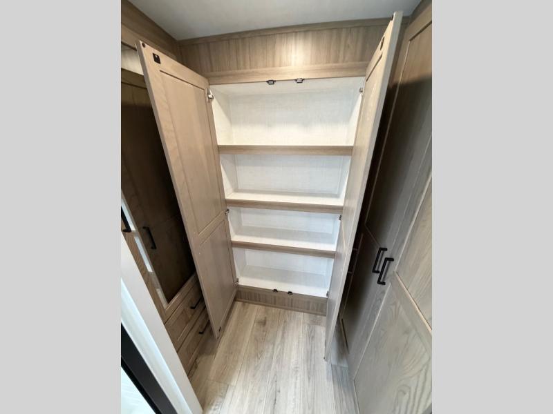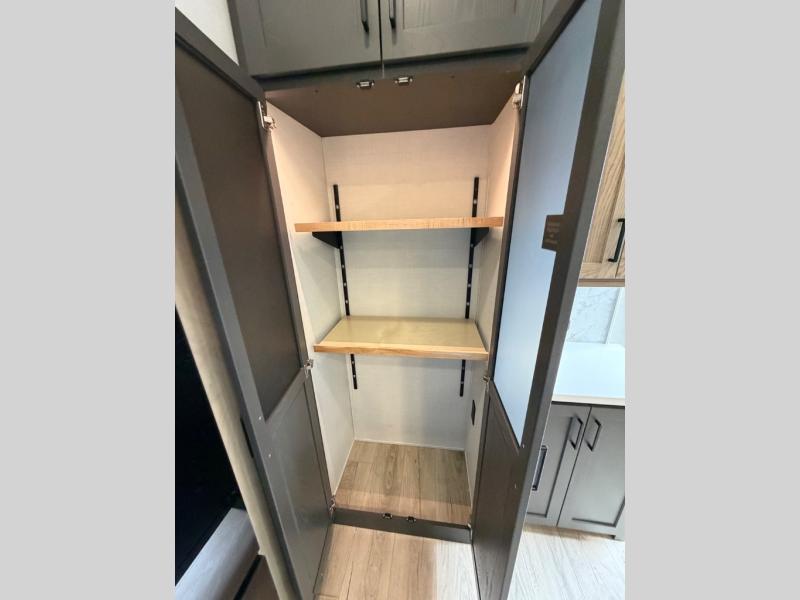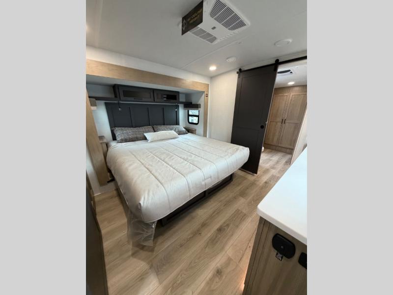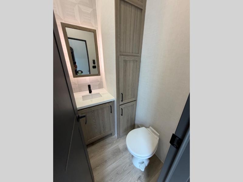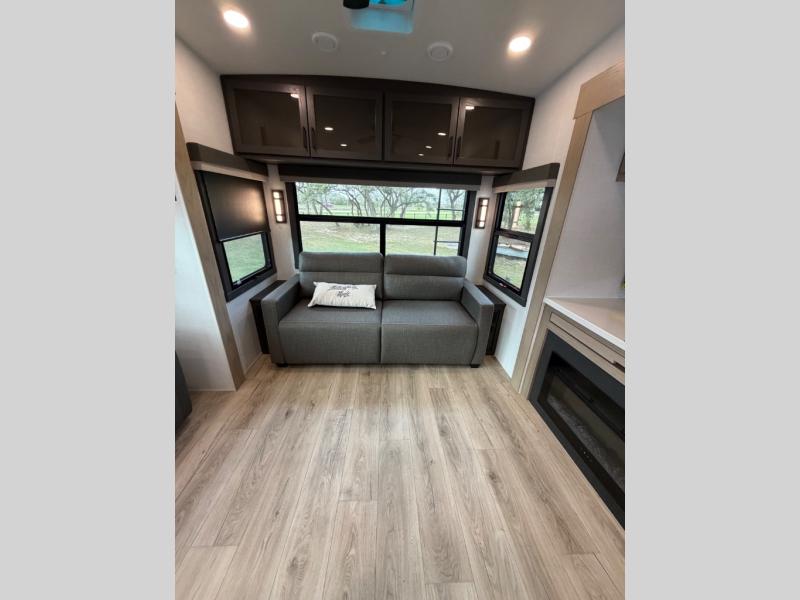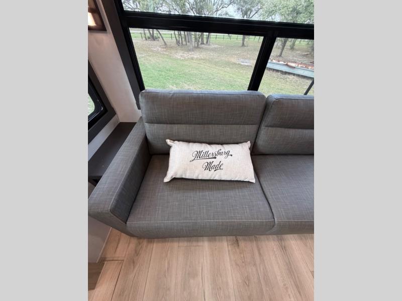 This well-designed layout offers both comfort and functionality. The 72" x 80" king bed provides a spacious and restful sleeping area in the main bedroom. Just steps away, the full front bathroom includes a shower seat for added accessibility, while a convenient half bath near the entrance is perfect for quick use. The kitchen features solid surface countertops and a large island, giving the cook plenty of room to move and work comfortably, along with a rotating table and chairs for dinner and board games. A pull-out desk creates a dedicated space for working away from home, and the 76" hide-a-bed adds extra sleeping space for the whole gang.