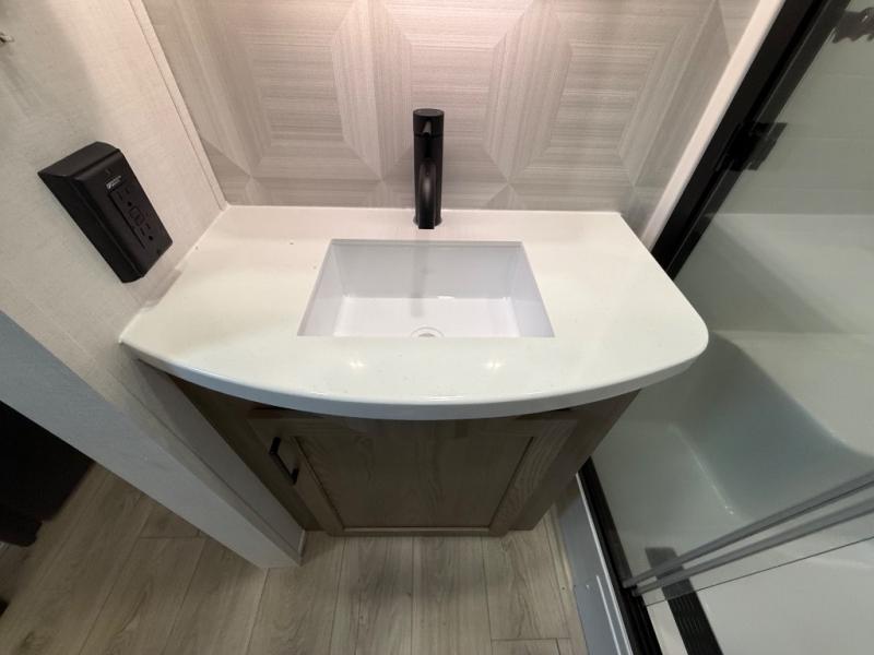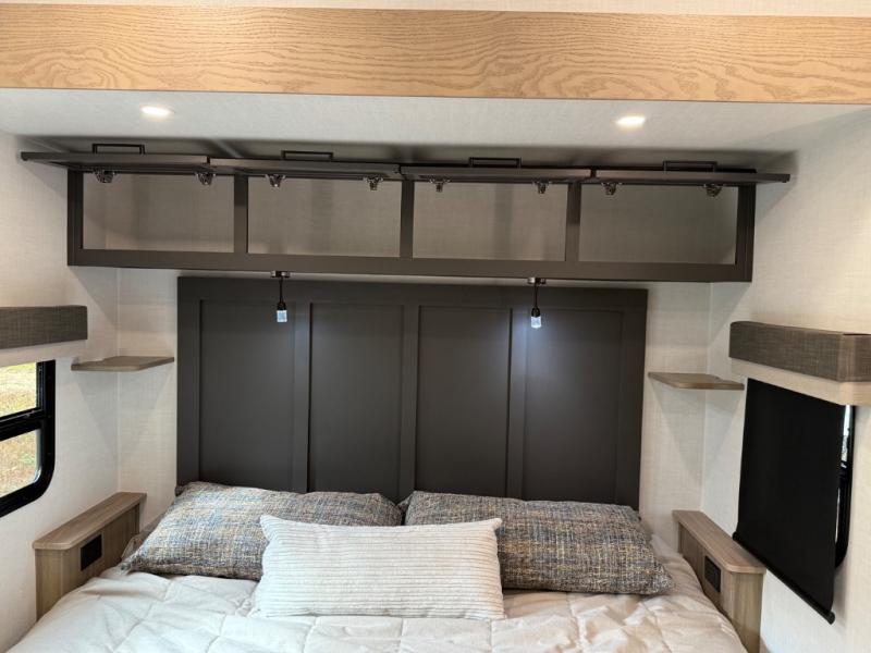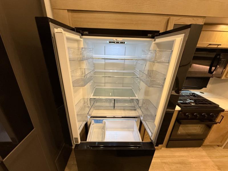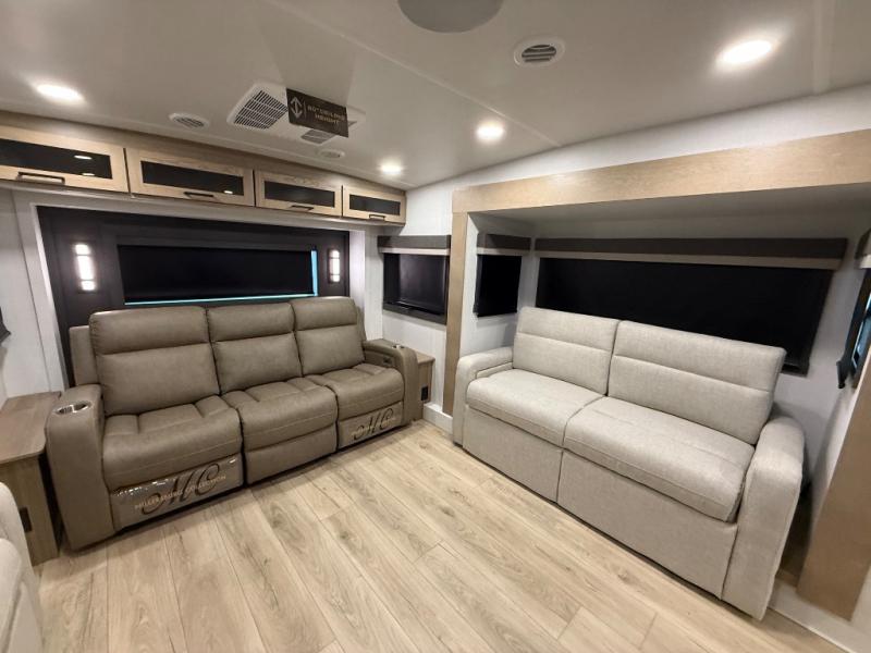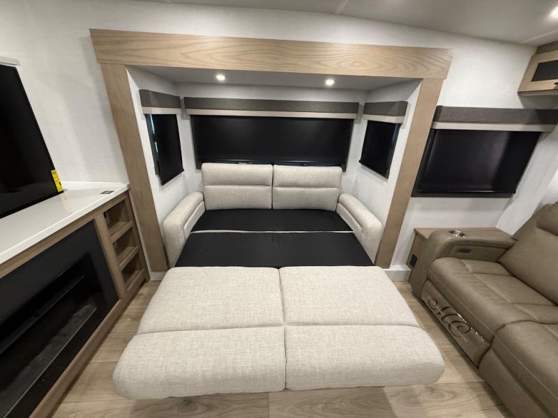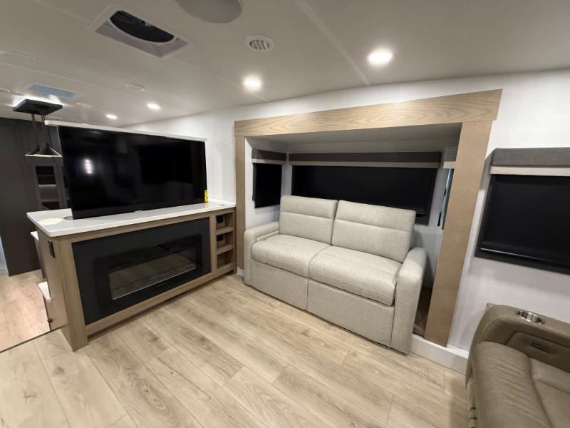 This stunning destination trailer takes upscale RV living to the next level with a spacious front living layout that feels more like a designer condo than a camper. Imagine kicking back in a bright, open lounge surrounded by panoramic windows, plush seating, and modern finishes that make every getaway feel special. Whether it’s a cozy movie night or hosting friends for a long weekend, the 402SFL delivers comfort and class in every corner.