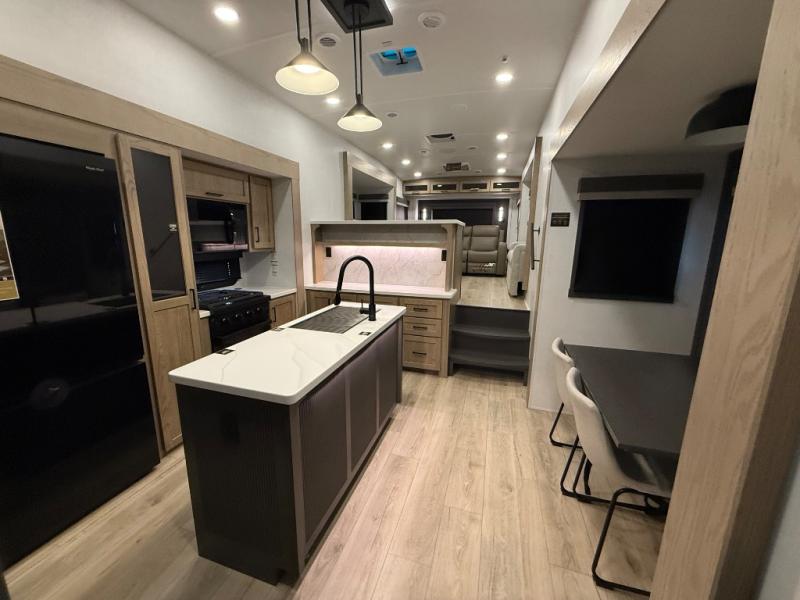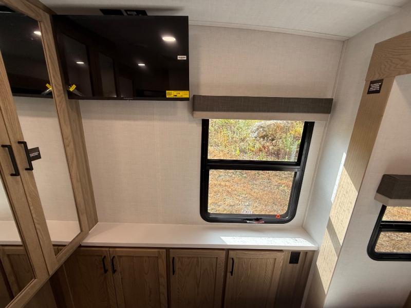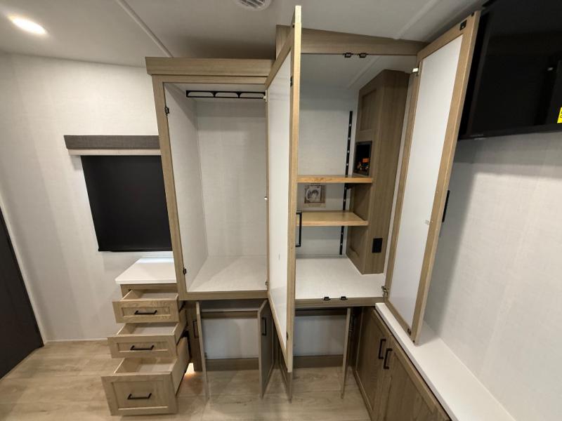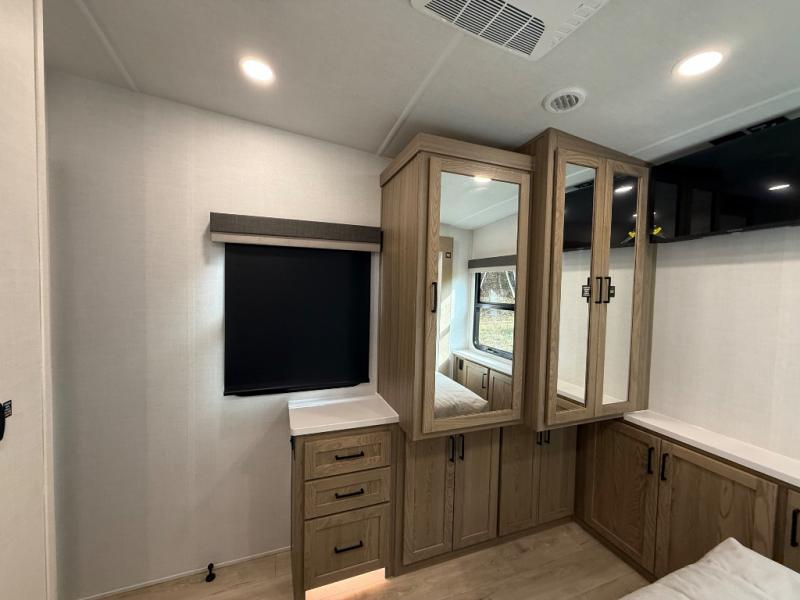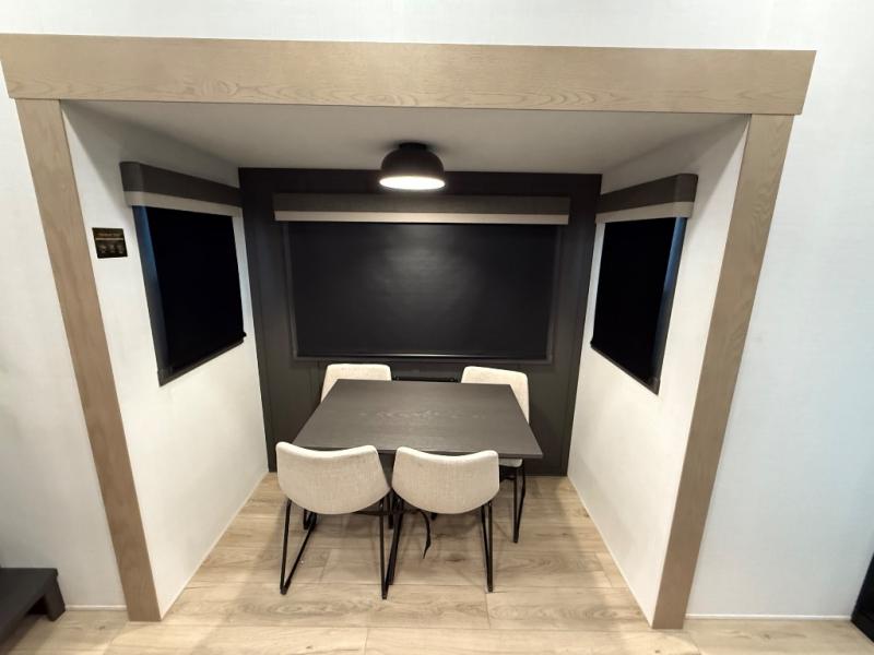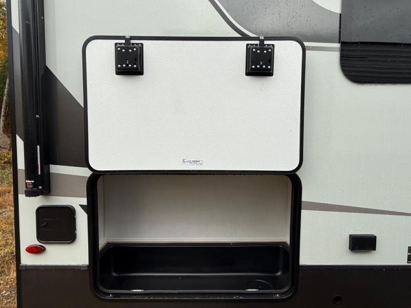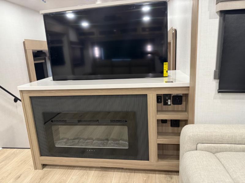 This fifth wheel is designed for comfort, connection, and relaxation on the road. The 72" x 80" king bed in the bedroom offers a spacious and restful retreat after a long day. Mealtime is a time to gather, and the rotating table with chairs creates the perfect setting to sit down, share stories, and reflect on the day’s adventures. For more laid-back evenings, the front living area features a Televator TV, turning the space into a cozy home theater for movie nights with the whole crew. When it’s time to wind down, two 68" hide-a-beds provide additional sleeping space, ensuring everyone has a comfortable place to rest.