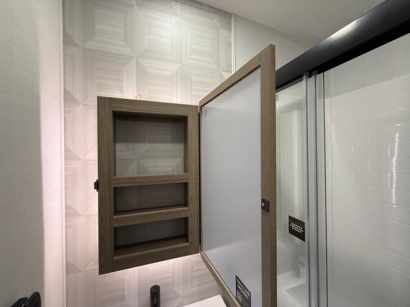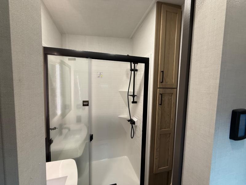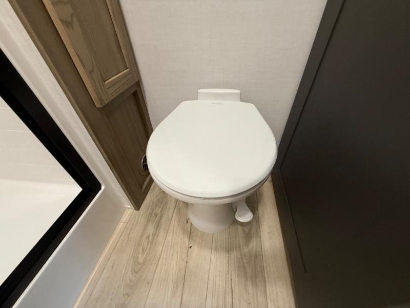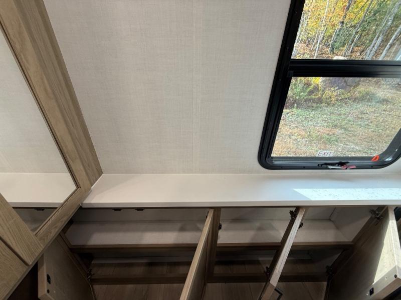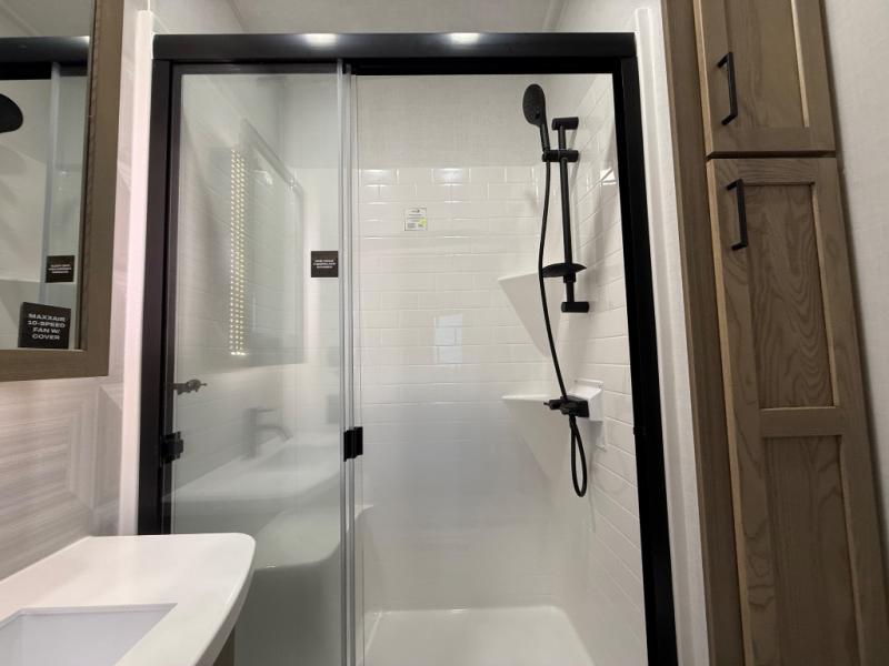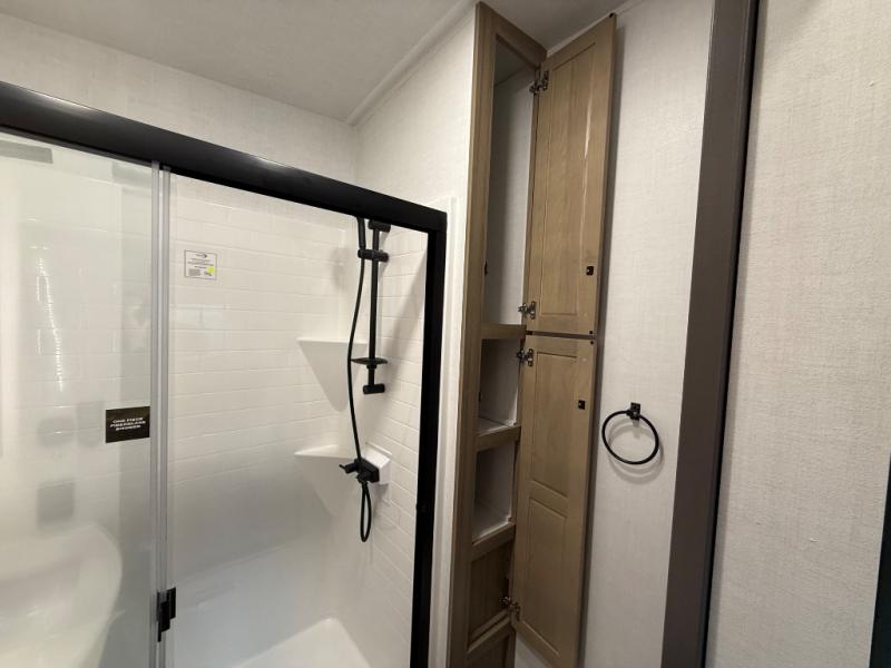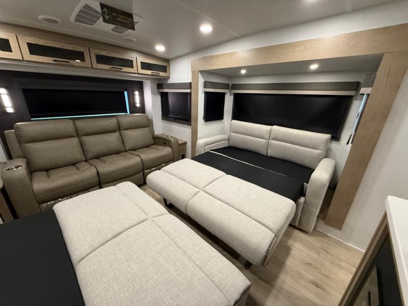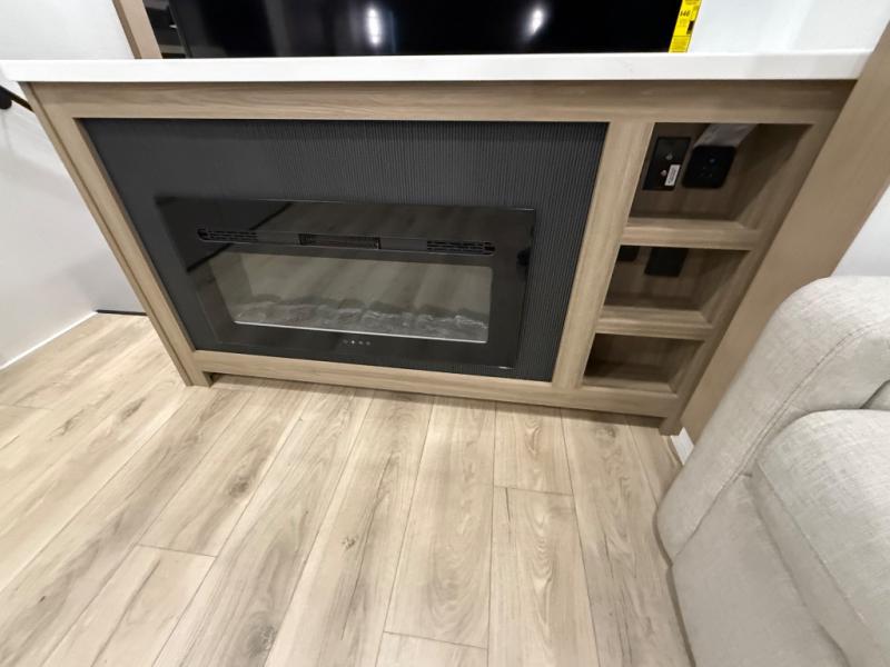 This fifth wheel is designed for comfort, connection, and relaxation on the road. The 72" x 80" king bed in the bedroom offers a spacious and restful retreat after a long day. Mealtime is a time to gather, and the rotating table with chairs creates the perfect setting to sit down, share stories, and reflect on the day’s adventures. For more laid-back evenings, the front living area features a Televator TV, turning the space into a cozy home theater for movie nights with the whole crew. When it’s time to wind down, two 68" hide-a-beds provide additional sleeping space, ensuring everyone has a comfortable place to rest.
